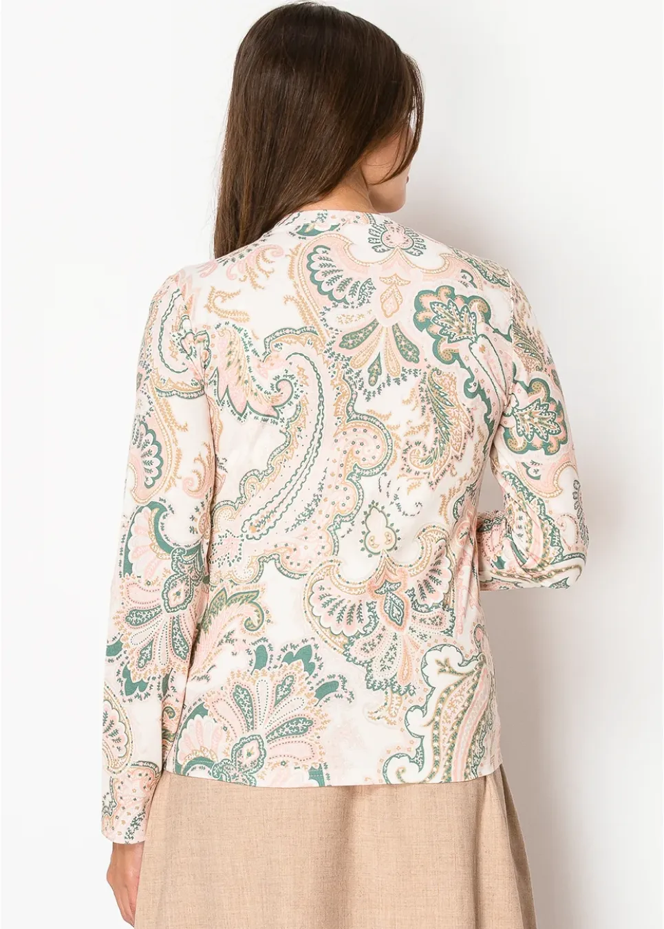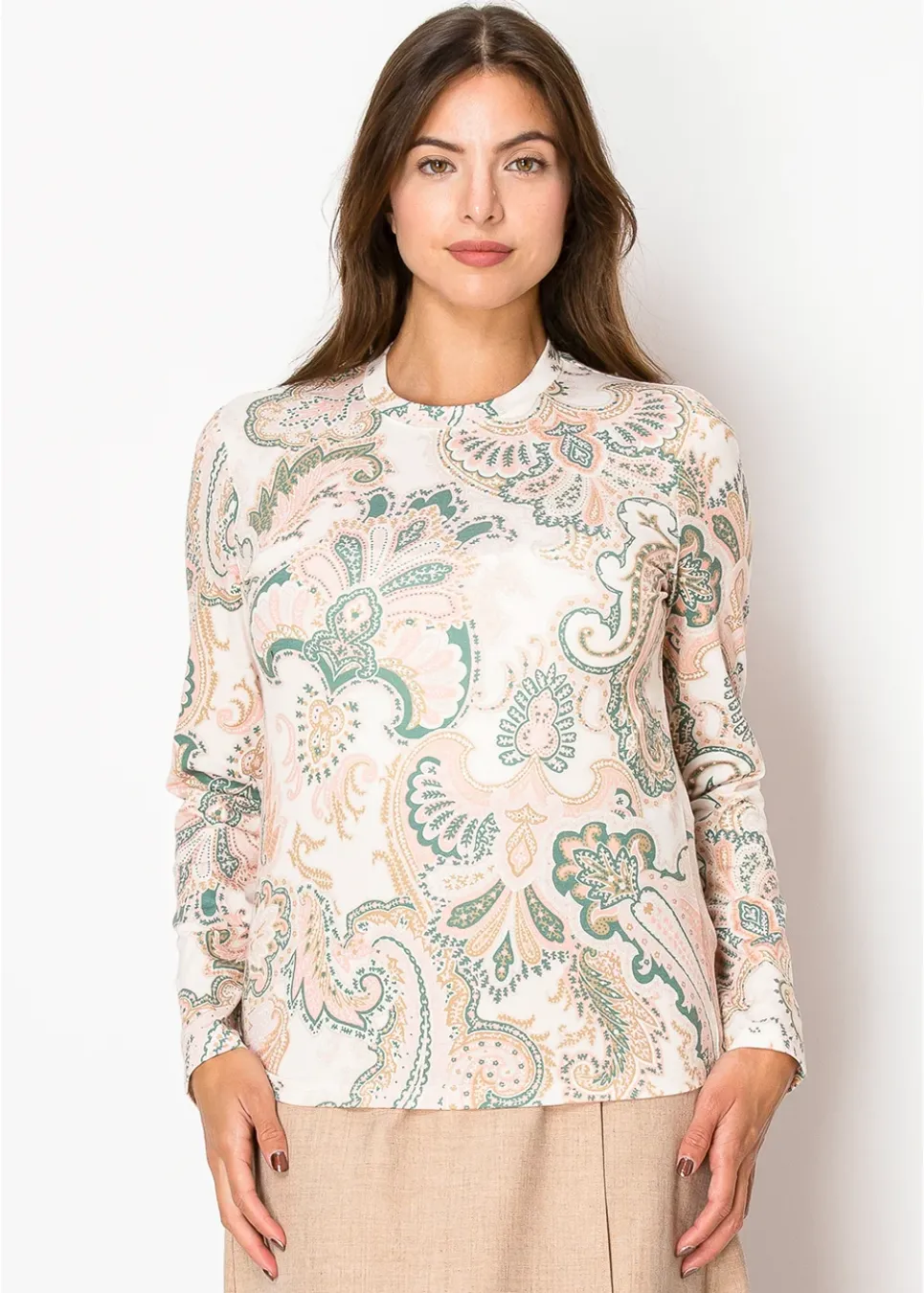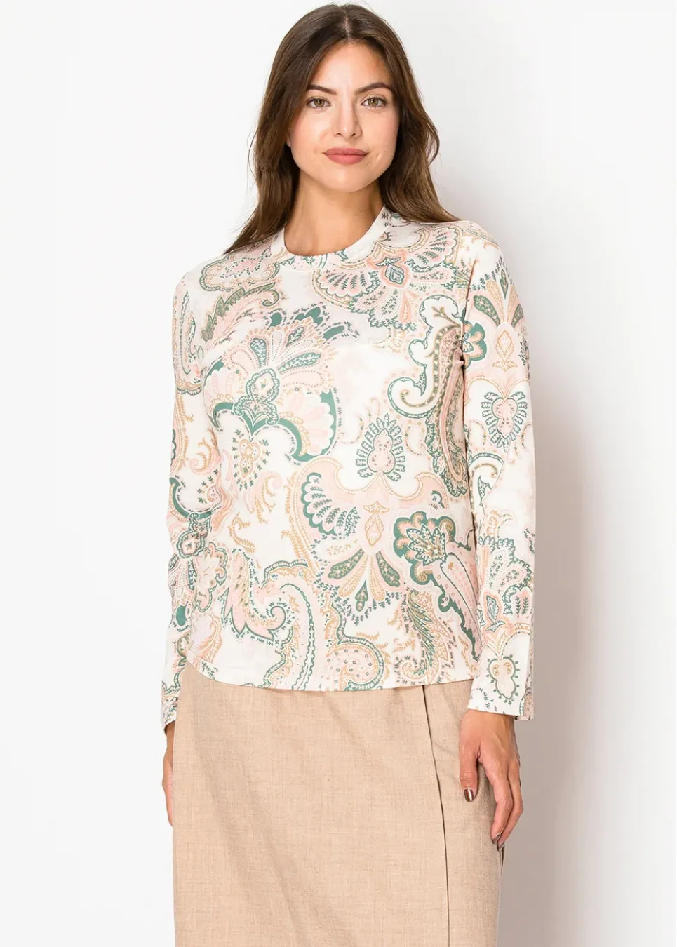 A delicate mix of pink and green paisley patterns adorn this top, creating a timeless and graceful look. With its soft fabric and relaxed fit, it’s an easy choice for casual outings or a polished everyday style.