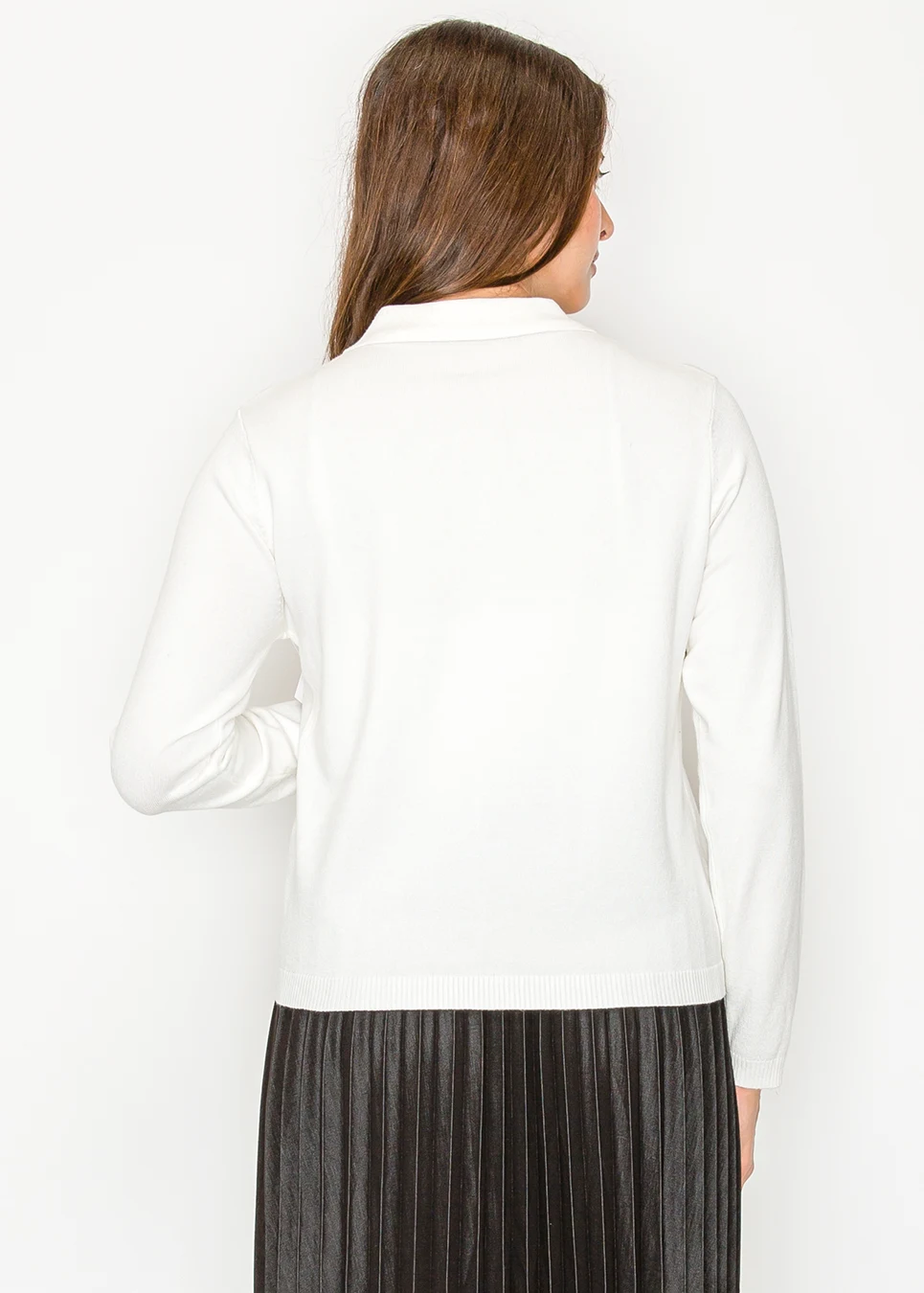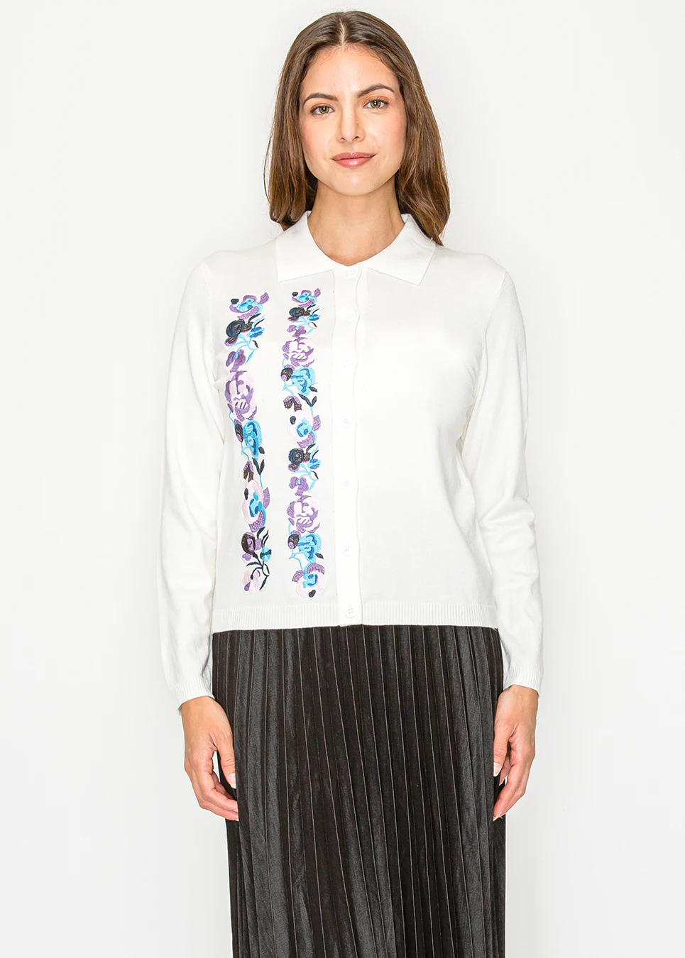 A button-front knit with a tailored collar and ribbed hem for a neat finish. The lilac and blue floral stitching brings soft contrast against the clean ivory base.