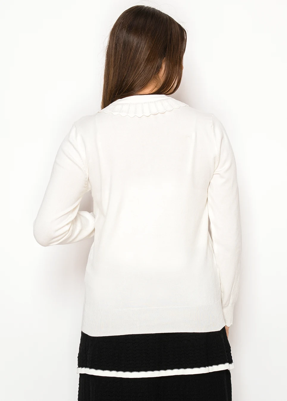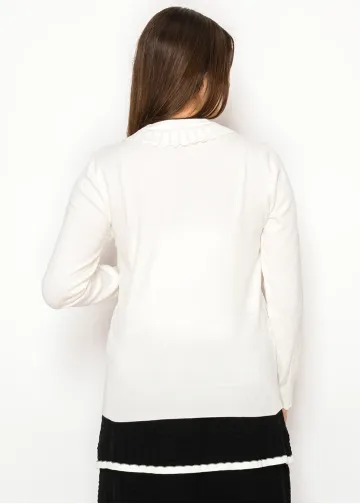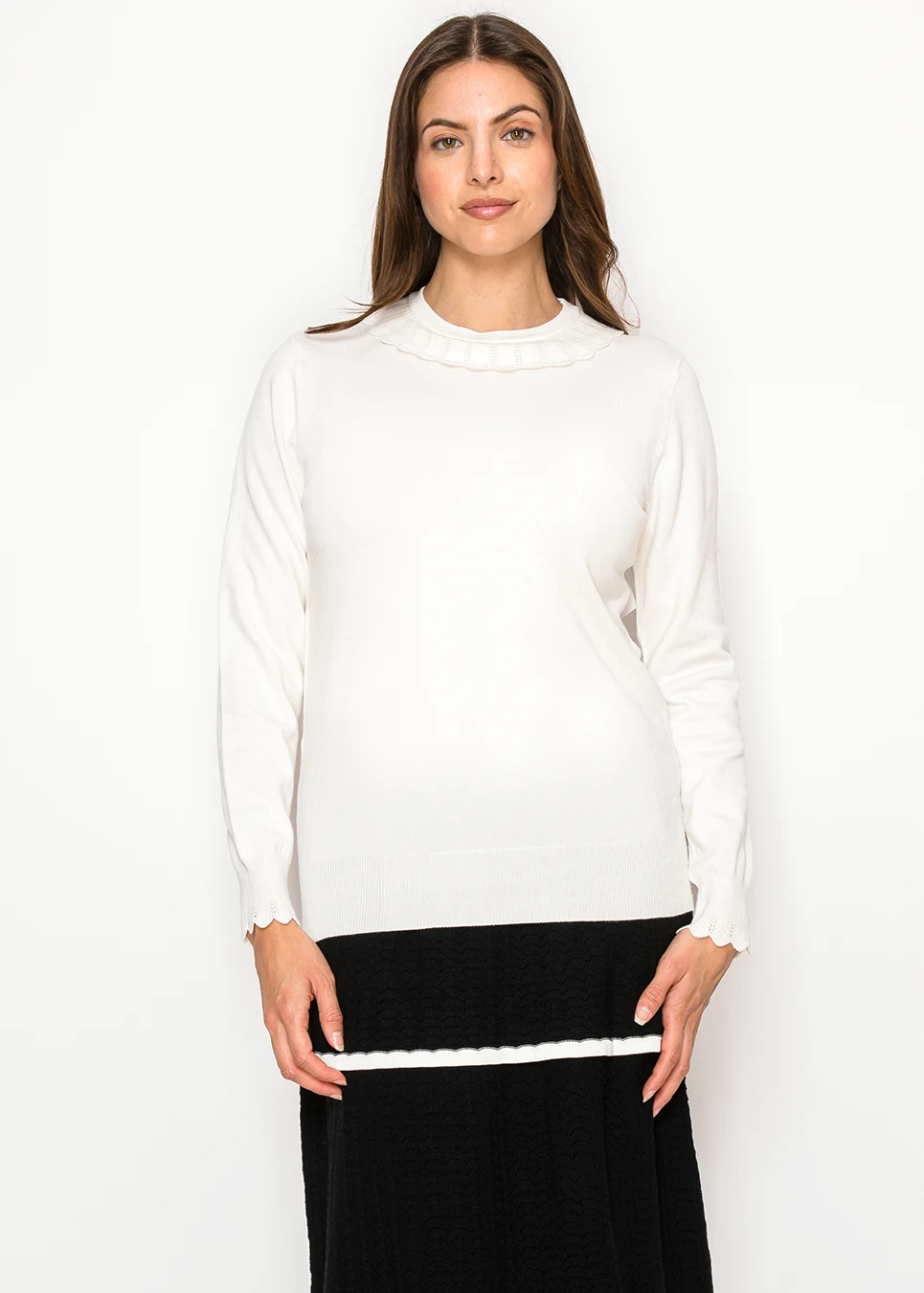 Soft White Knit Sweater with Scallop Trim