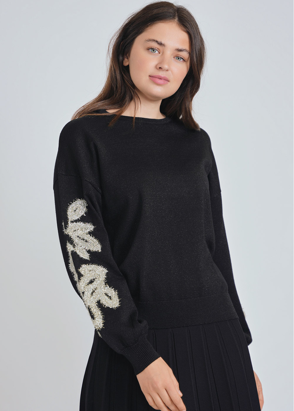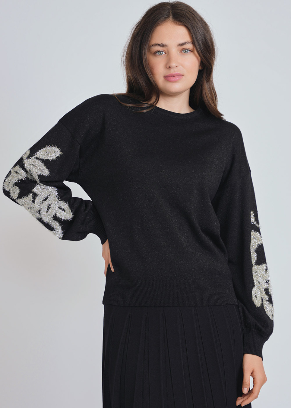 Crew neck sweater with draped lurex sleeves