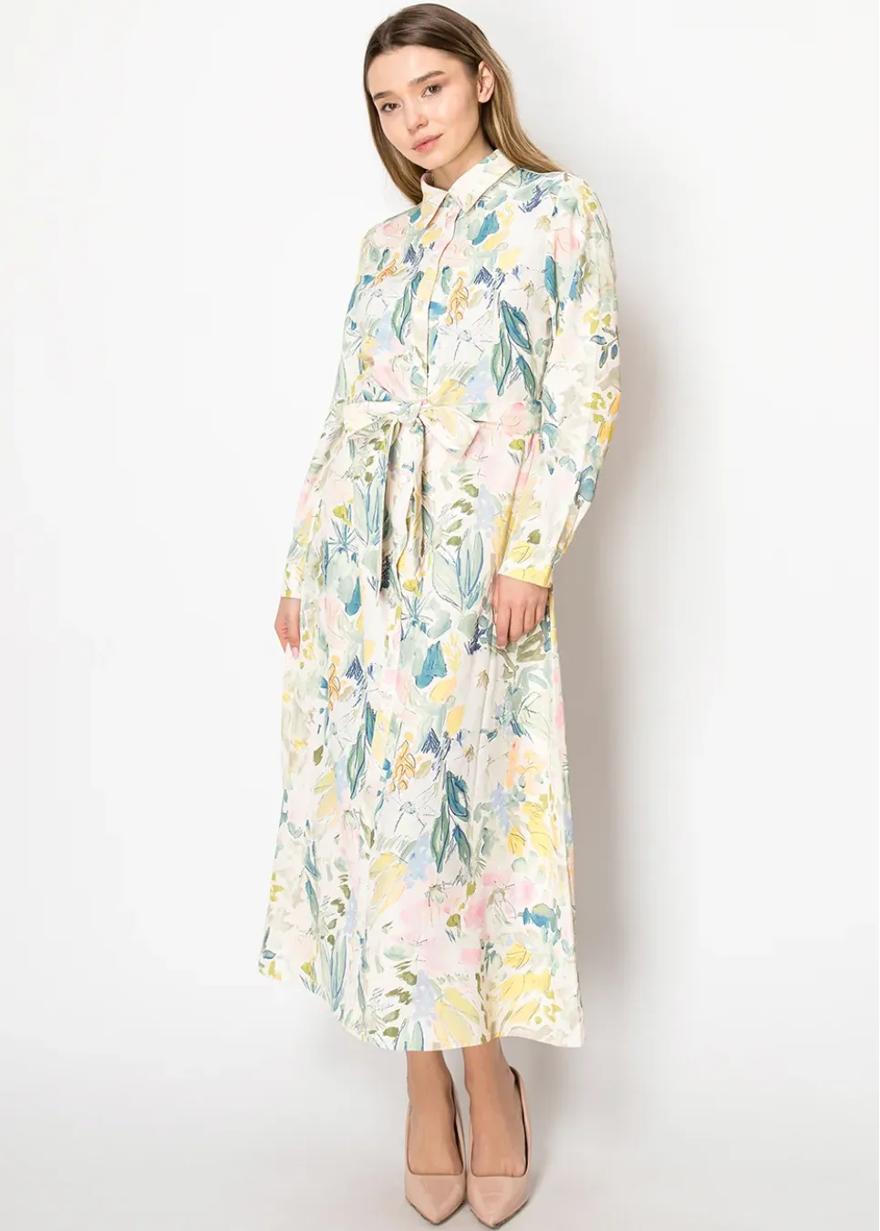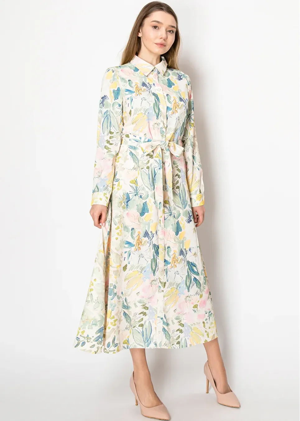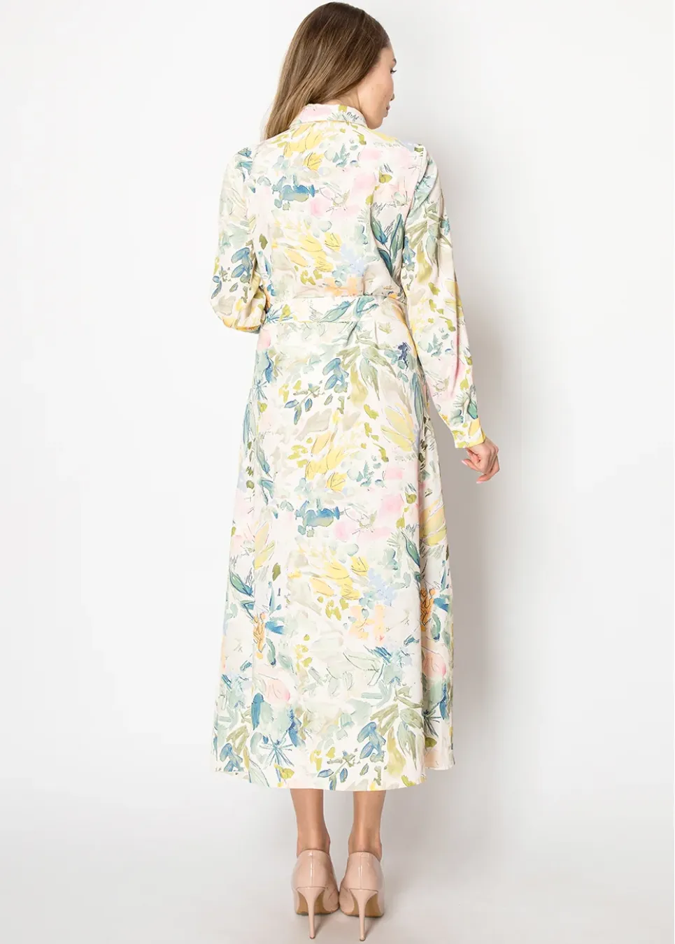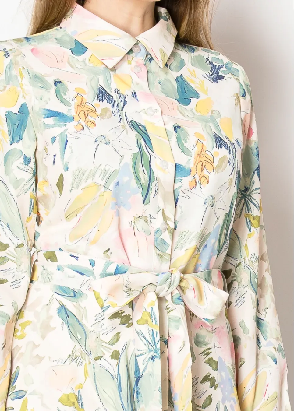 Bring the season to life with this soft floral dress in cheerful pastel tones. Its flowing fabric and adjustable belt make it versatile for any occasion, whether casual or dressy.