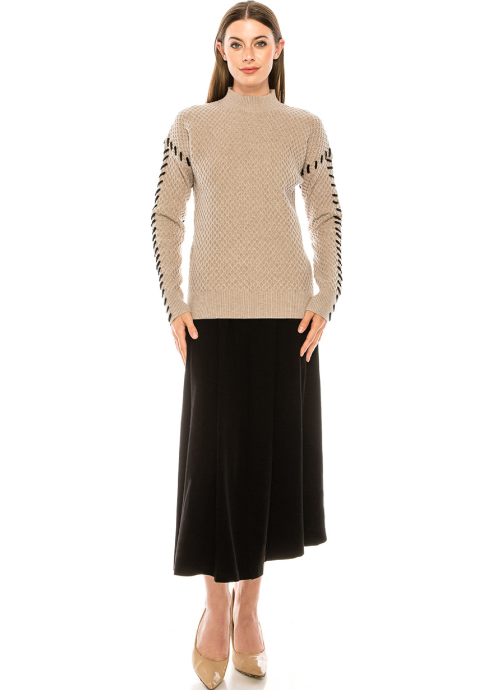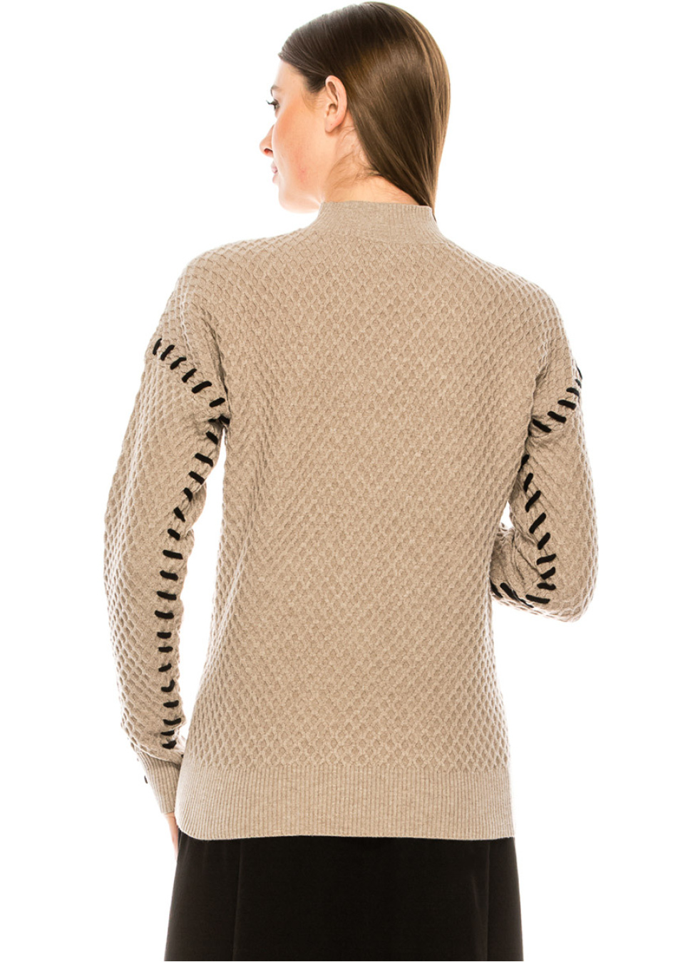 This chunky sweater is designed with a relaxed fit. Also, it comes with long sleeves and a stand-up collar. The item is knitted with a unique technique that creates a waffle texture for a cozy feeling. Contrast stitches on the sleeves are a nice design detail.