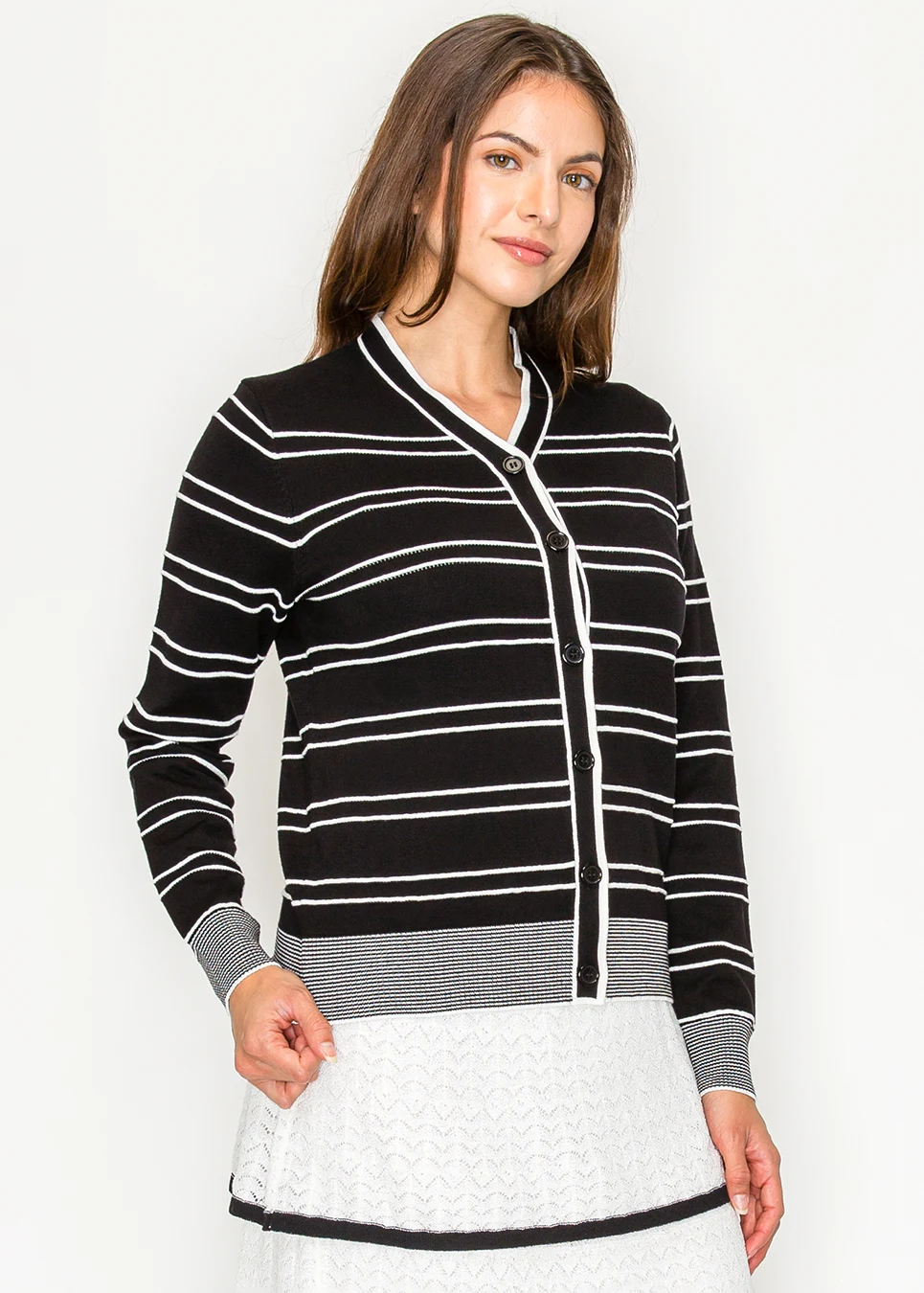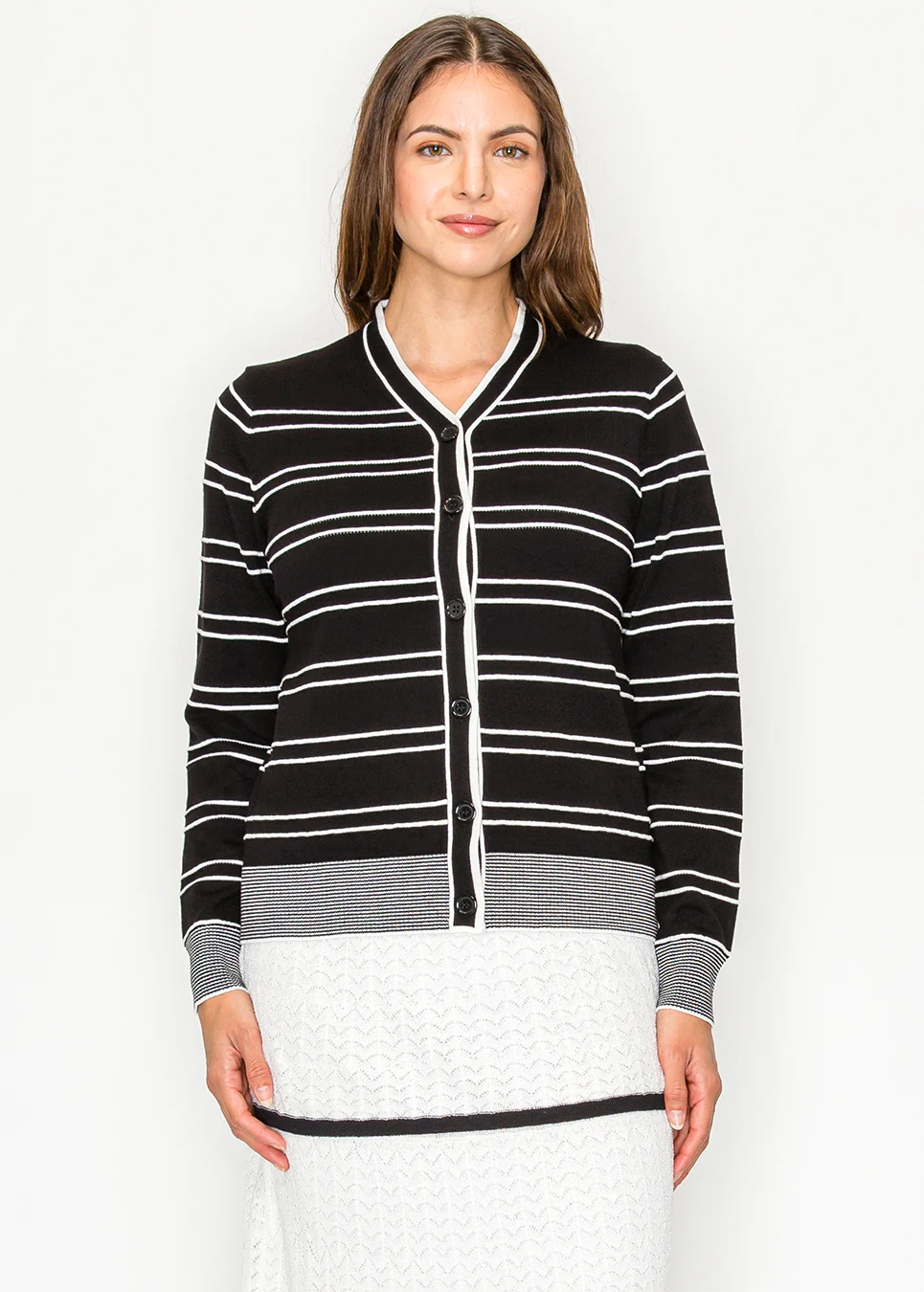 The cardigan that's been in every well-dressed woman's wardrobe for decades — just done better. Crisp white stripes on black, V-neck that sits right, buttons that actually line up cleanly. Lightweight enough to layer, structured enough to wear on its own. Works over a white blouse, a dress, a lace skirt. All of the above.