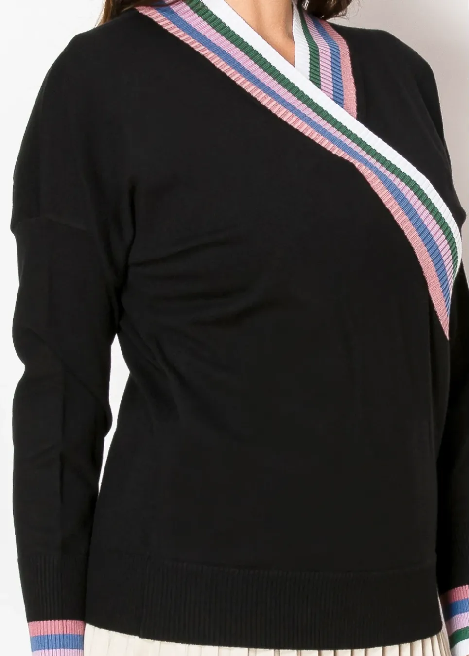 This sweater is all about balance—classic black with a pop of color. The striped ribbed trim adds structure and contrast, making it a perfect go-to for an effortless, pulled-together outfit.