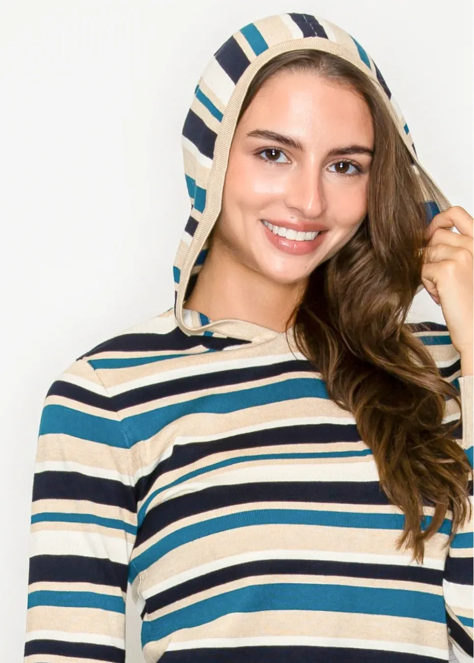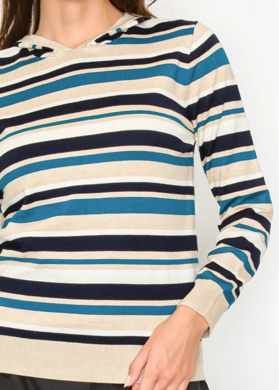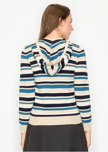 Lightweight knit hoodie with bold stripes in blue, beige, and navy. A casual, easy layer for relaxed days and effortless style.