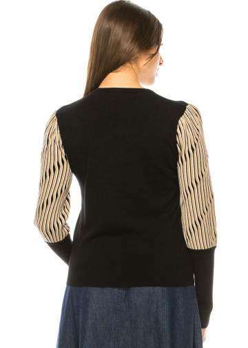 Our black sweater with fashionable leg-of-mutton sleeves in a stylish striped pattern and ribbed cuffs is a must-have for any modest fashion collection. The high-quality fabric and classic design make it a versatile choice for any occasion, while the statement sleeves add a touch of interest and individuality to your look.