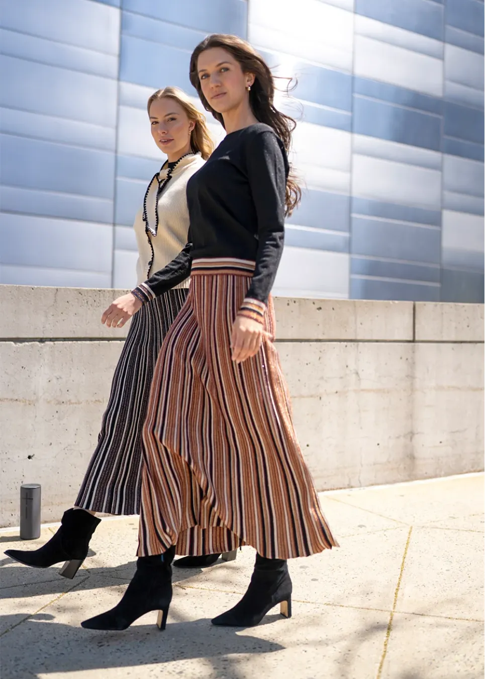 Vertical metallic stripes in warm burgundy tones bring energy and length to the silhouette. The black knit top grounds the look with sleek contrast.