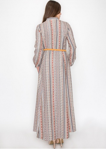 Stand out in this multicolored striped dress that’s as comfortable as it is eye-catching. The earthy hues in the stripe pattern bring a touch of warmth, while the lightweight fabric offers movement and flow. The belted waist allows for a custom fit, and the long sleeves ensure a modest, polished look.
