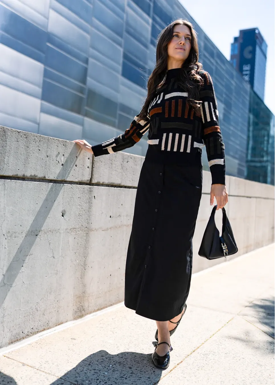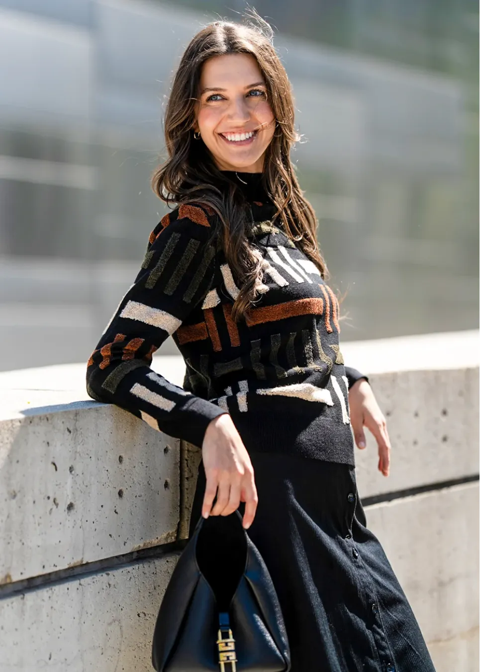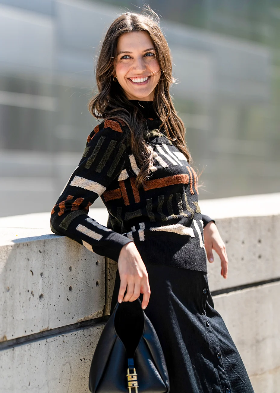 A confident outfit built on contrast — soft knit texture against a sculpted skirt. Tailored enough for the office, relaxed enough for weekends.