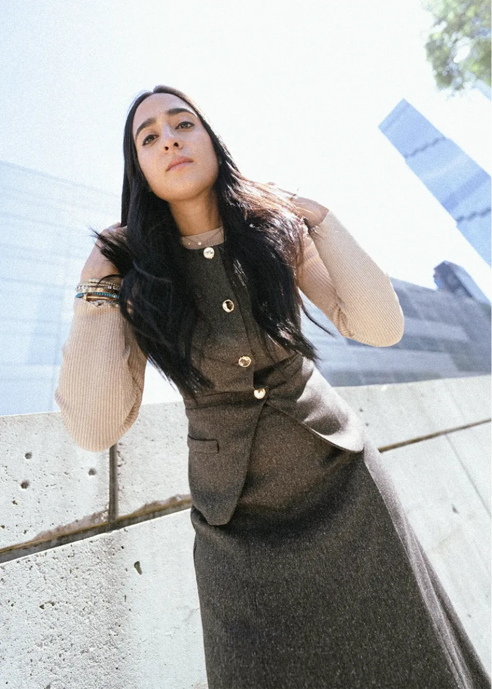 Tweed-inspired textures meet knit comfort. The structured vest with metallic buttons gives this set a polished, on-trend edge.