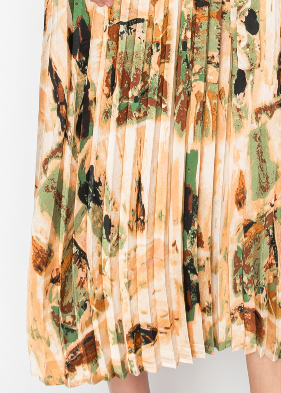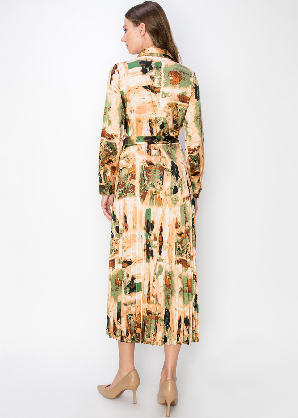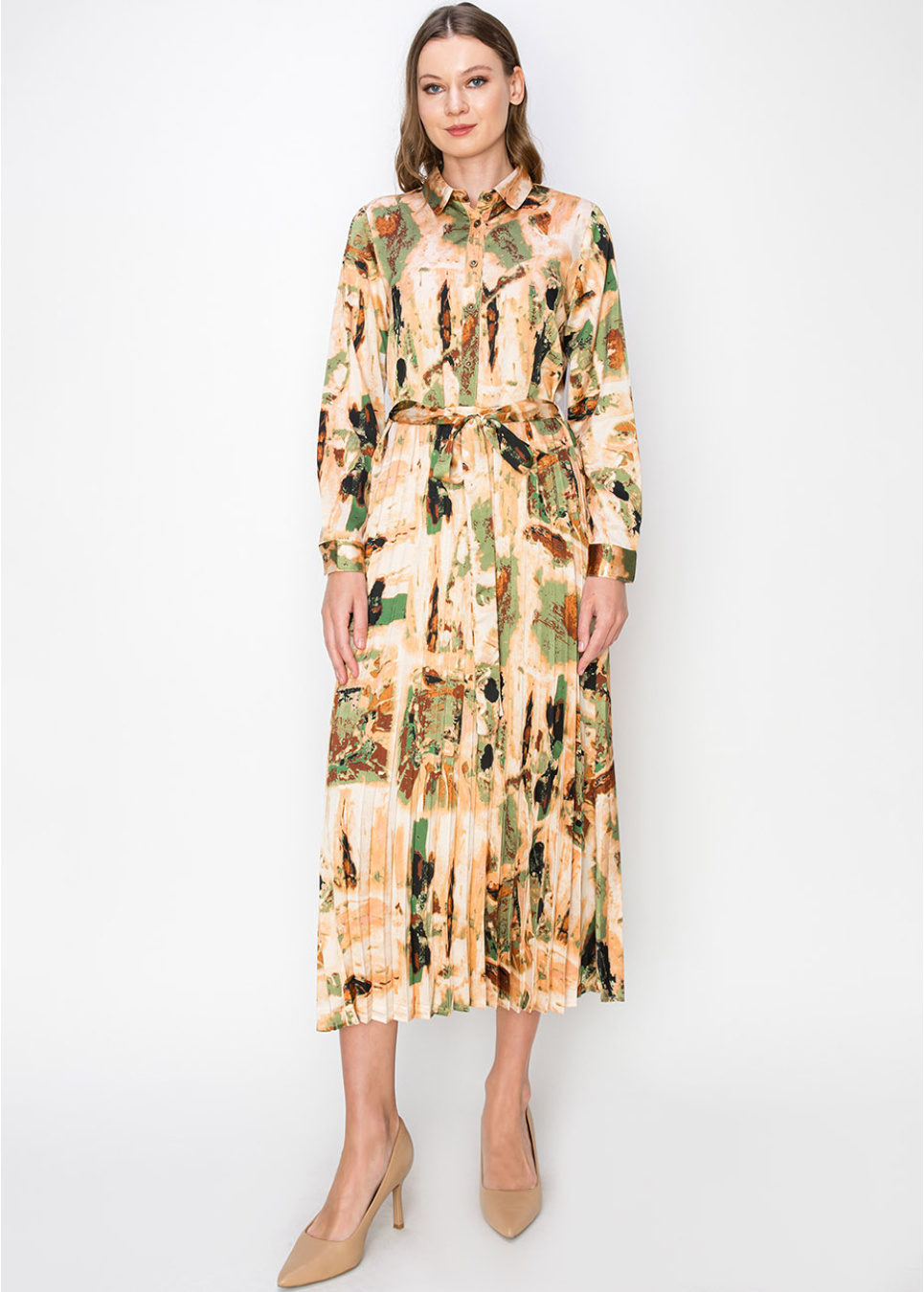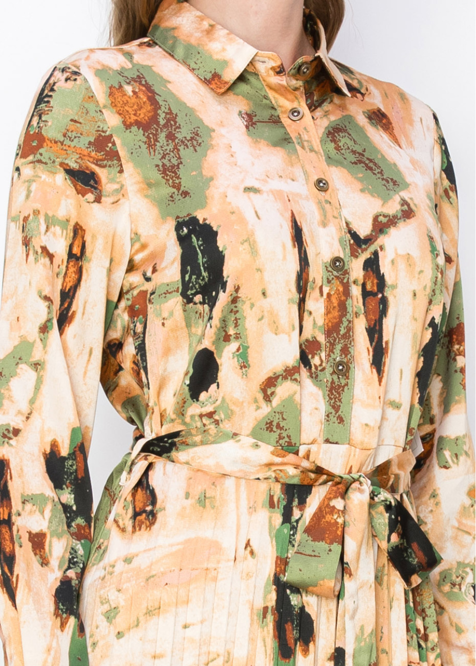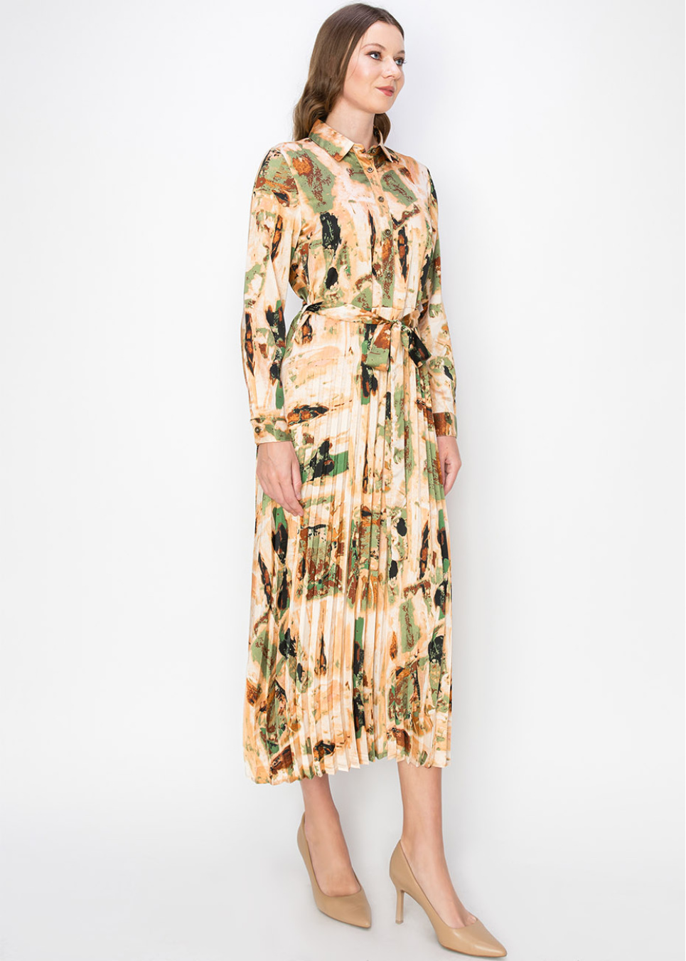 The warm, earthy tones in this pleated dress bring to mind a sunset, with soft oranges, greens, and browns blending in a unique abstract print. The tie waist offers a flattering fit, and the button-down front keeps it classic. Modest and stylish, this dress is perfect for any event where comfort and elegance meet.