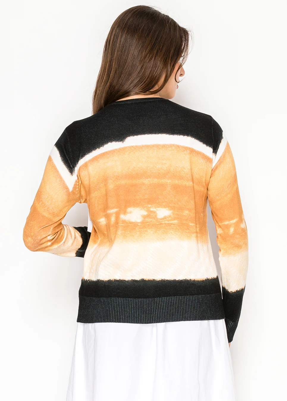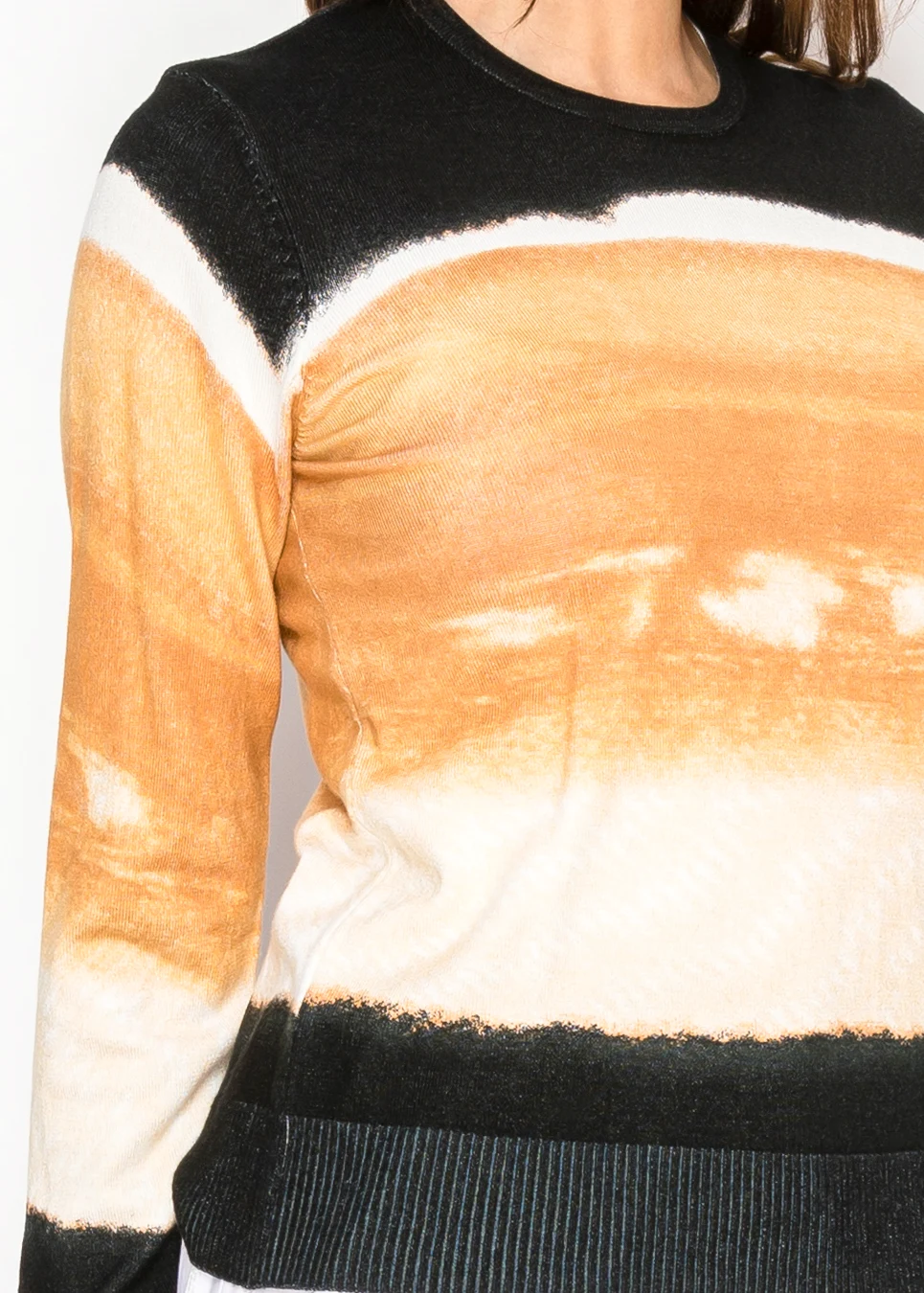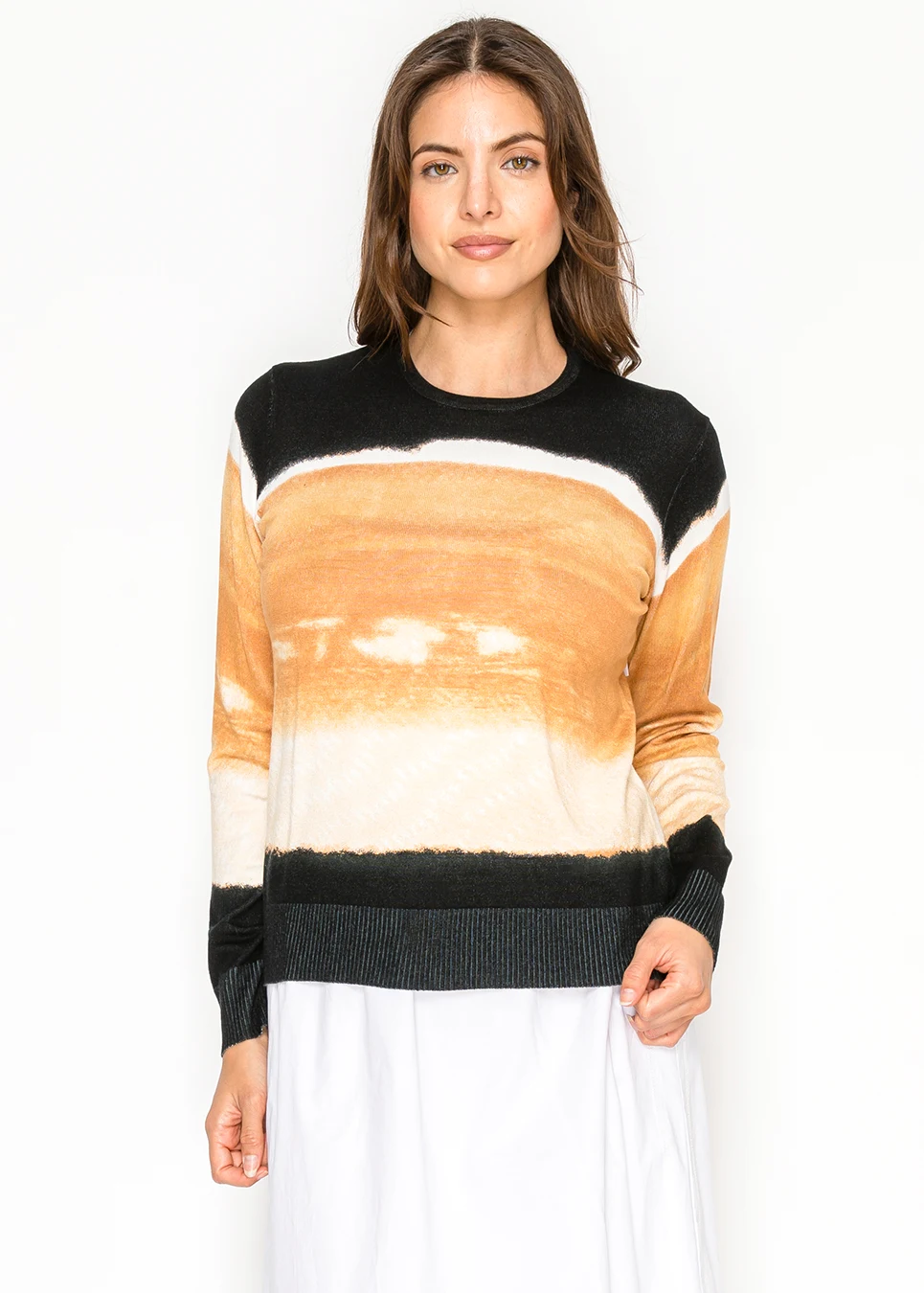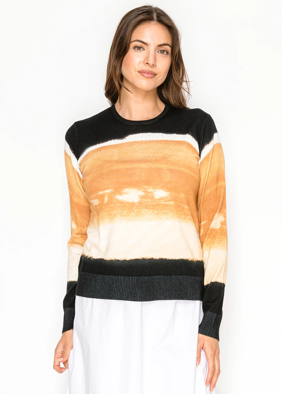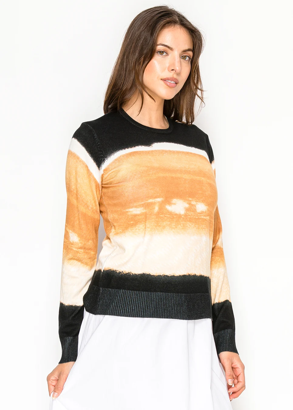 A long sleeve camel ombre knit sweater finished with black ribbed trim at the neckline, cuffs, and hem. The smooth viscose blend offers breathable comfort with a clean, structured silhouette.