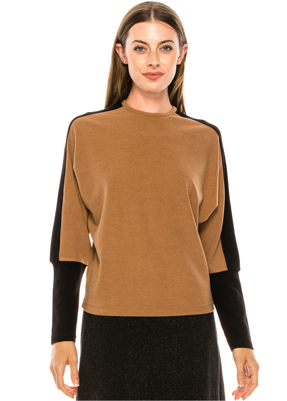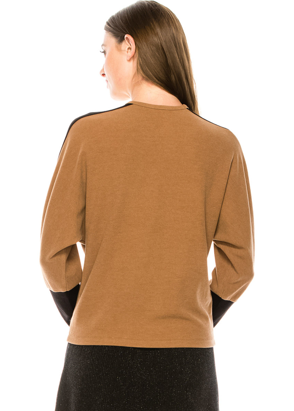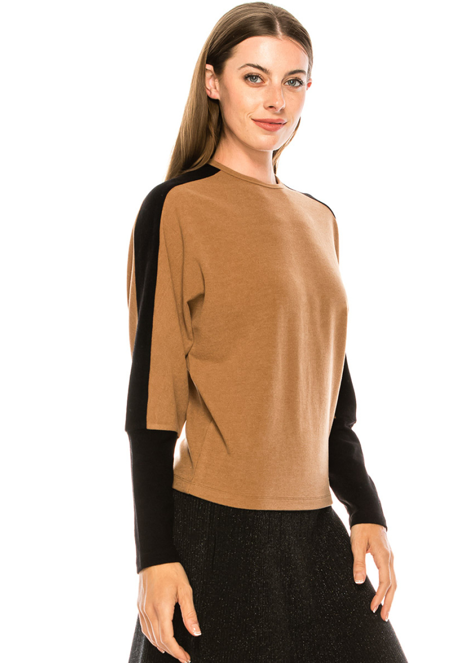 Femininity for every day! You can style this T-shirt in many styles, depending on your mood. It is comfortable to wear and versatile to combine. The beautiful details, such as color blocks (camel/black) and high cuffs on the sleeves, make it a comfortable alternative to blouses.