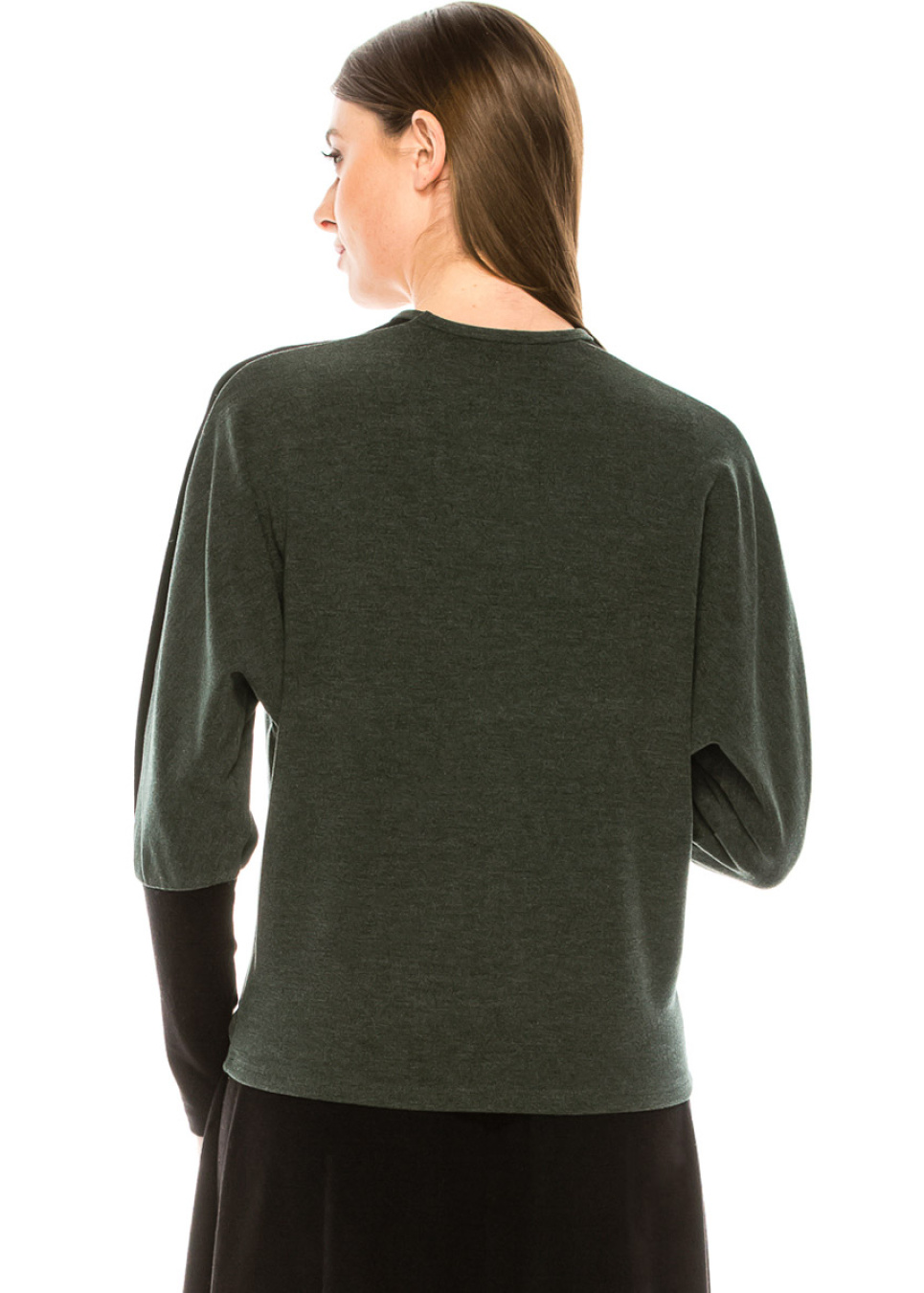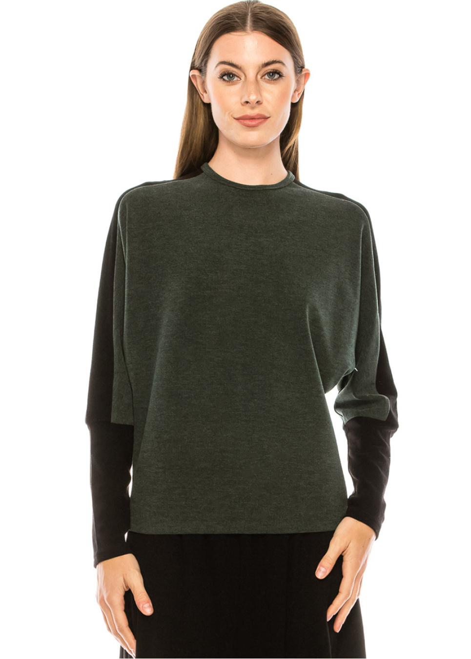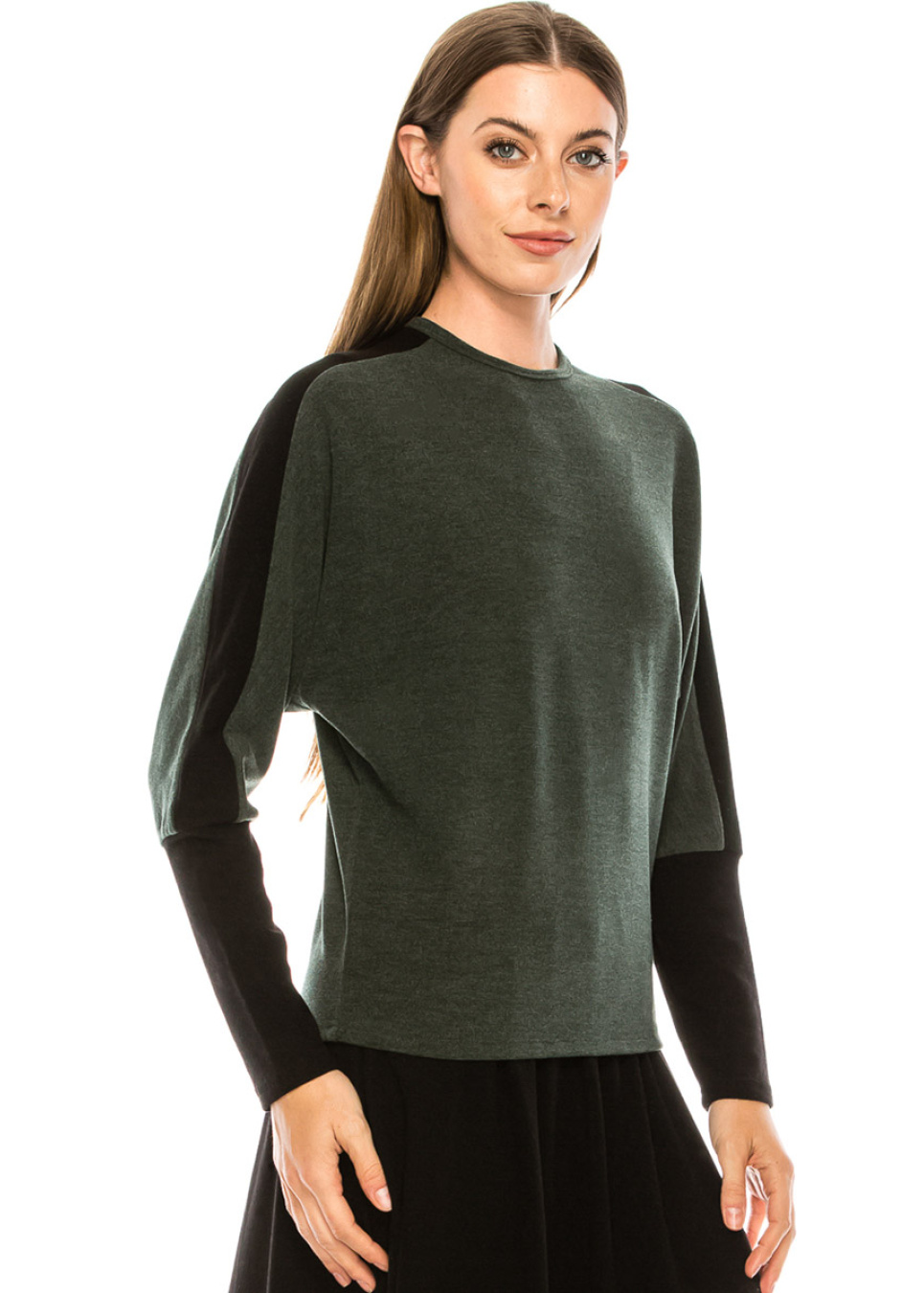 Femininity for every day! You can style this T-shirt in many styles, depending on your mood. It is comfortable to wear and versatile to combine. The beautiful details, such as color blocks (olive/black) and high cuffs on the sleeves, make it a comfortable alternative to blouses.