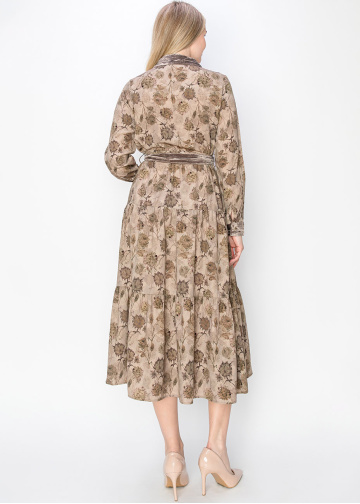 Step into a serene garden with this lovely taupe midi dress, featuring a delicate floral print. The button-down front and belted waist create a flattering silhouette, while the long sleeves offer the perfect balance of style and modesty.