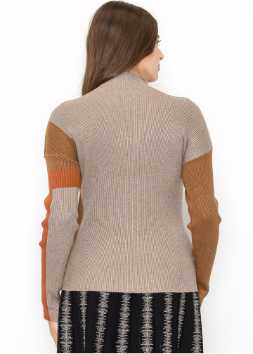 This sweater blends a modern color block design with neutral shades of taupe and caramel, accented by rust details. The ribbed texture adds depth, while the long sleeves and high neckline provide perfect coverage for any occasion. It’s versatile enough for a casual day out or a cozy evening in.