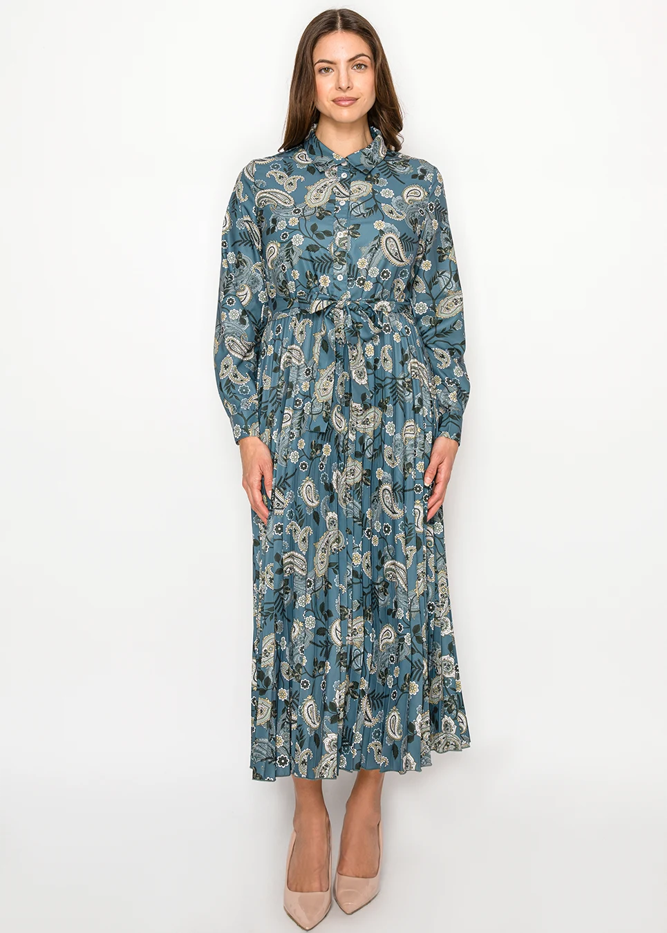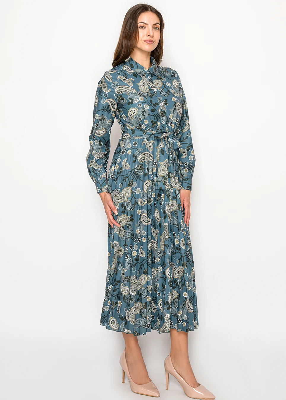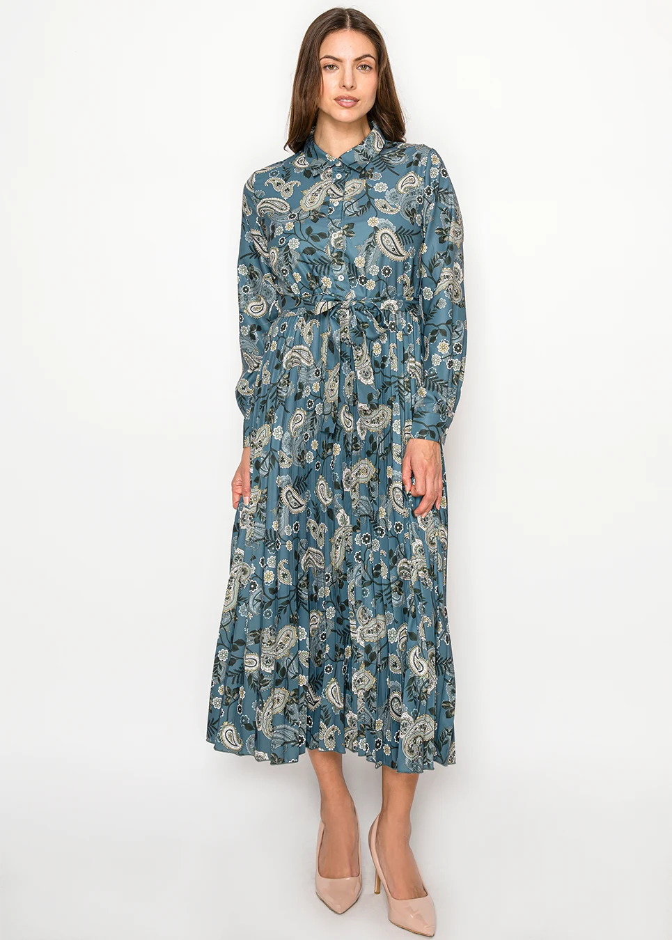 The teal color makes this one stand out in the best way. The paisley print adds depth without feeling busy, and the belt lets you adjust the shape. It feels put together but still easy.