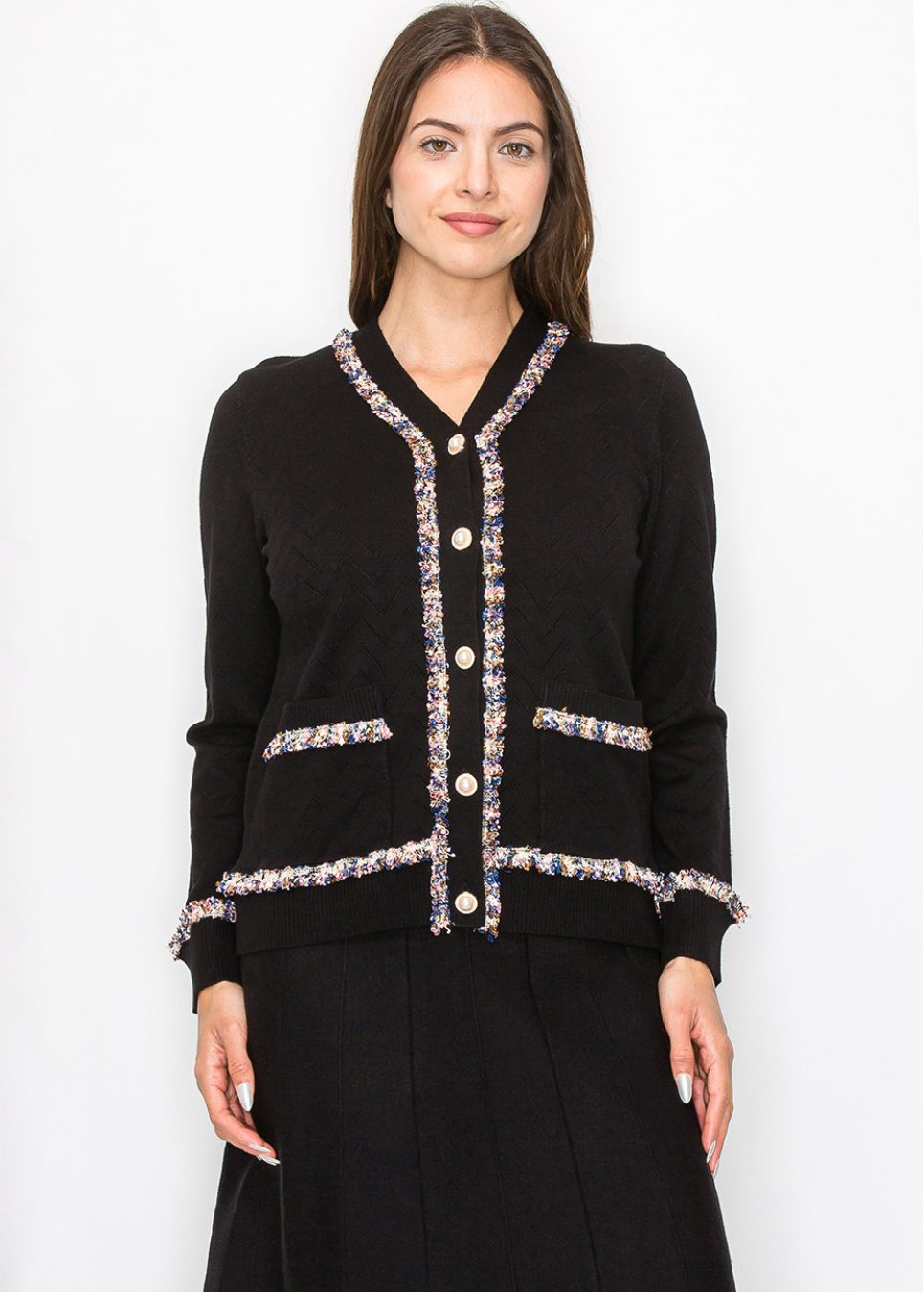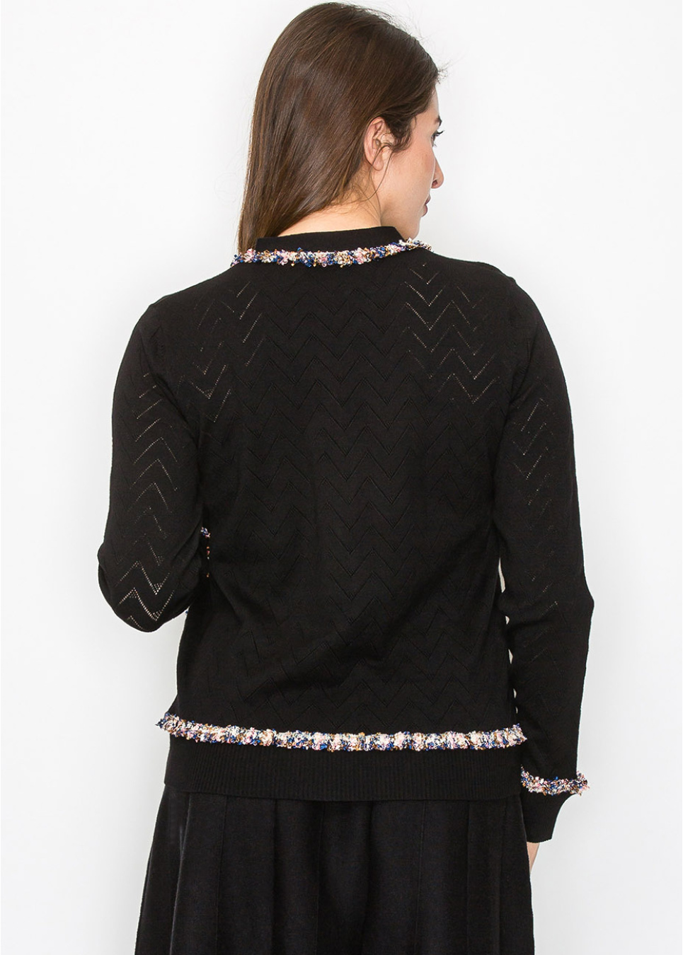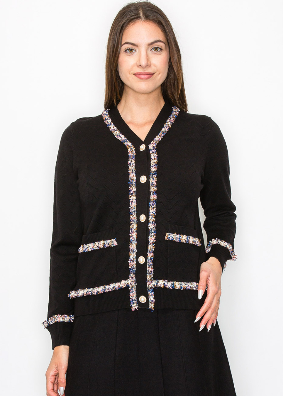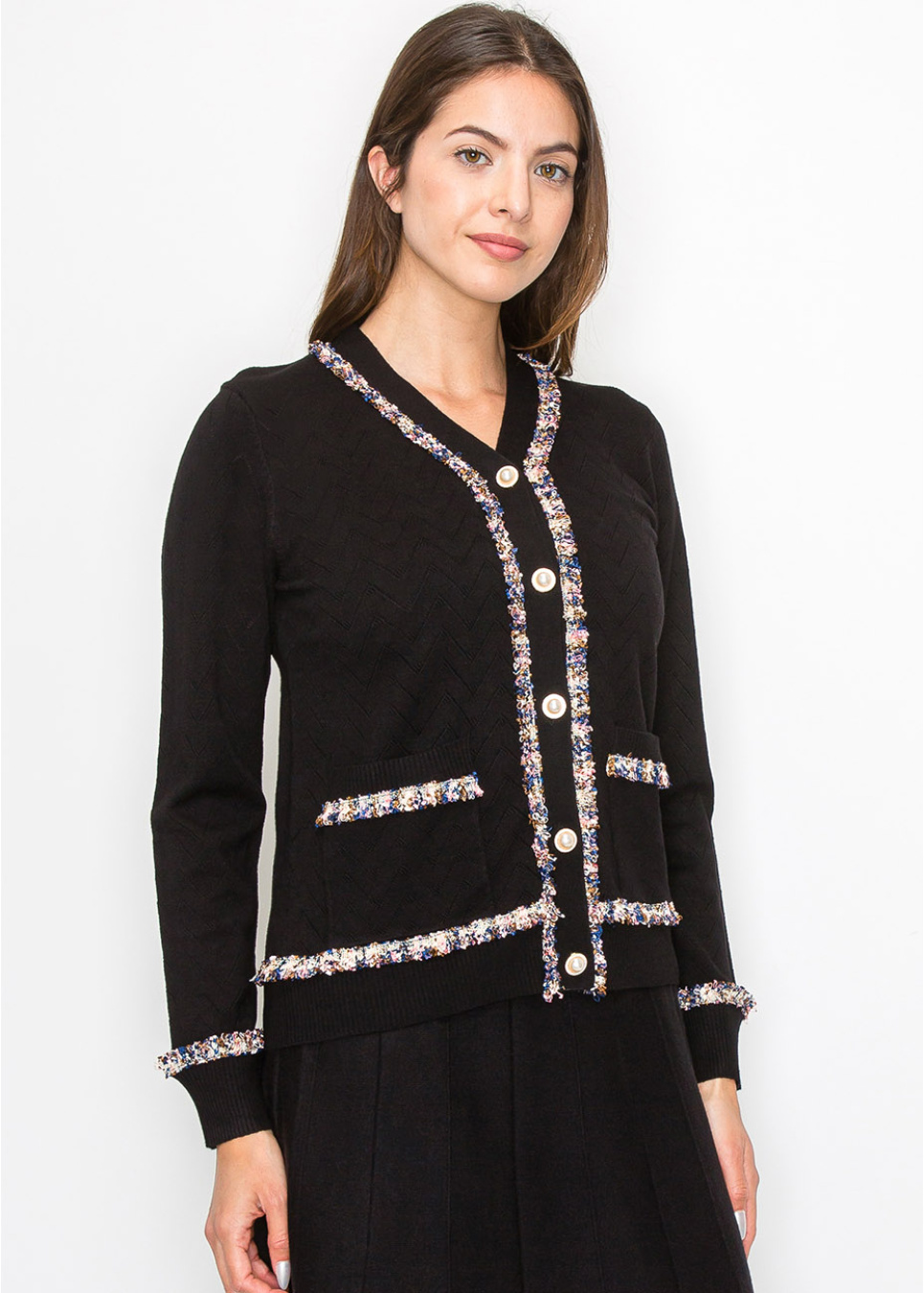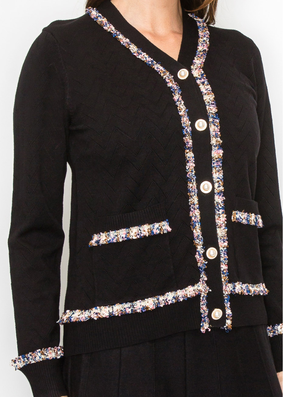 This textured black cardigan is a sophisticated staple with a playful twist. The soft knit features a subtle chevron pattern, while the multi-color trim along the neckline, front, and pockets adds a touch of flair.