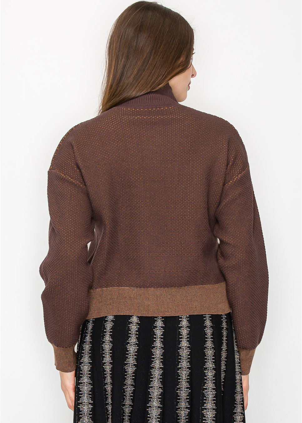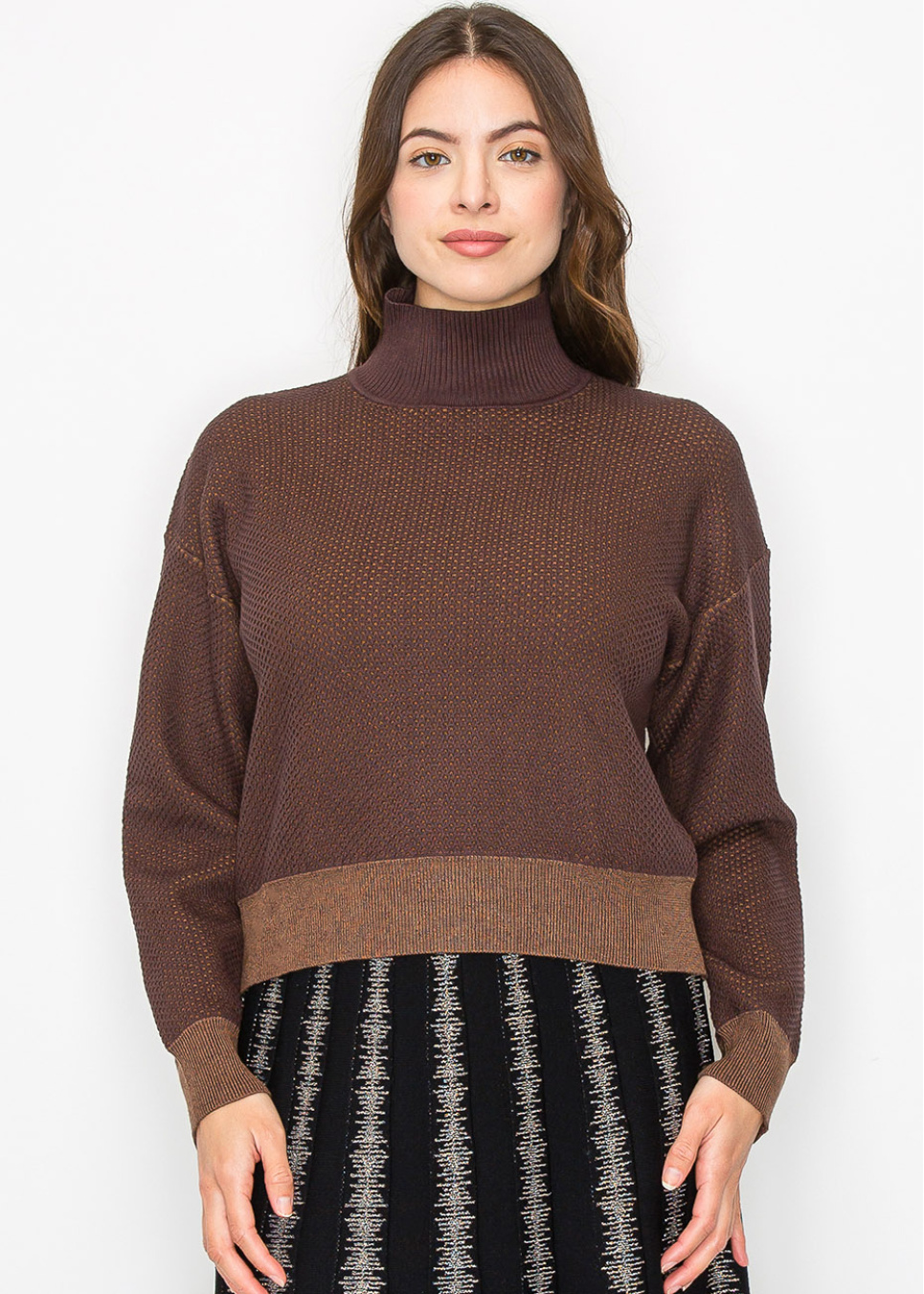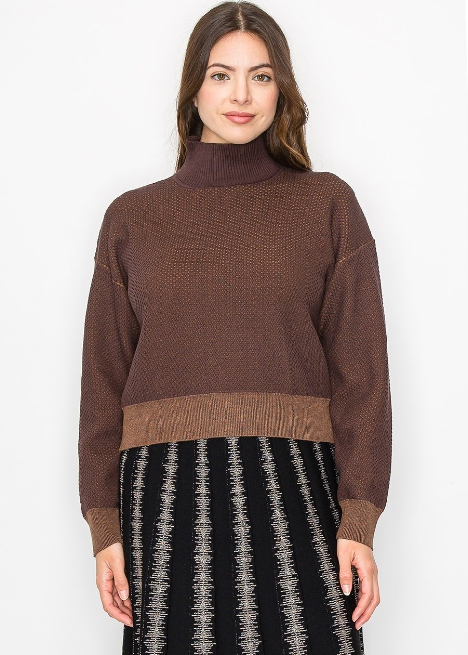 Add a touch of texture to your outfit with this brown mock neck sweater. The subtle knit pattern and warm color make it a versatile piece for layering, keeping you both stylish and comfortable throughout the colder months.