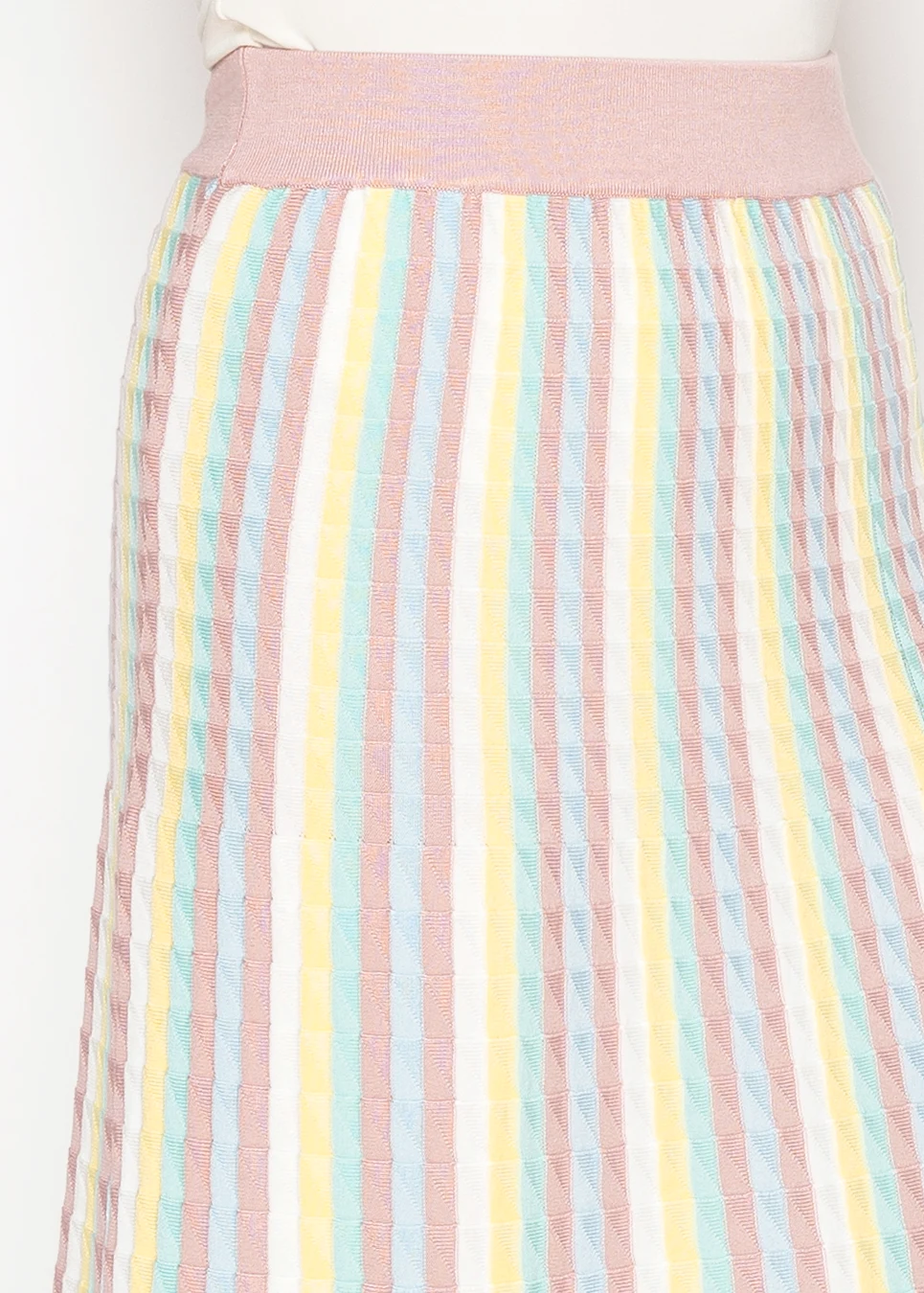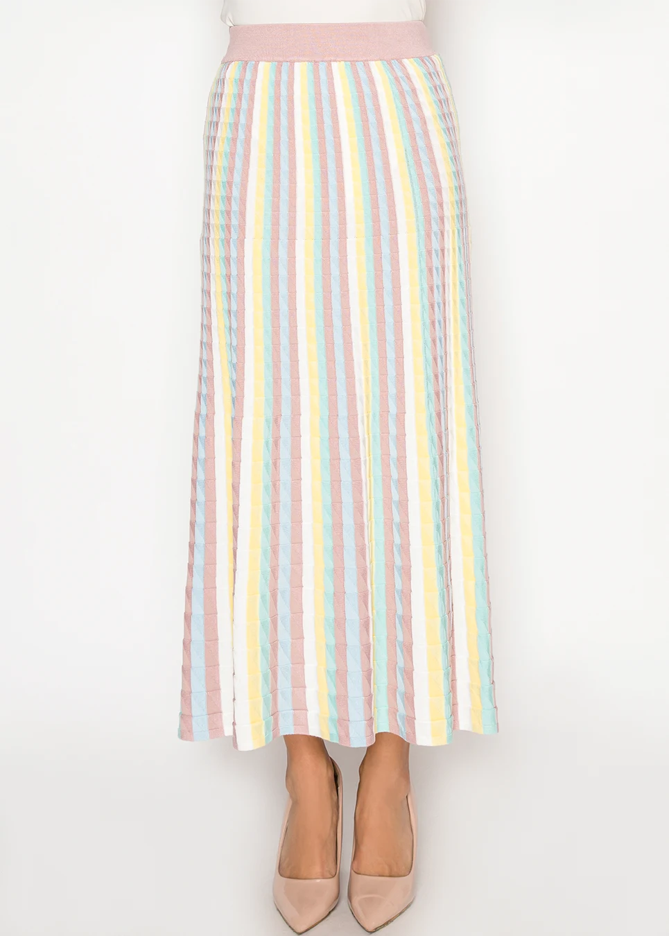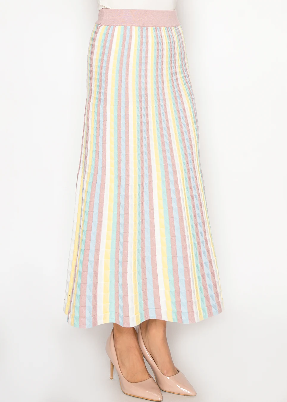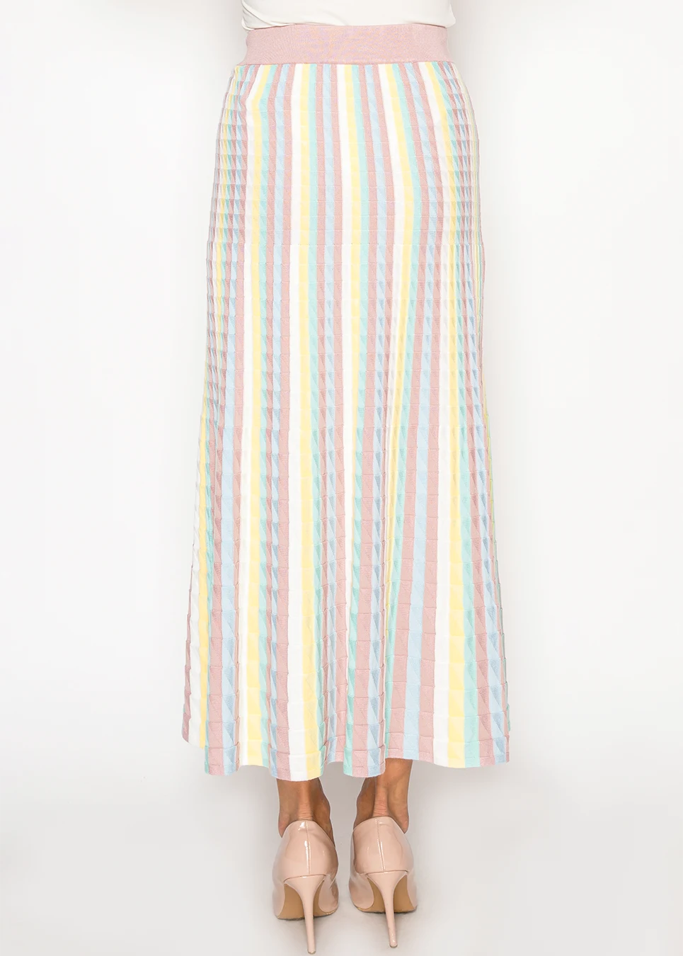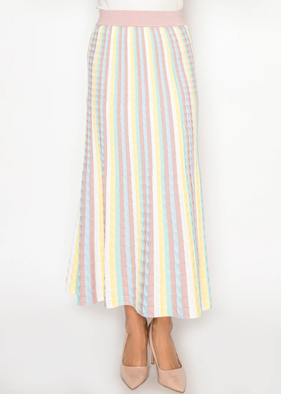 A softly textured knit skirt with vertical pastel stripes that elongate the silhouette. Designed with a comfortable elastic waistband for easy, all-day wear.