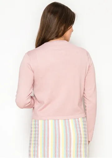 A refined blush knit elevated by a sculptural white floral accent. Its smooth finish and tailored cut make it a graceful addition to a thoughtful wardrobe.