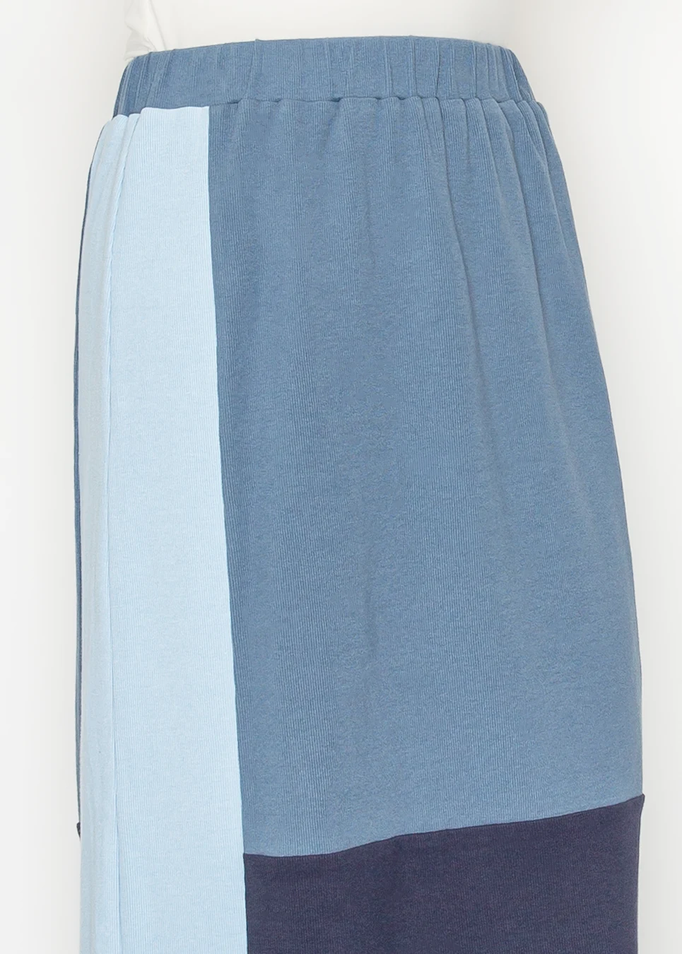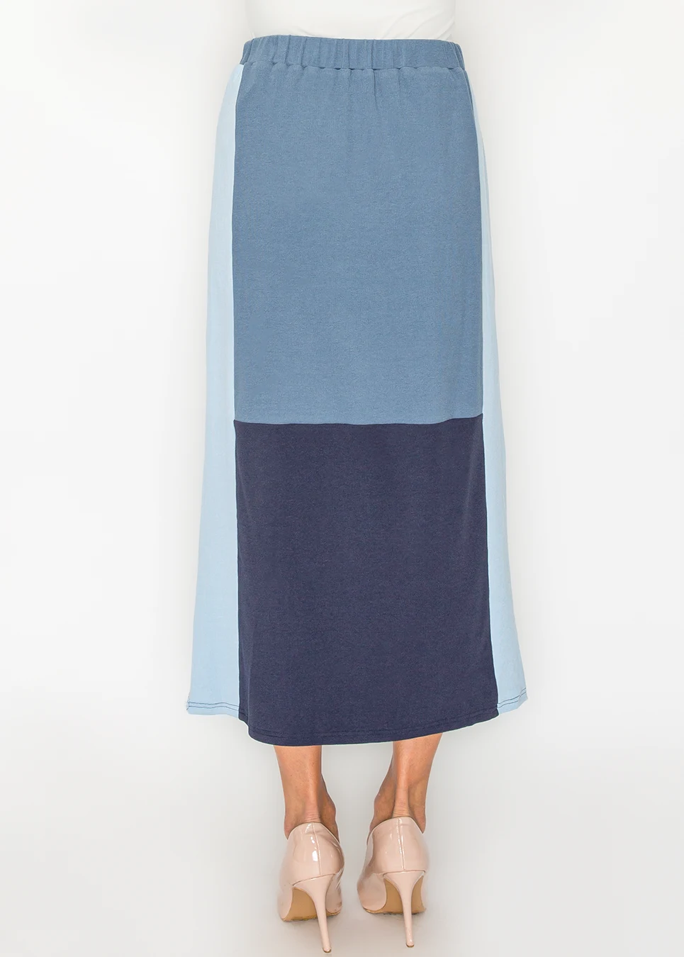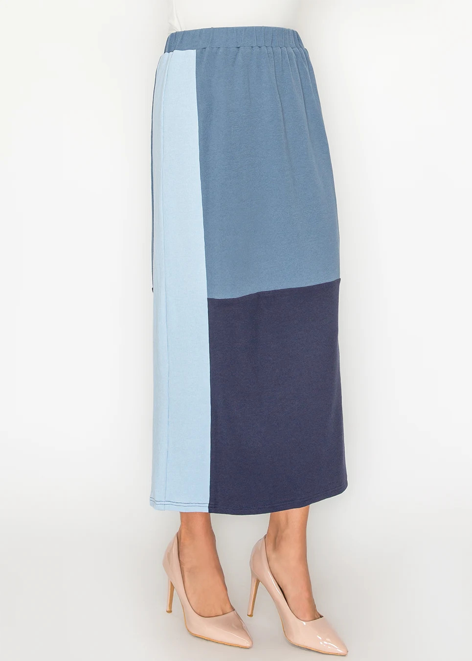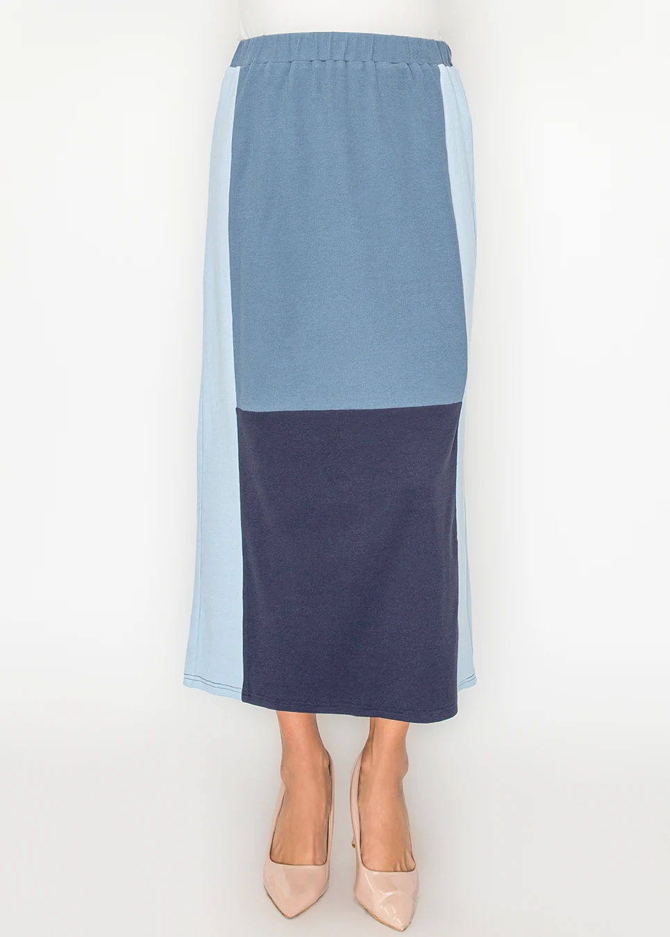 Slate center, powder side panel, navy hem. Elastic waist, soft stretch fabric, straight midi cut. Goes with more tops than you'd expect. Gets worn on weeks when you don't want to think too hard about what's on the bottom half.