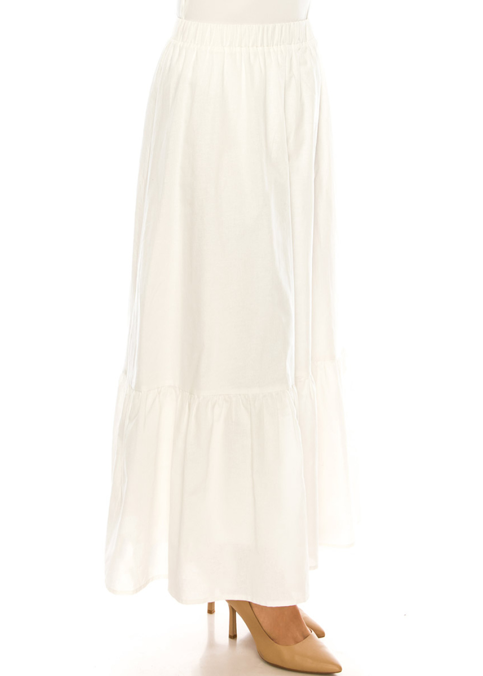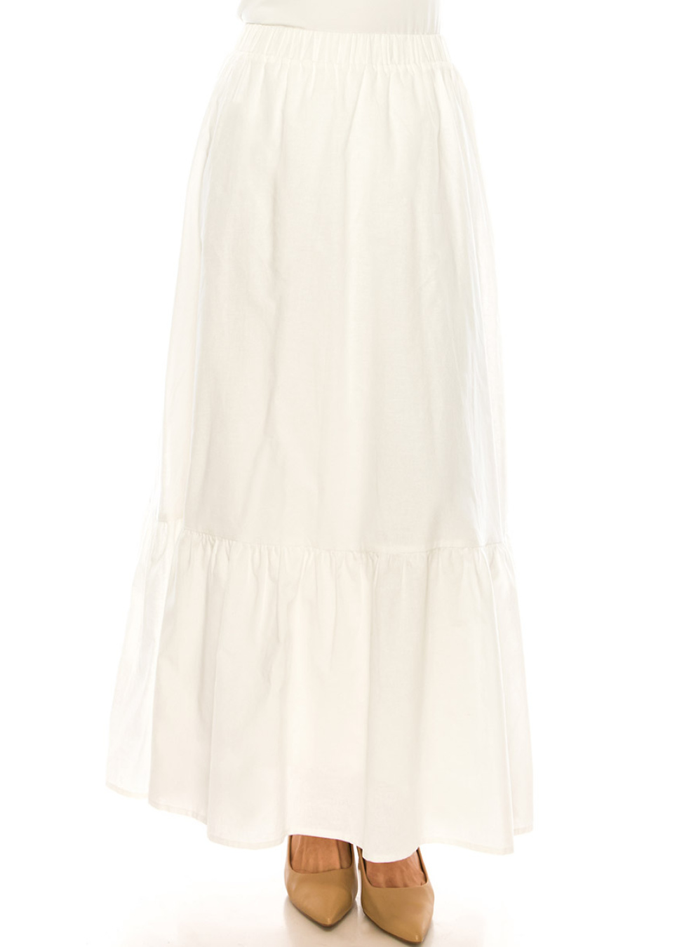 Every woman deserves a beautiful and versatile white linen maxi skirt in her wardrobe. Our elegant tiered design and modest A-line cut make it perfect for any occasion. Made from high-quality materials, this skirt is both durable and comfortable, ensuring you look and feel your best all day long.