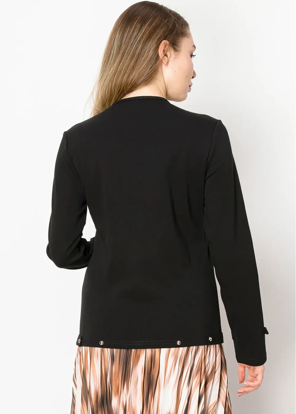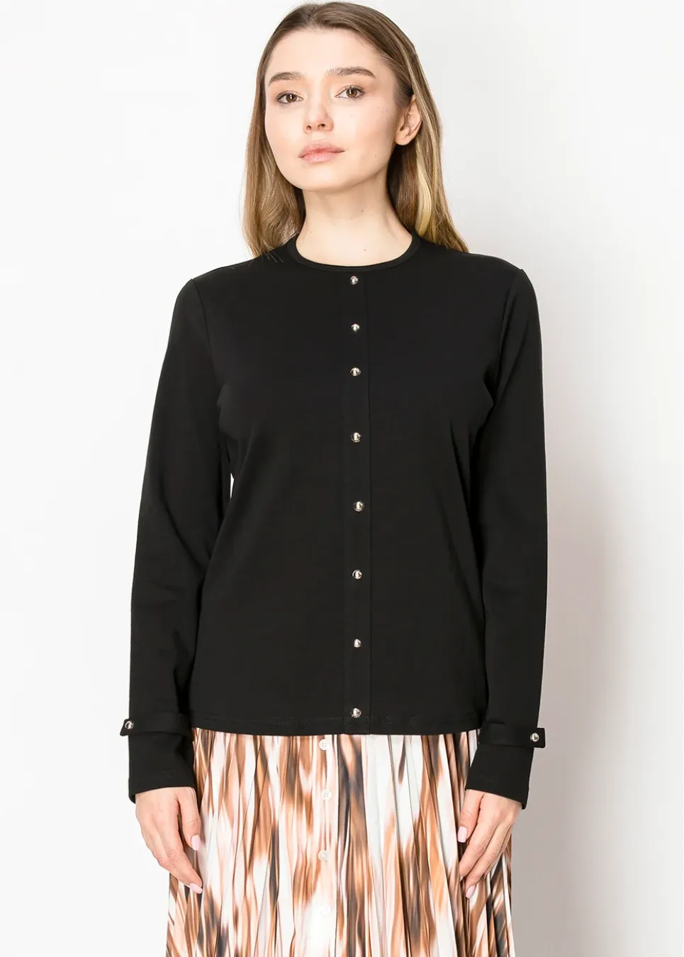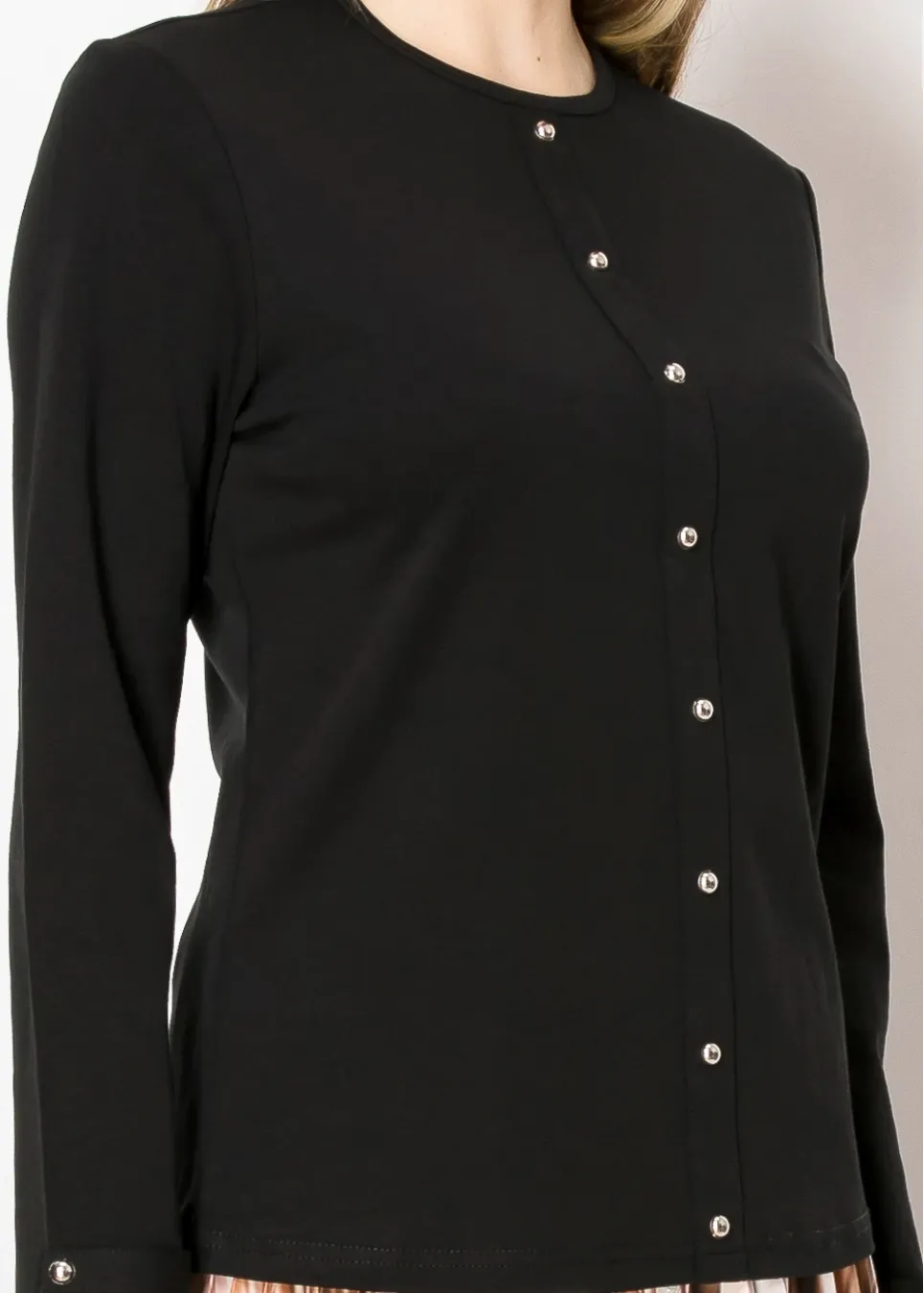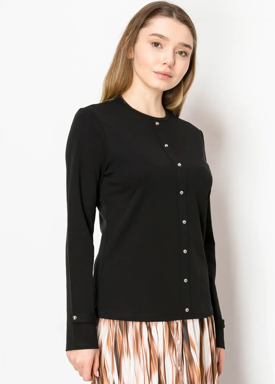 It’s the little things that make a difference—like the subtle silver buttons that run down the front of this soft black top. Whether for layering or wearing on its own, this piece is designed to be effortlessly easy and endlessly wearable.