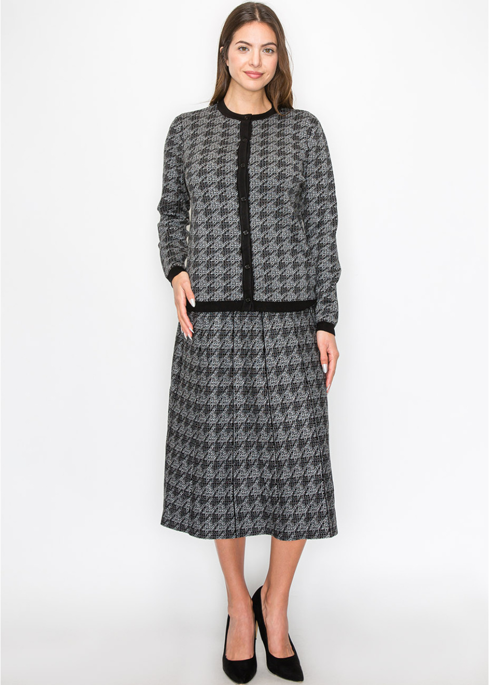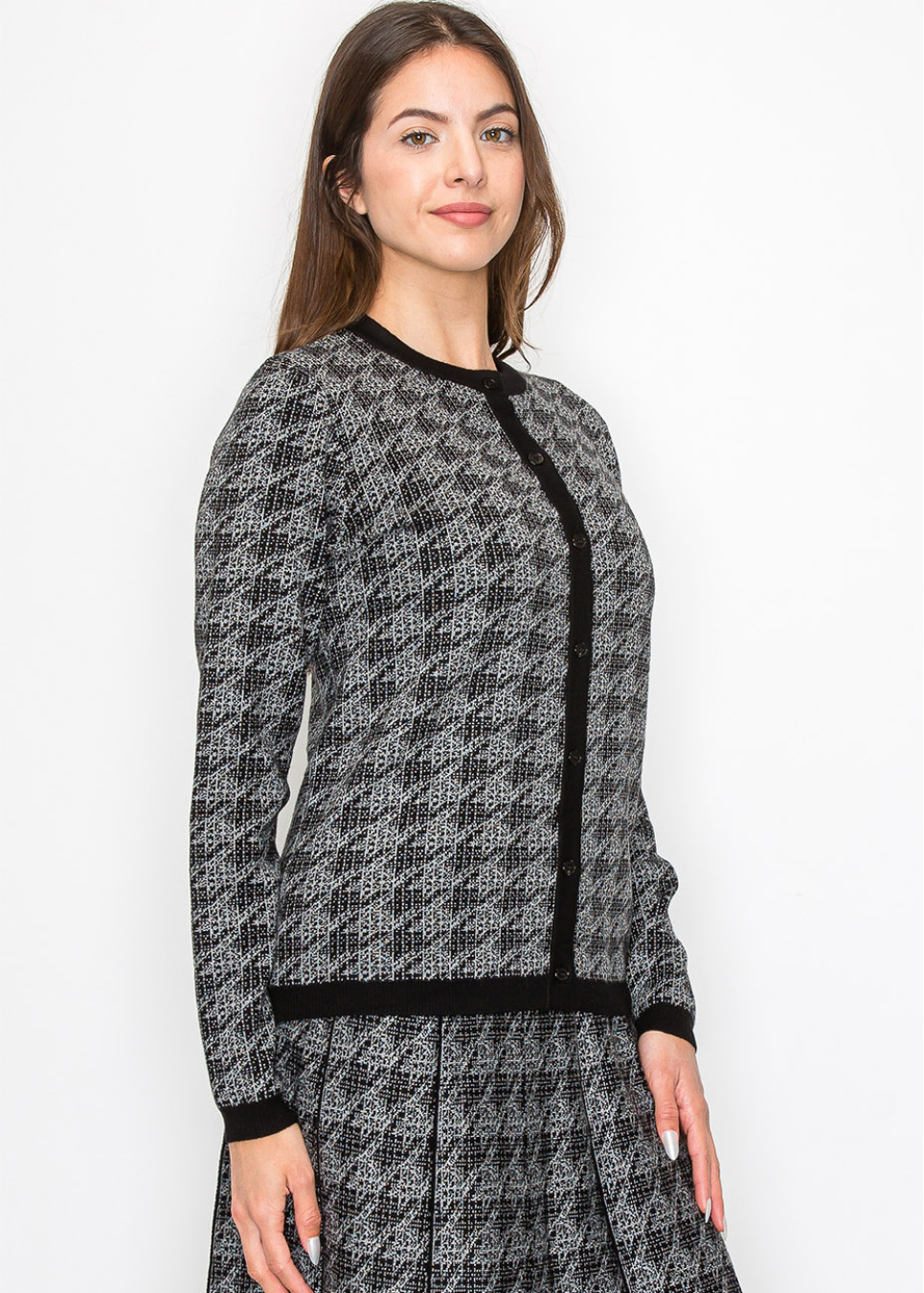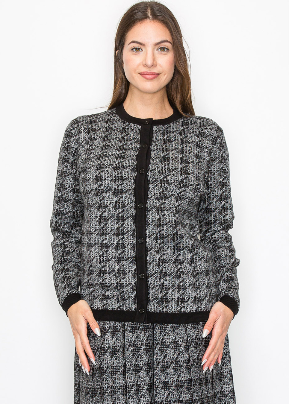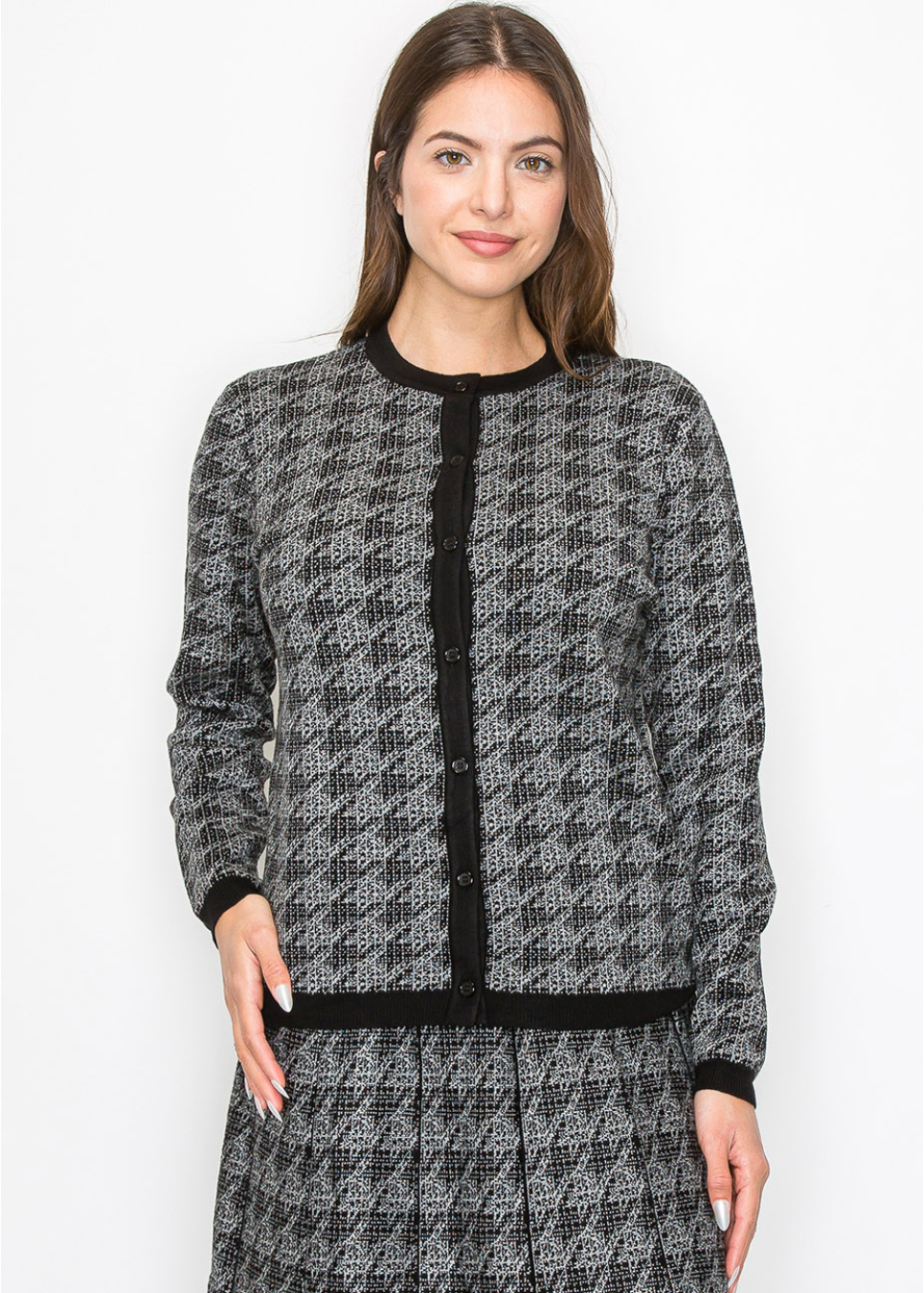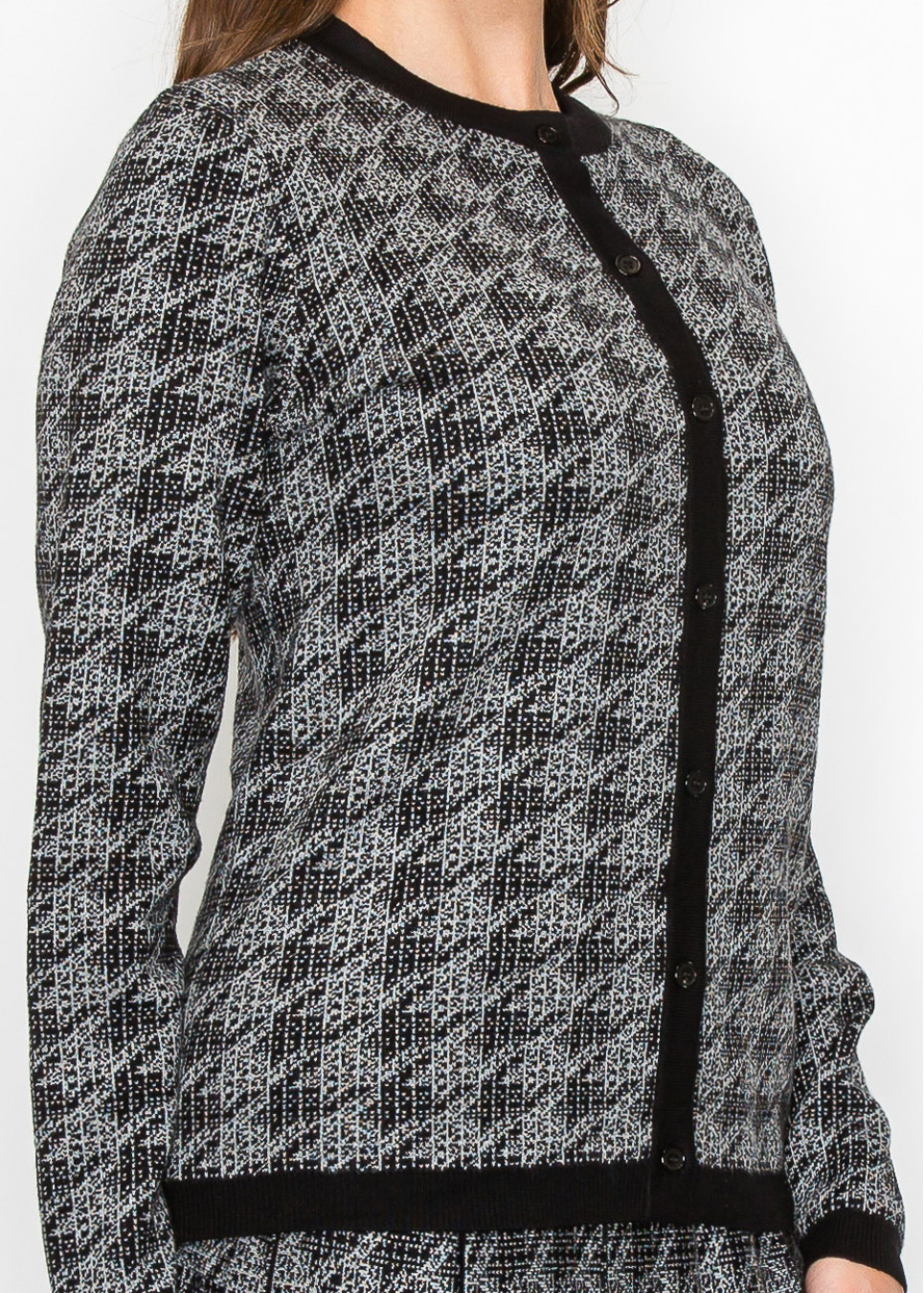 Meet your new go-to cardigan for layering. The houndstooth pattern is subtle yet striking, making this piece a standout in your collection. The soft knit fabric feels great against your skin, and the black trim along the button placket ties everything together. Perfect for dressing up or down.