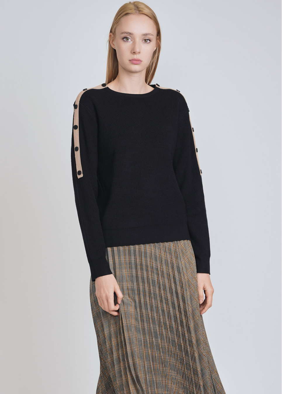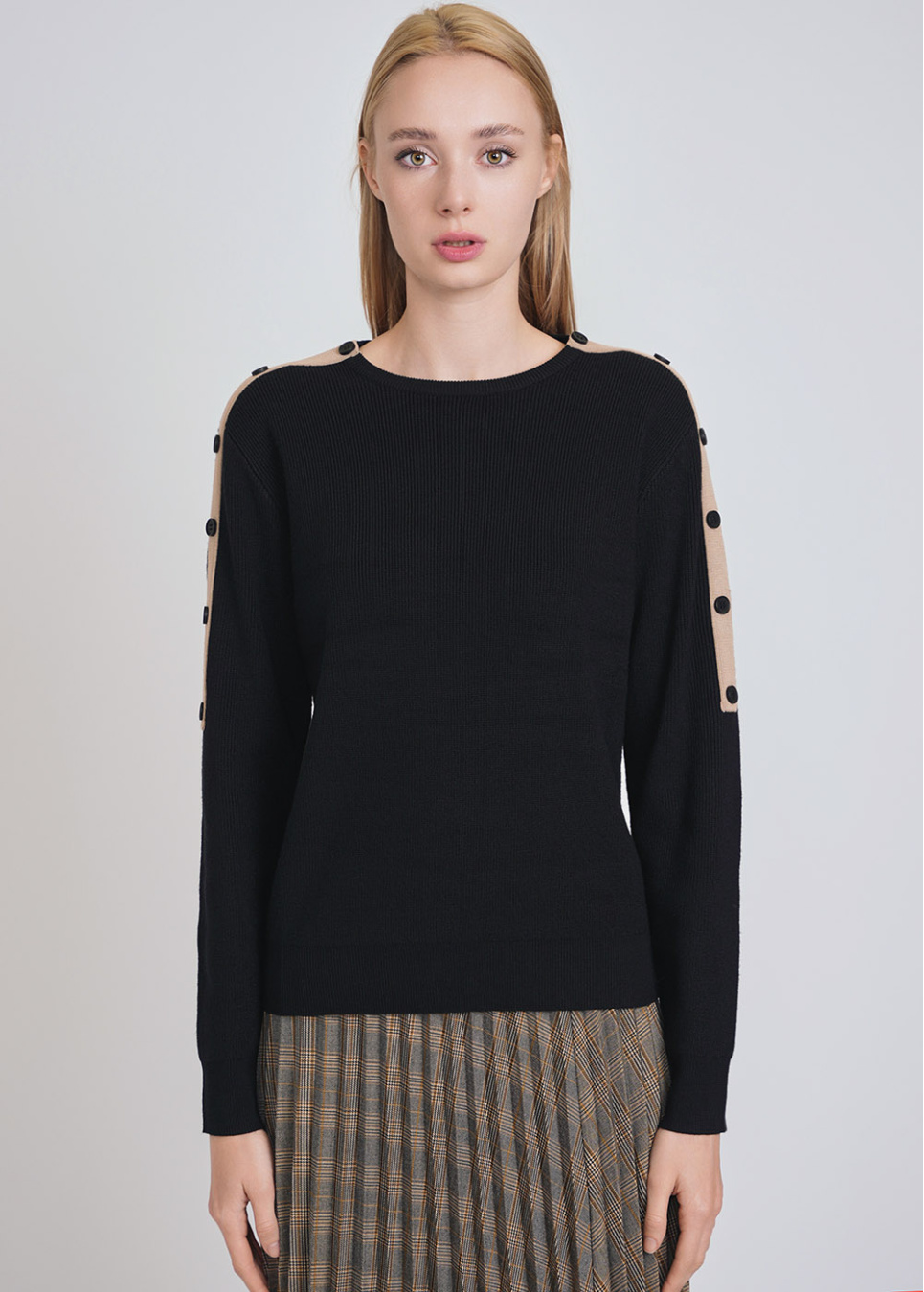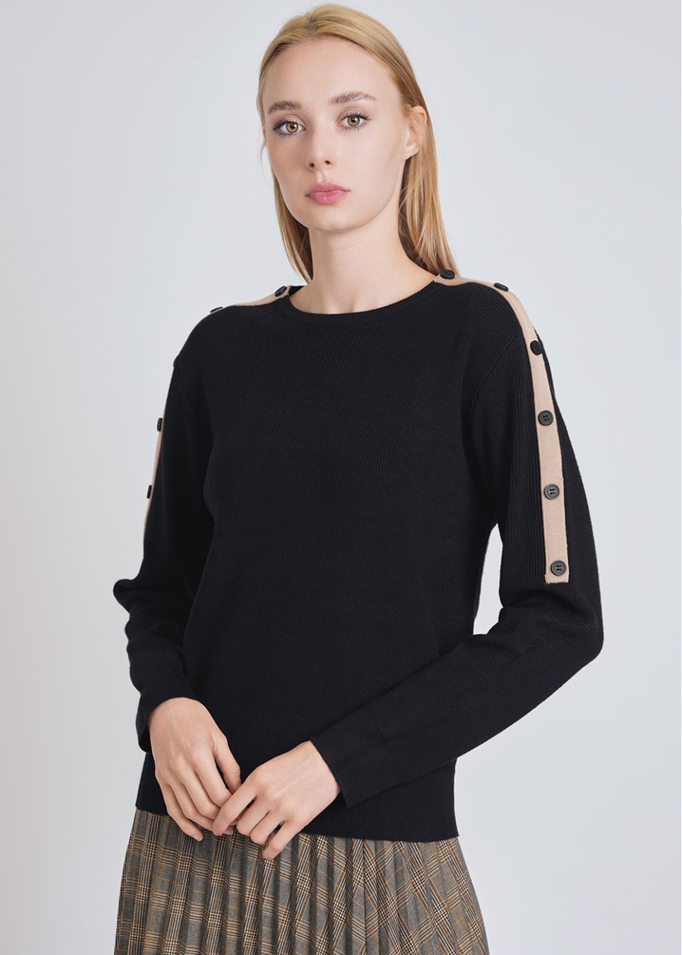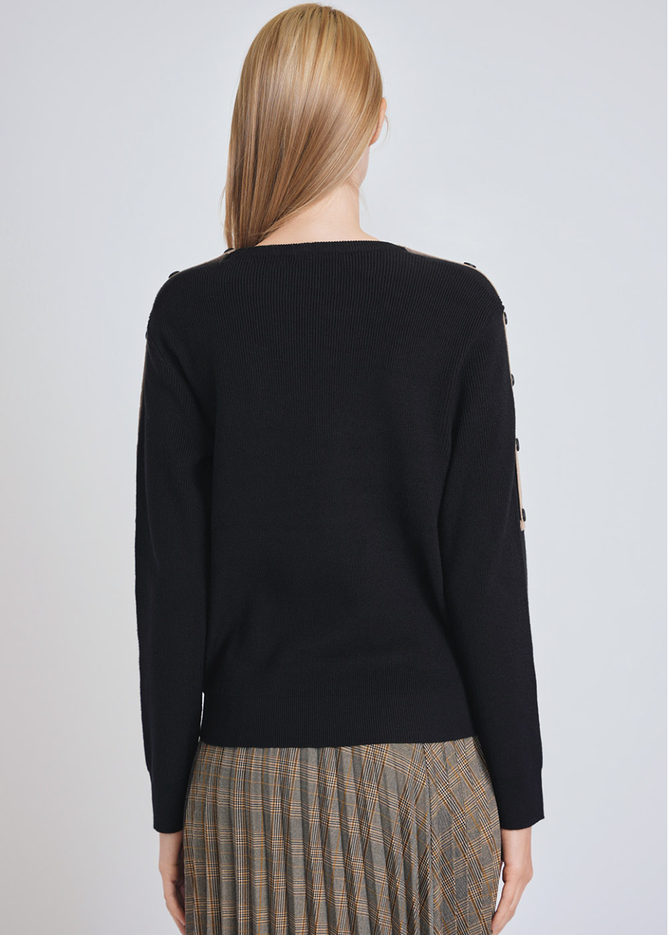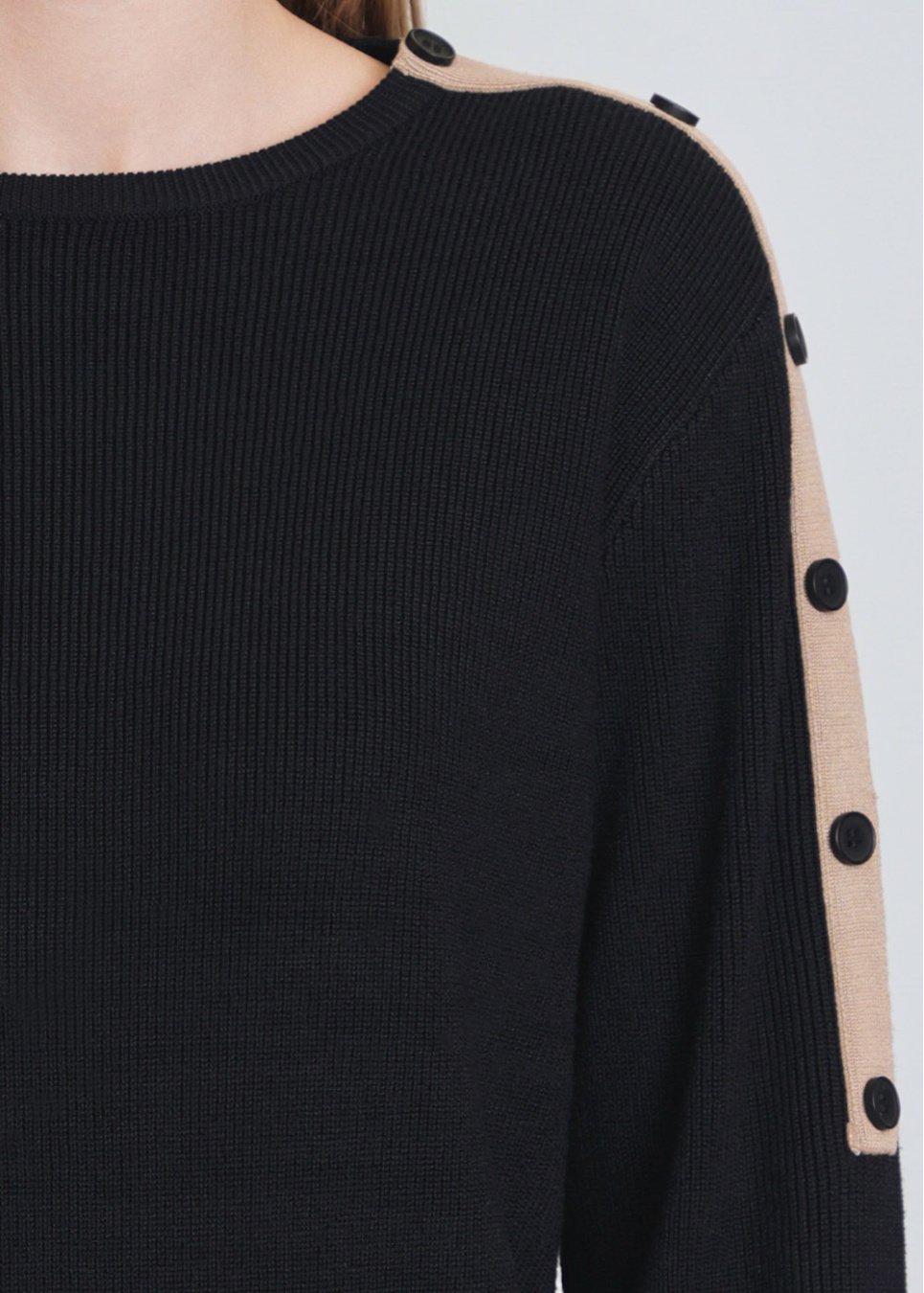 Trendy Black Sweater: Knit Texture & Sleeve Buttons