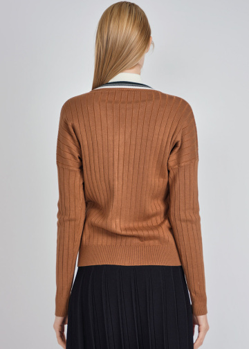 Ribbed Camel Cardigan with Striped Details
