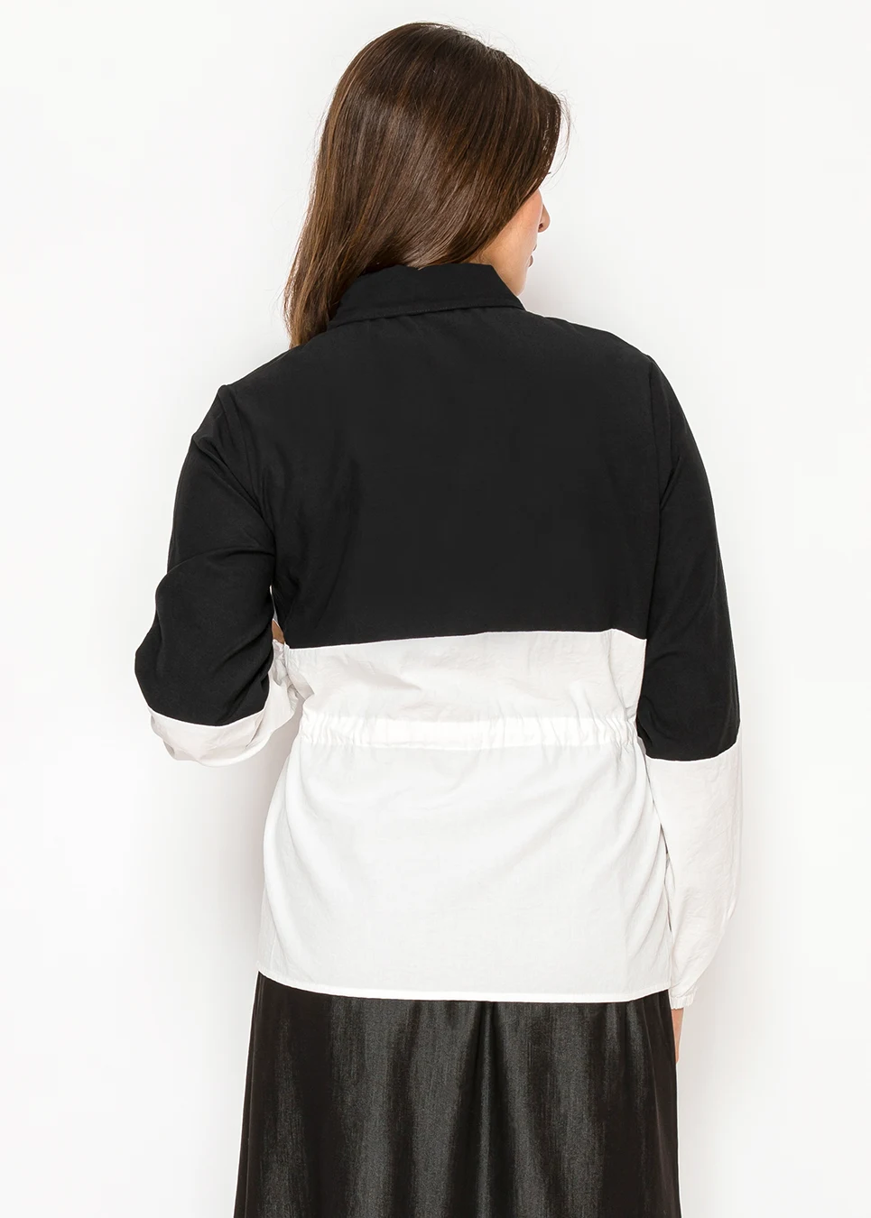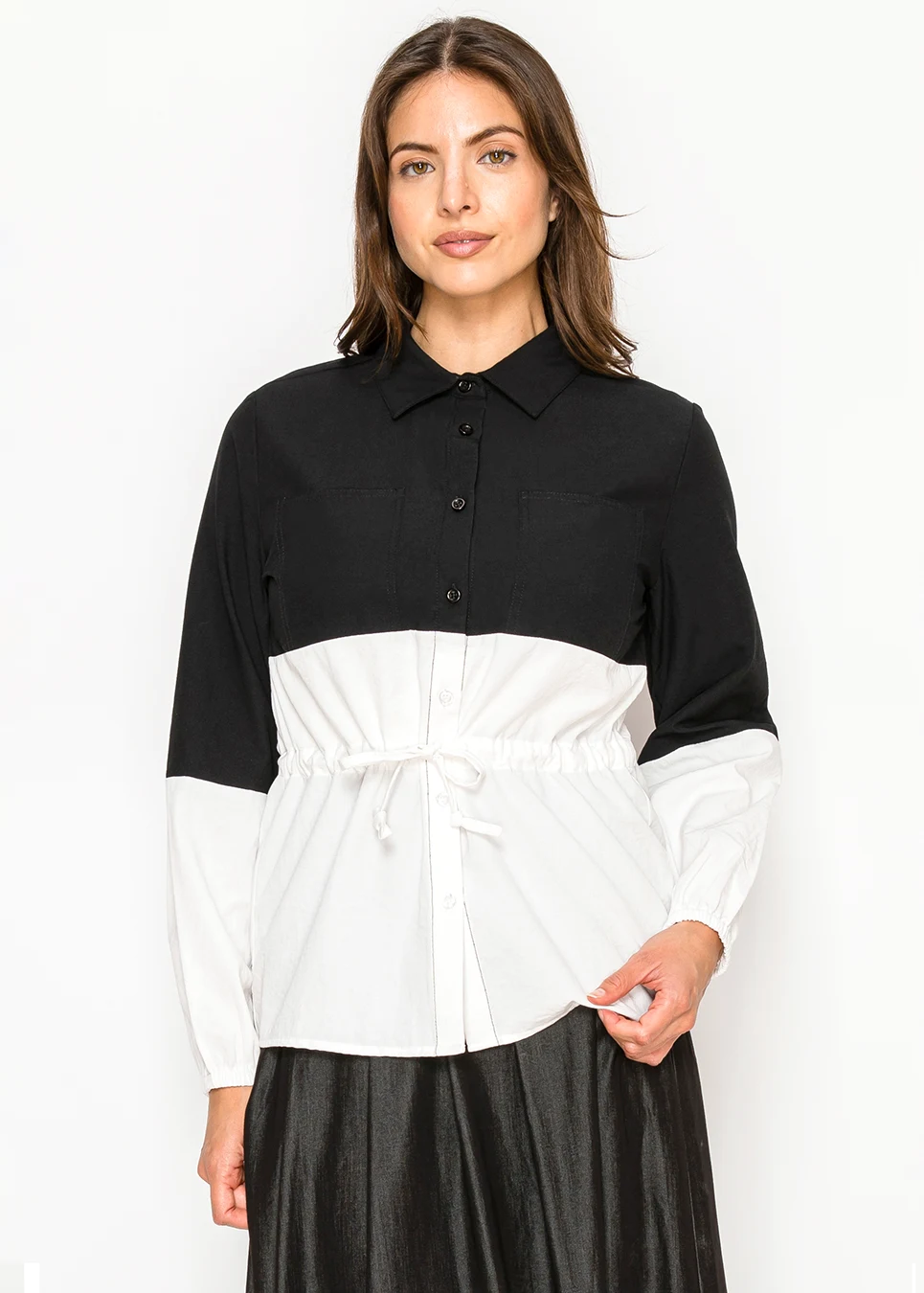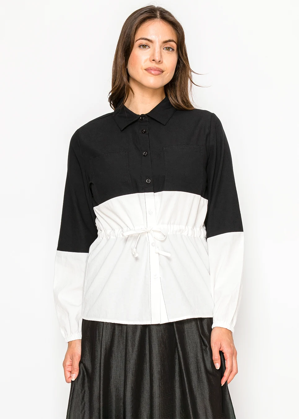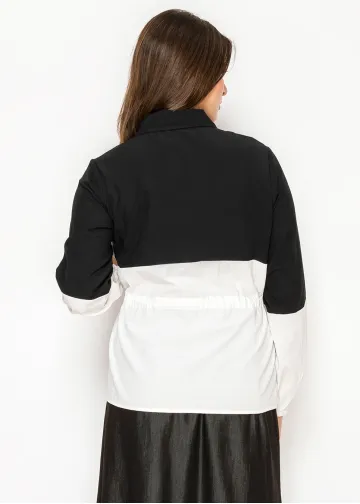 Looks like a graphic statement. Wears like a comfortable blouse. The color-block is bold but the fit is relaxed — shirt collar, long sleeves, a drawstring waist you control. Black on top grounds it, white on the bottom keeps it from feeling heavy. The chest pocket is a small practical touch that fits the overall look.