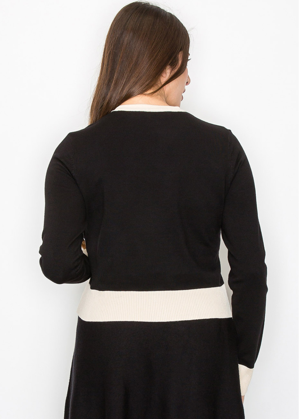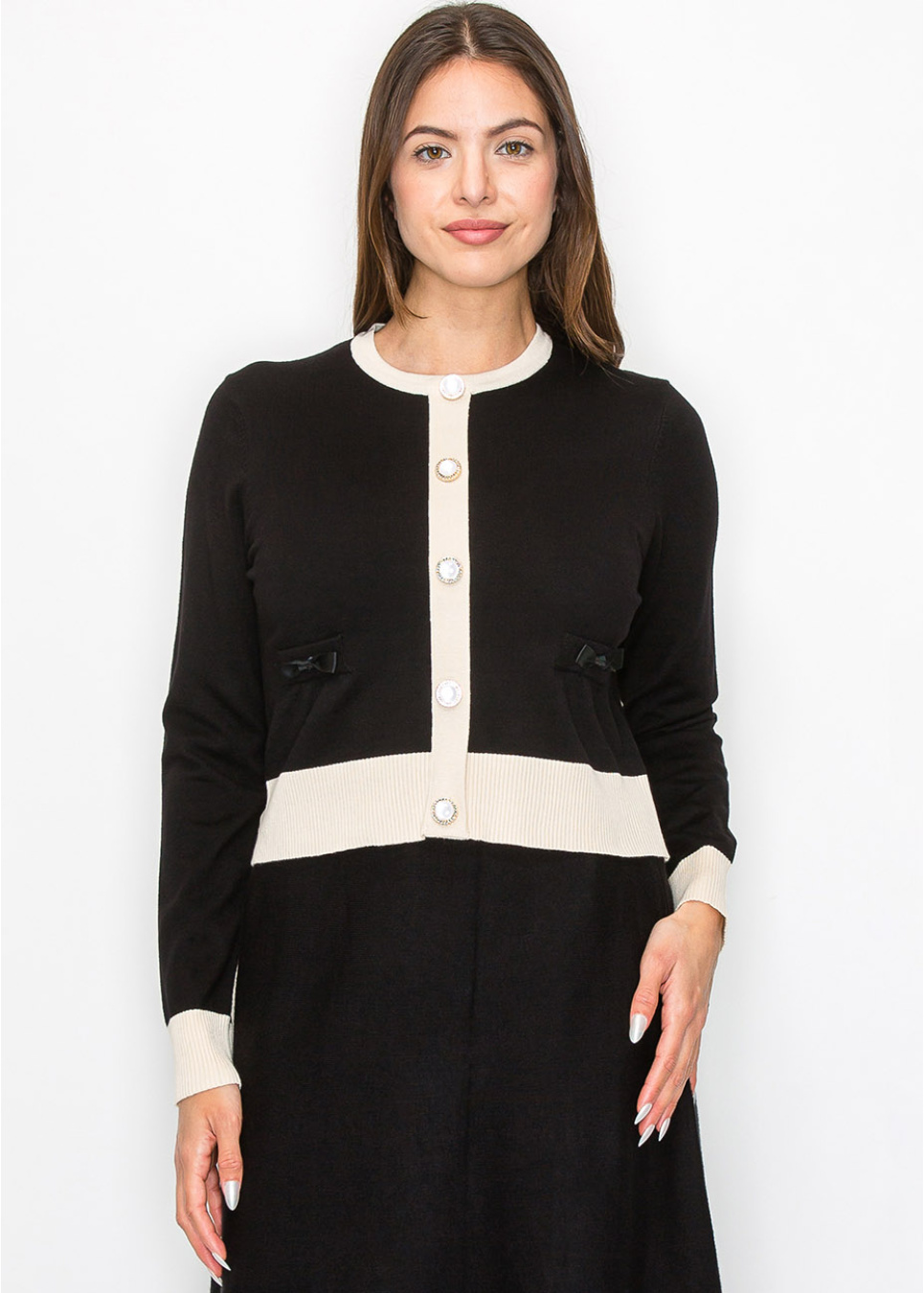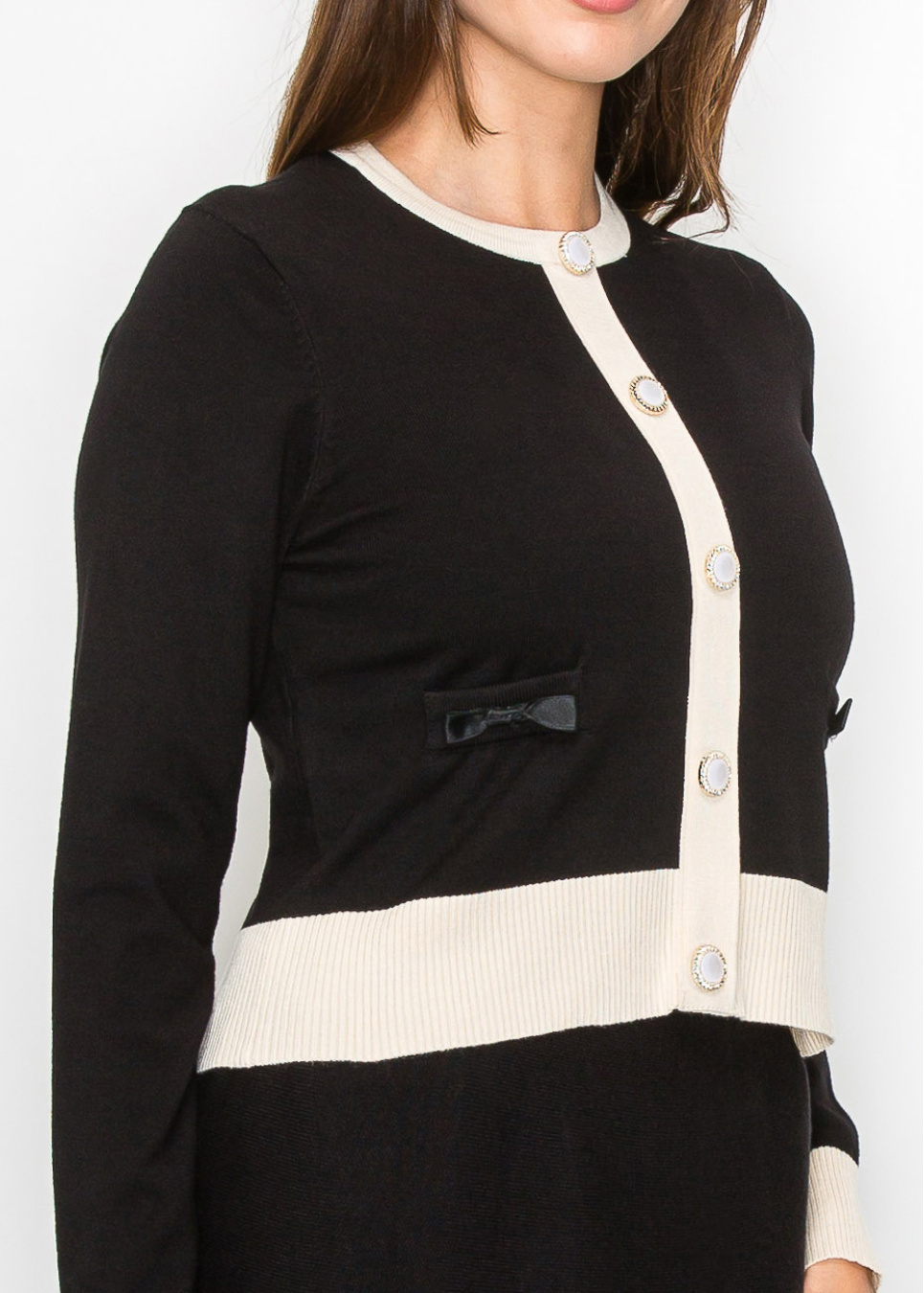 Discover the perfect blend of elegance and style with this two-tone cardigan. The pearl buttons and contrast trim create a striking look, while the bow details add a feminine touch, making it ideal for both casual wear and dressier occasions.