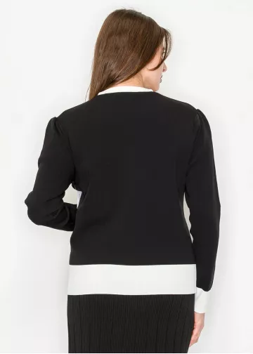 Graphic contrast trim and textured floral buttons create a modern, eye-catching look. A chic option for elevating your everyday style.