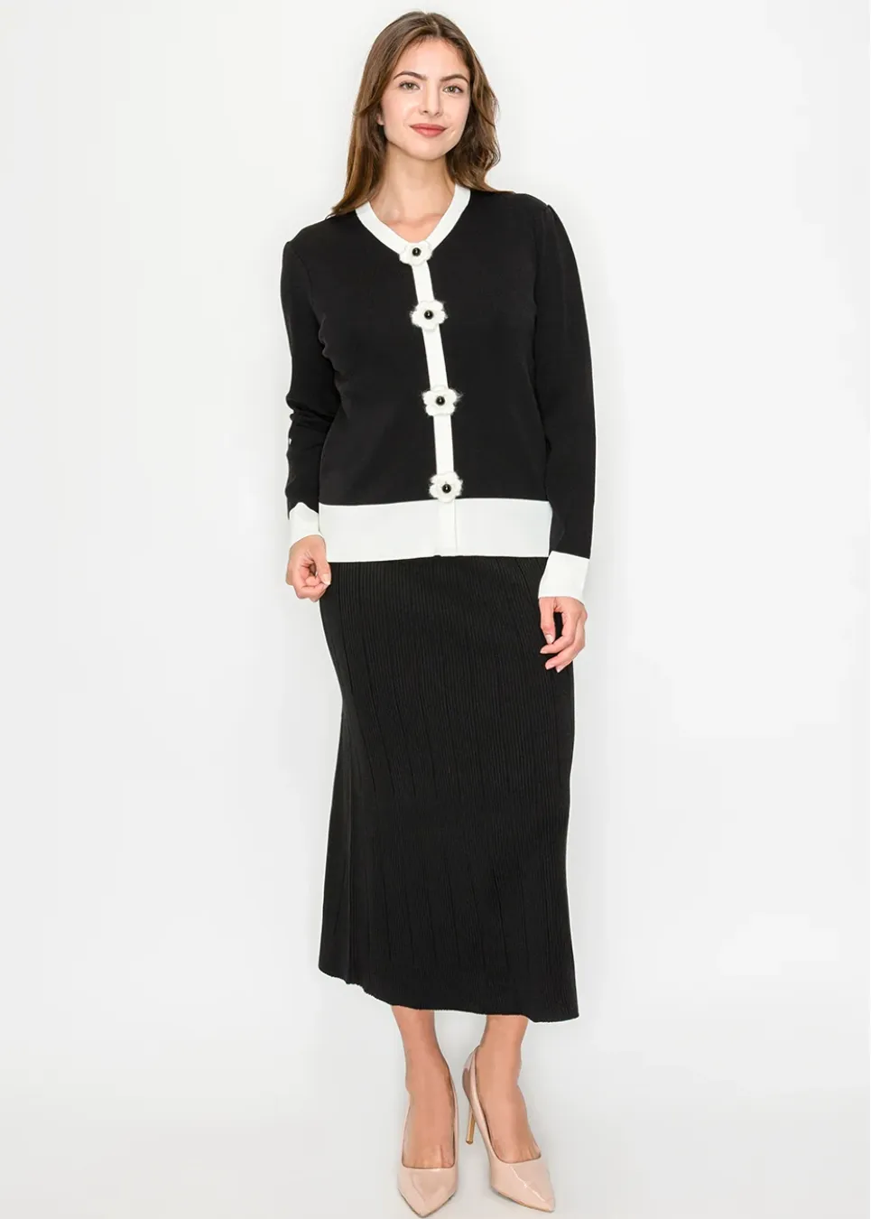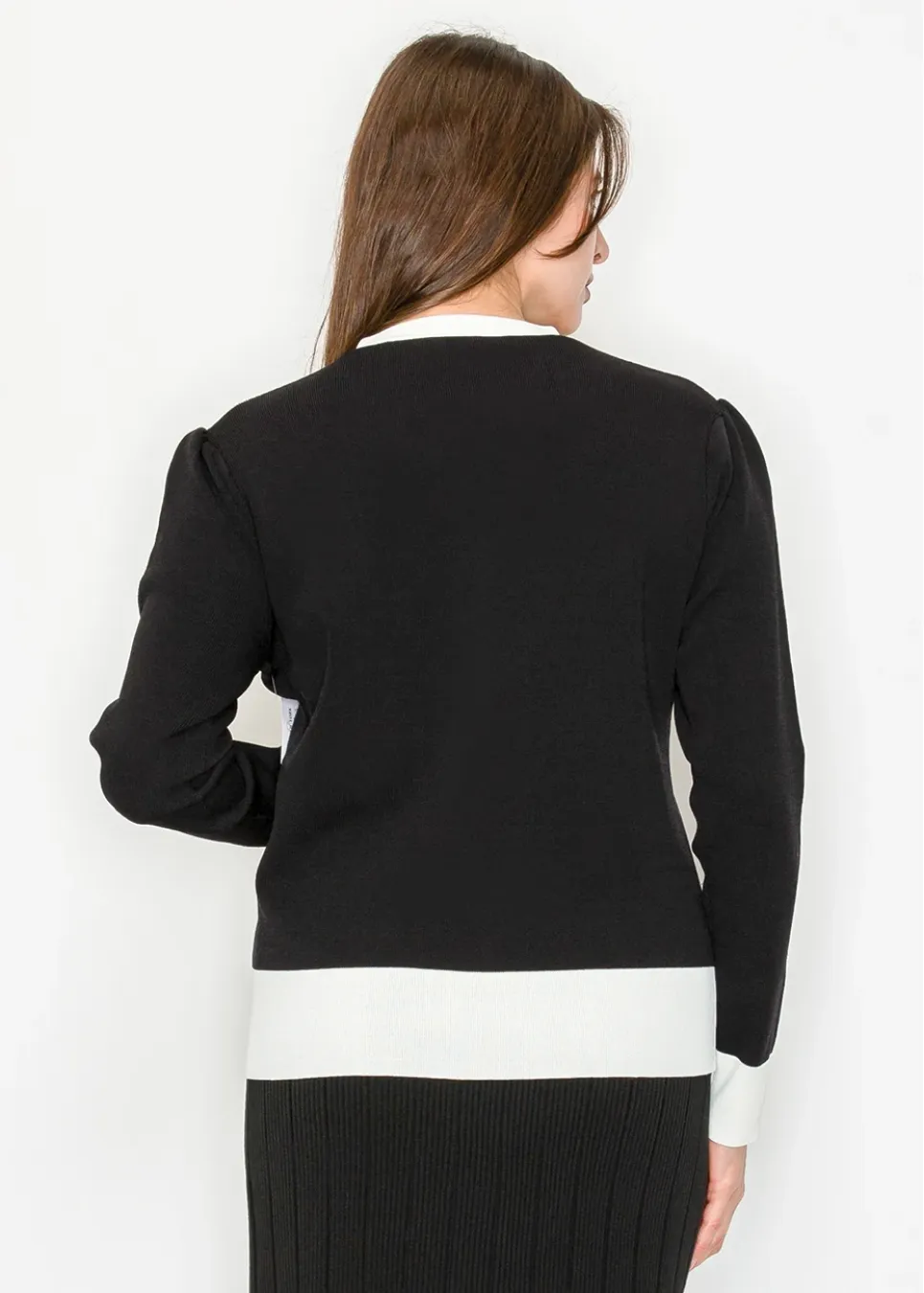 Graphic contrast trim and textured floral buttons create a modern, eye-catching look. A chic option for elevating your everyday style.