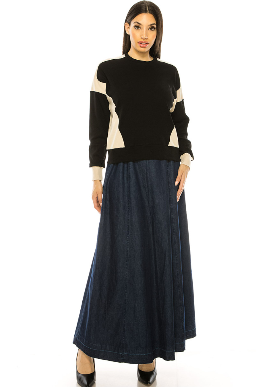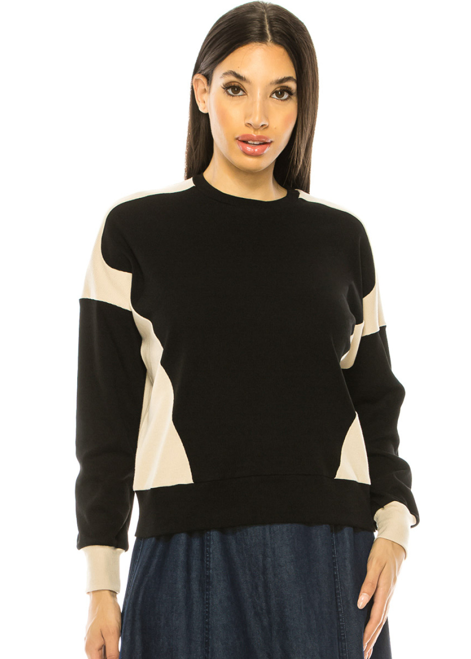Unleash your creativity with this black and beige two-tone long sleeve t-shirt. The relaxed fit, dropped shoulder line, and unique two-tone design make it perfect for any frum woman who wants to express their individuality while still maintaining their modesty.