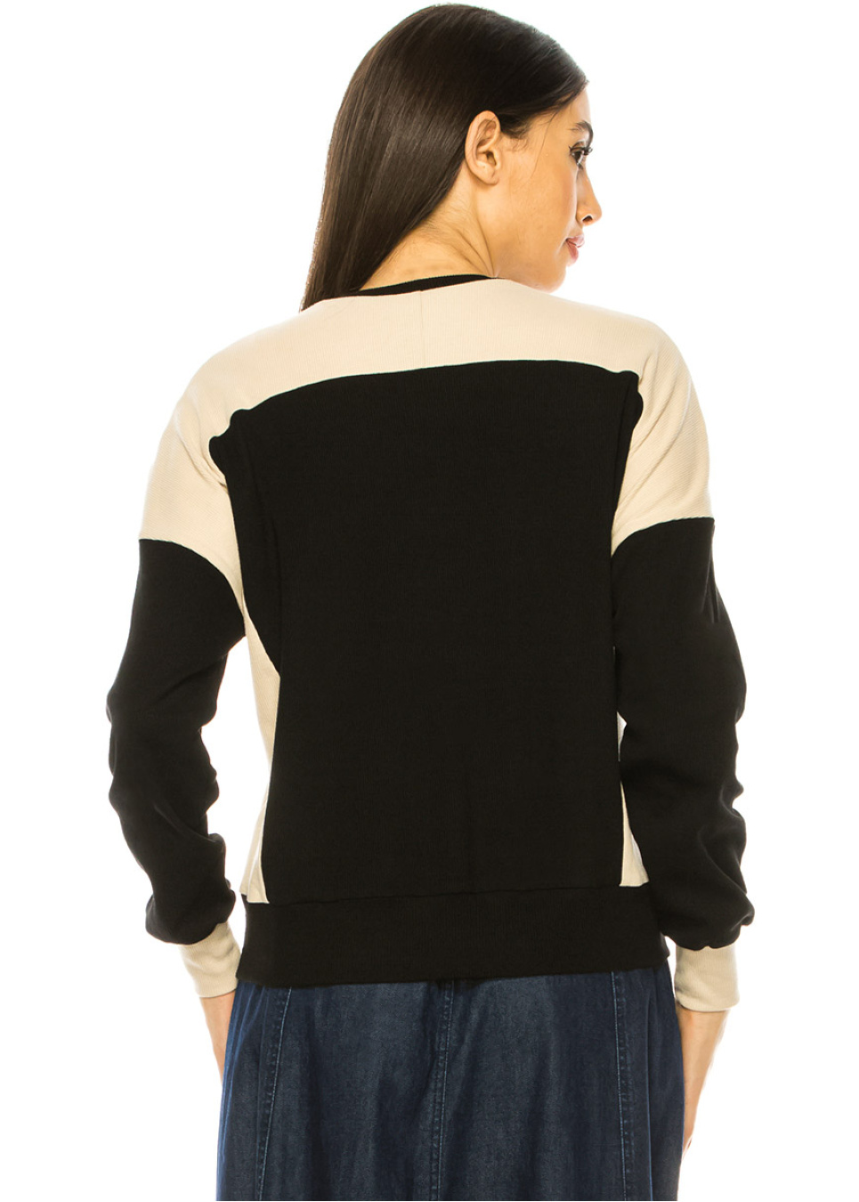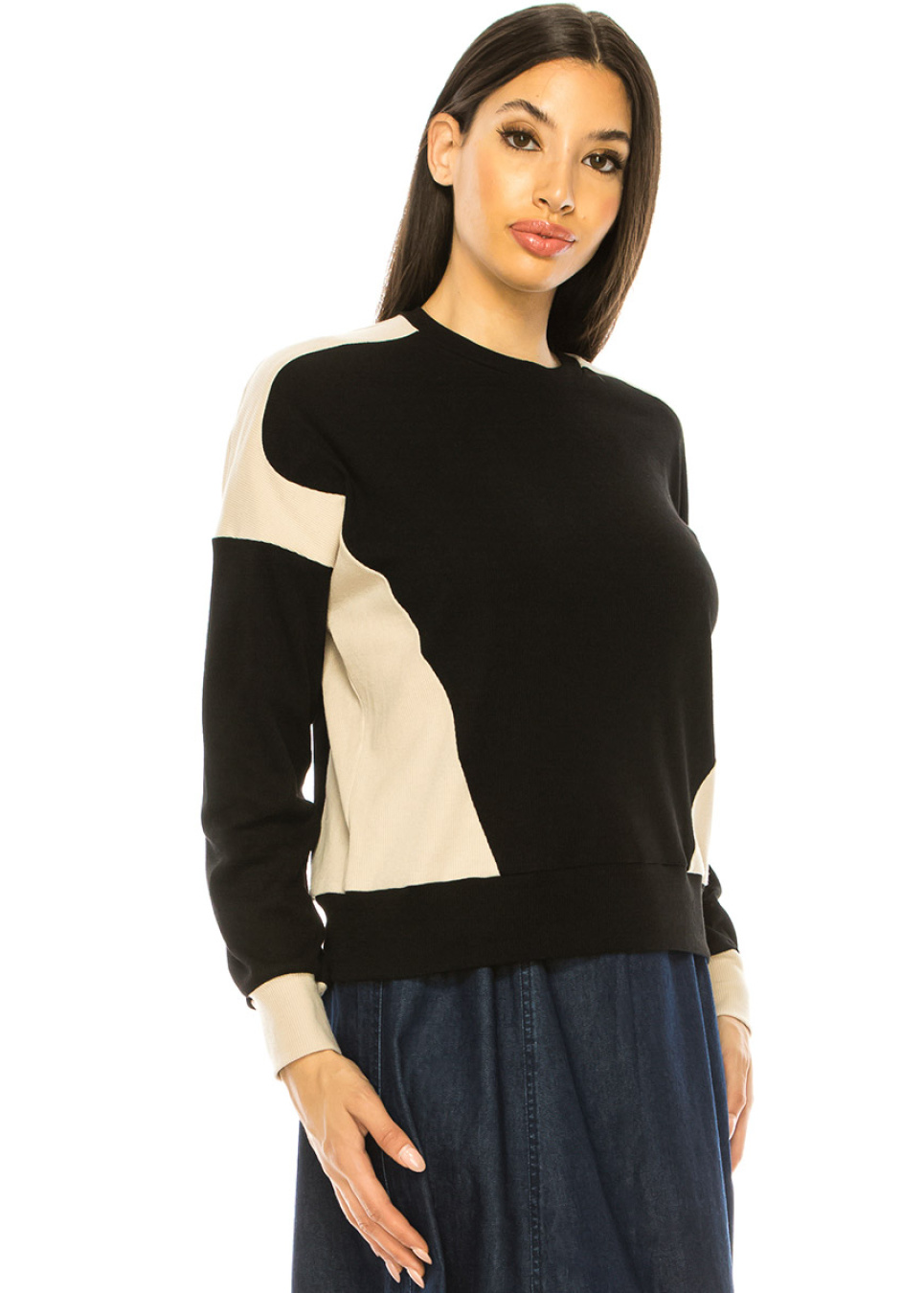 Two-Tone Long Sleeve T-Shirt In Black & Beige