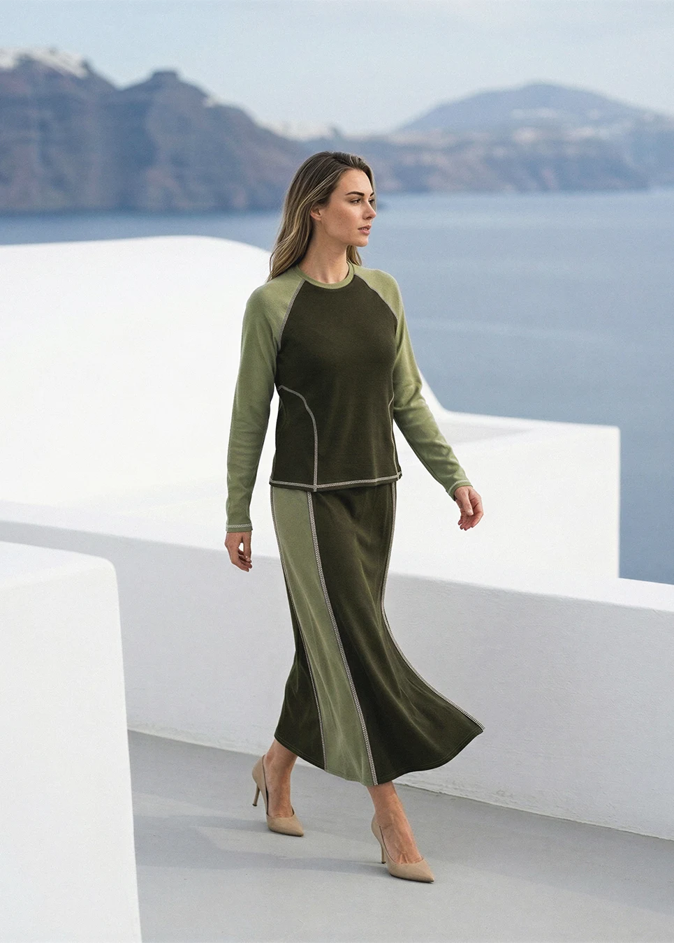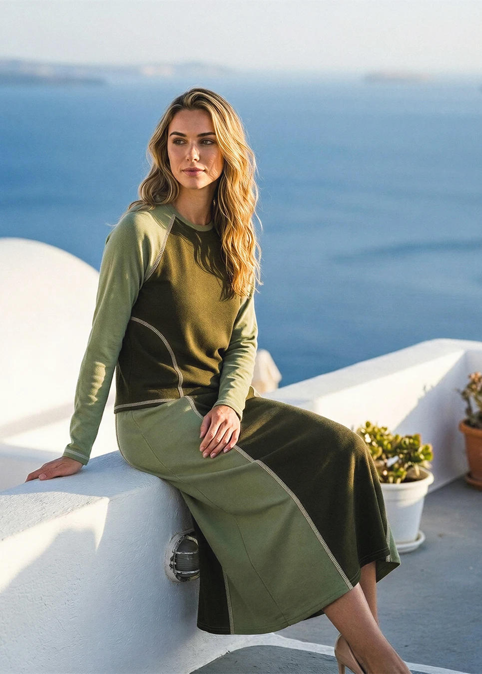 Two-Tone Olive Set – Colorblock Top and Midi Skirt