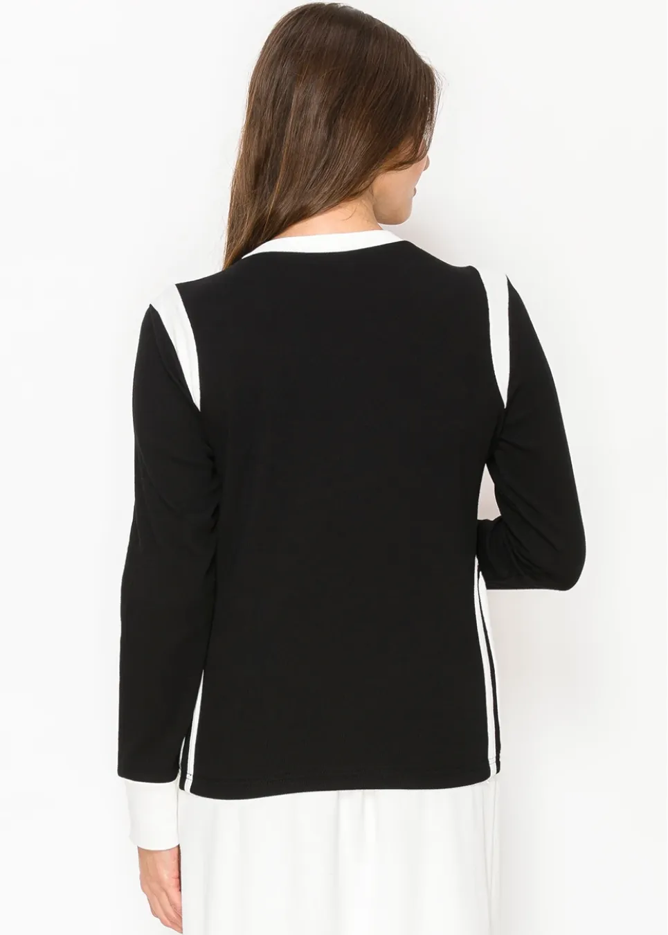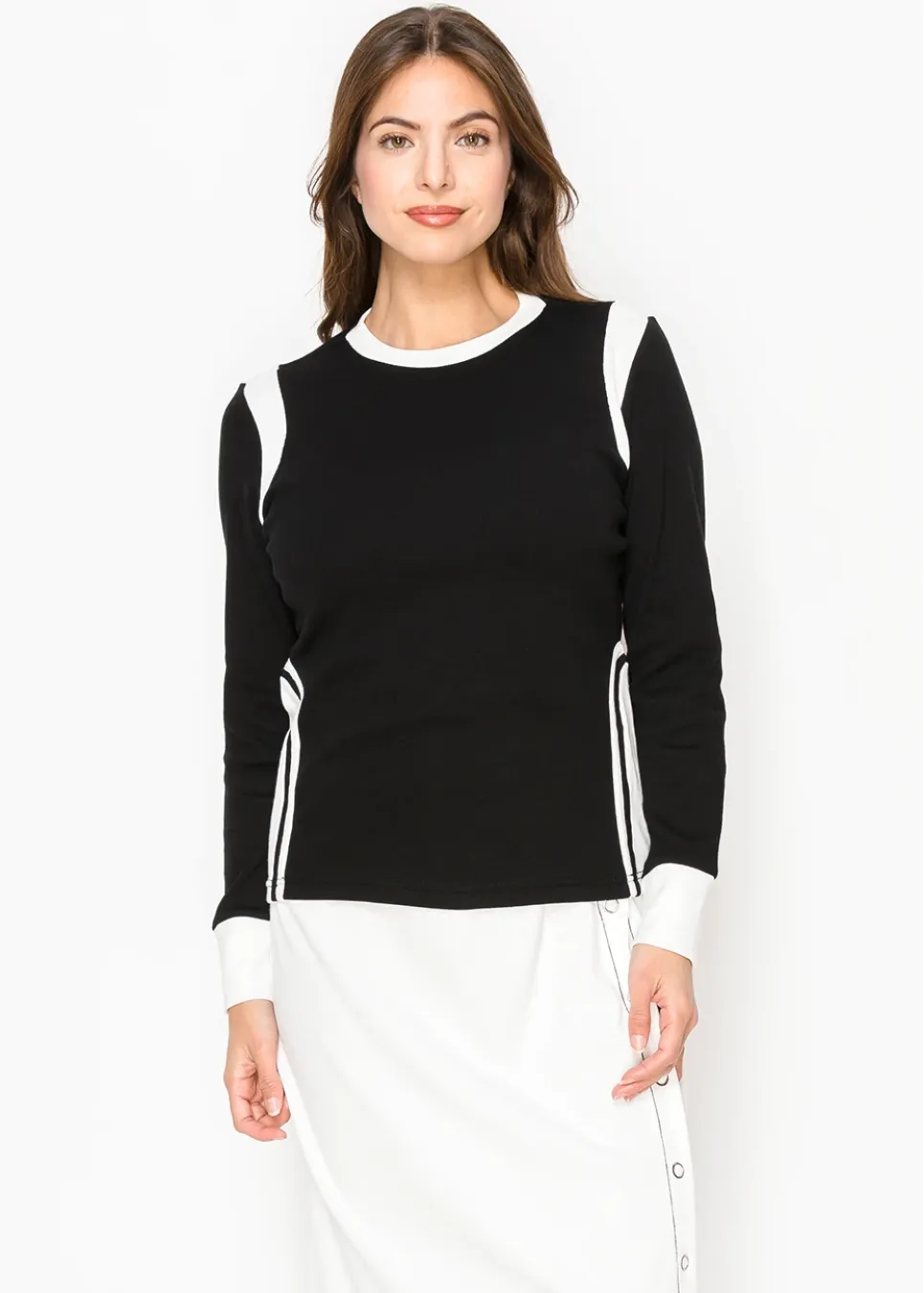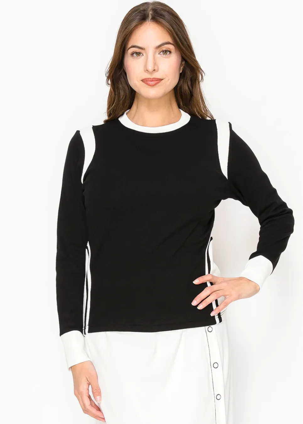 A wardrobe essential with a little something extra. The monochrome contrast details make this black crew neck top stand out while still being easy to wear. Pair it with anything for a polished yet relaxed look.