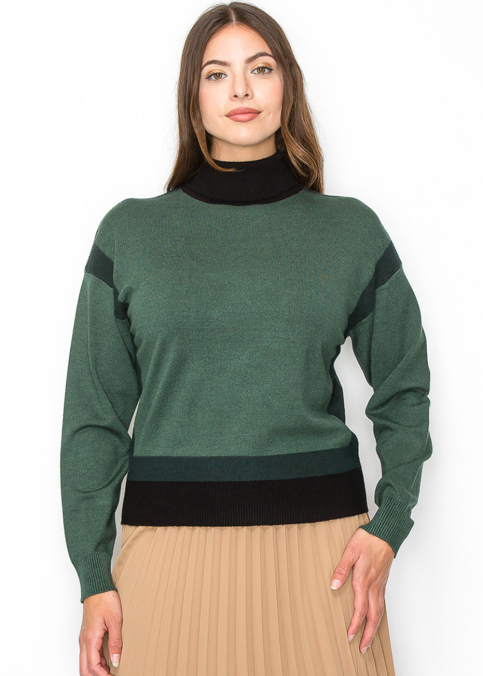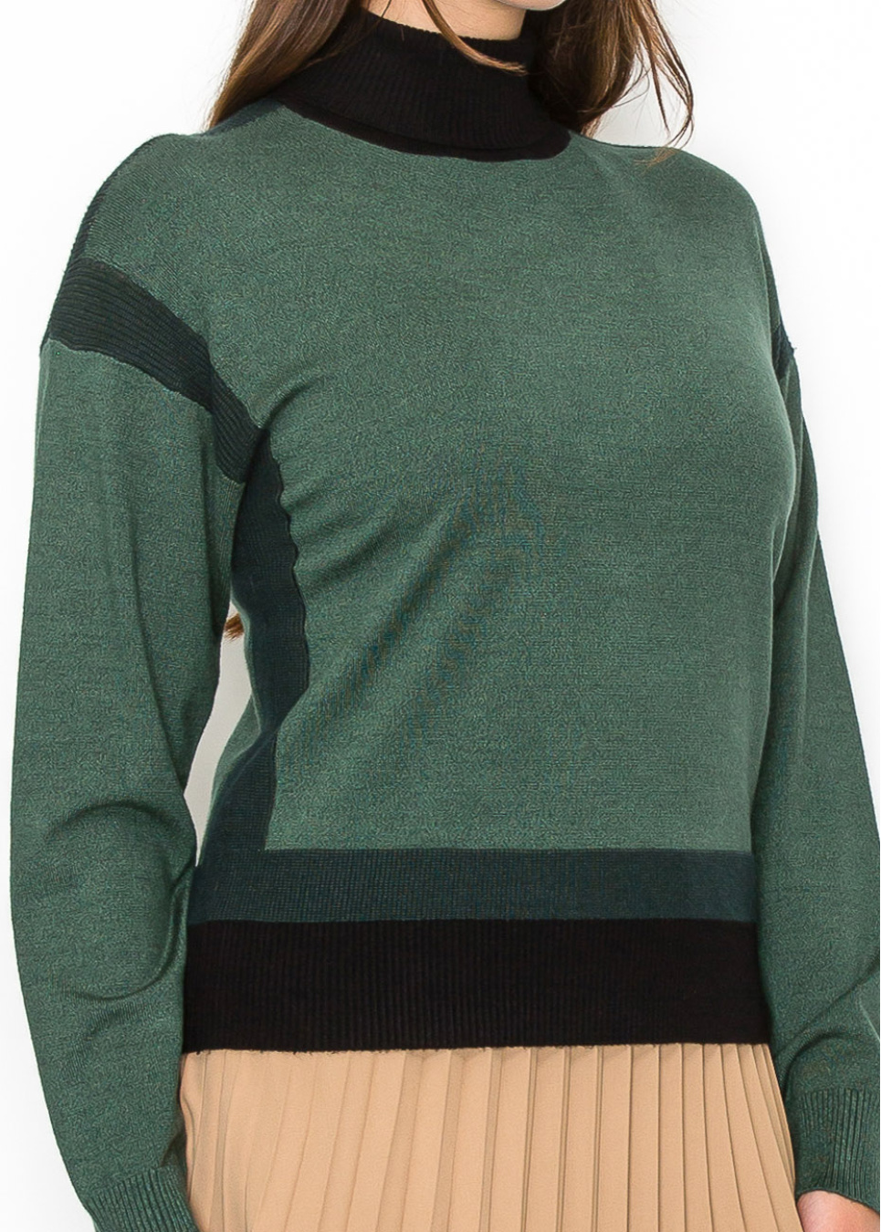 Crafted in a rich green hue with contrasting black details, this turtleneck sweater offers a comfortable fit and a polished look. The long sleeves and modest cut provide warmth and coverage, perfect for modest tznius women who value both comfort and style.