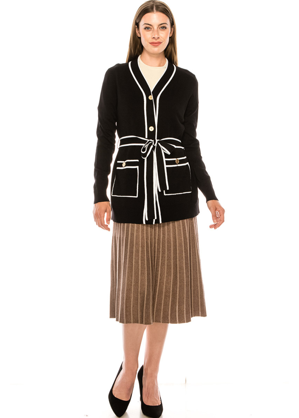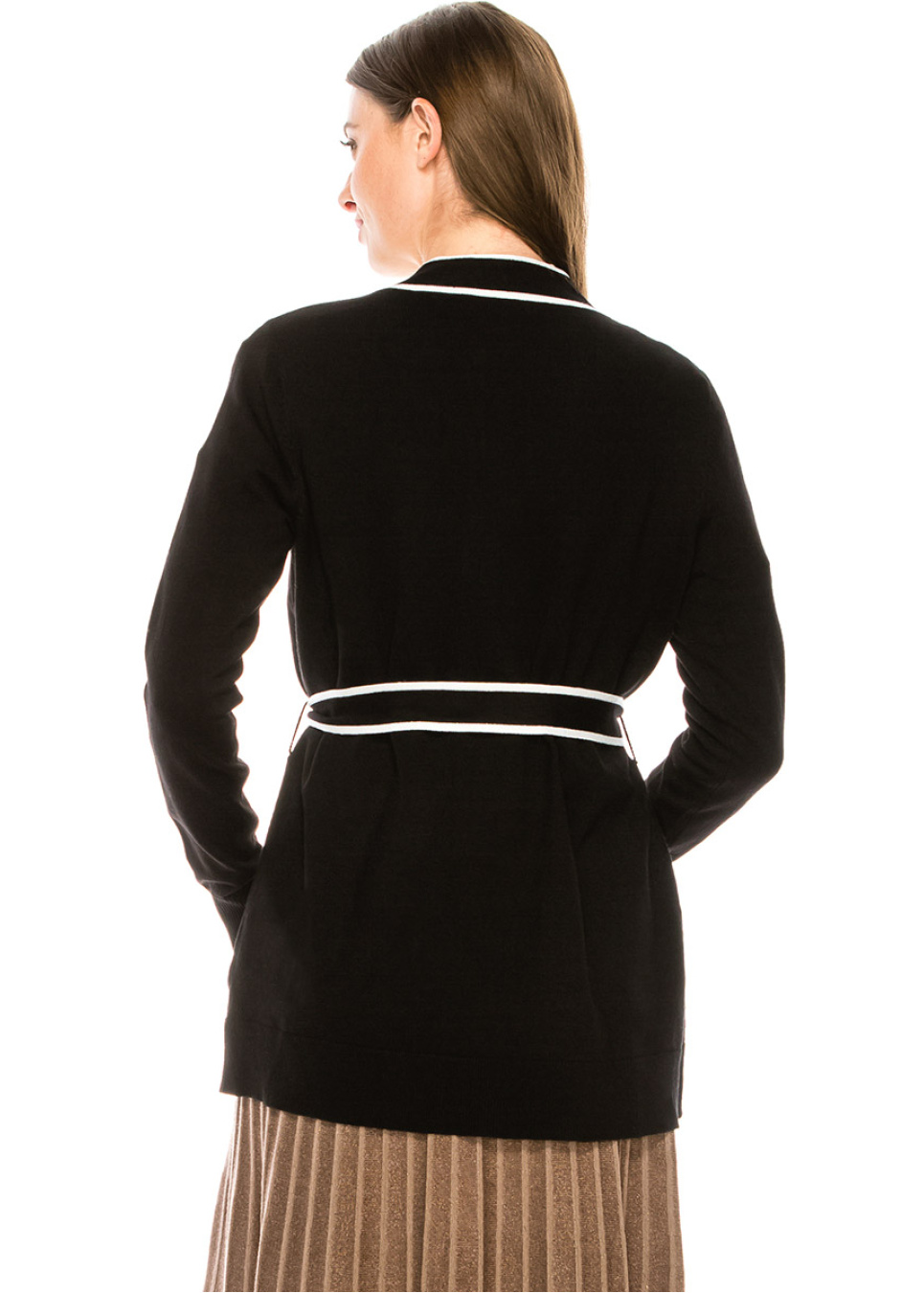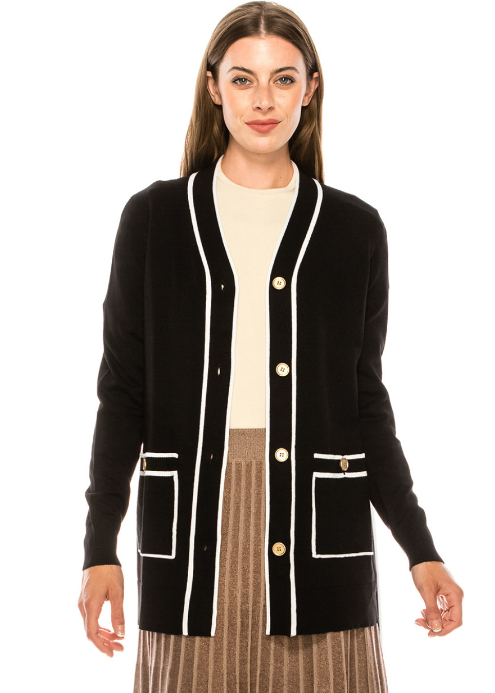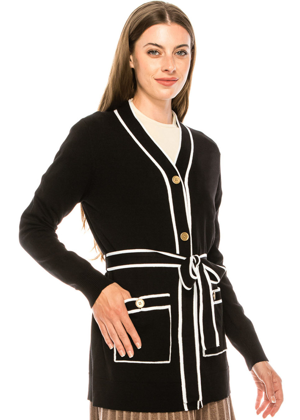 Want to be elegant every day? Then this cardigan with white trim on edge will perfectly fit into your wardrobe. Elongated cut thought out to the smallest detail will make you feel comfy in any setting.