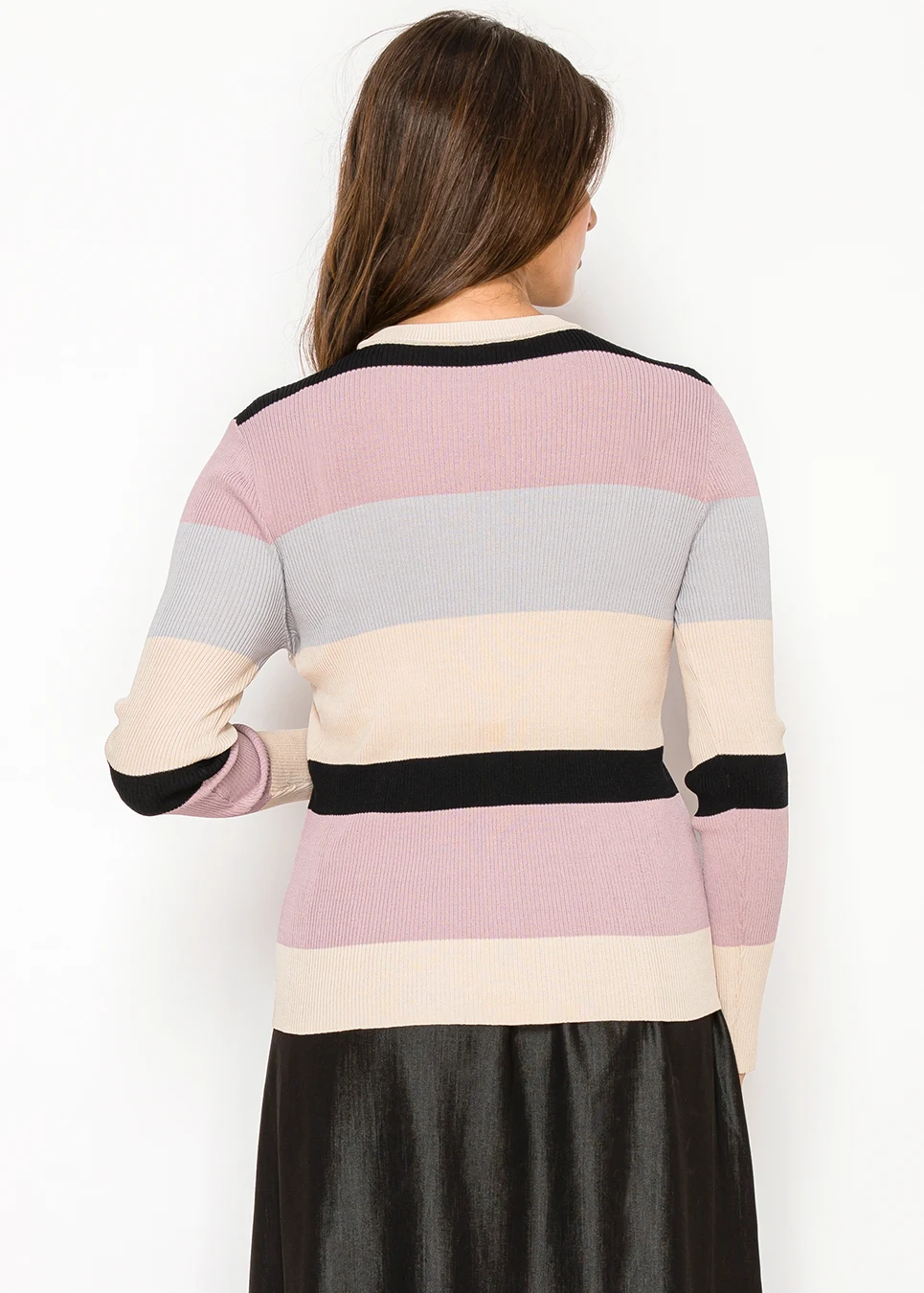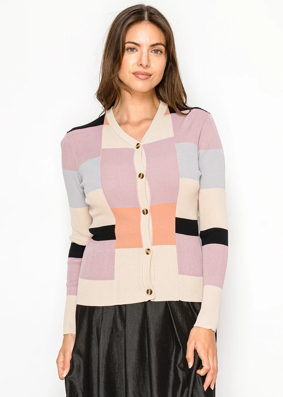 A cardigan that makes the color-blocking decision so you don't have to. Blush, grey, cream, coral, and black — all the right proportions, already sorted. Fitted ribbed construction, gold button front, V-neckline.