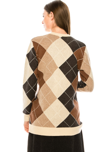 The neutral colors and classic cut of this cardigan make it fit for any woman. The geometric pattern will add to your style, and warm knitwear will take care of comfort.