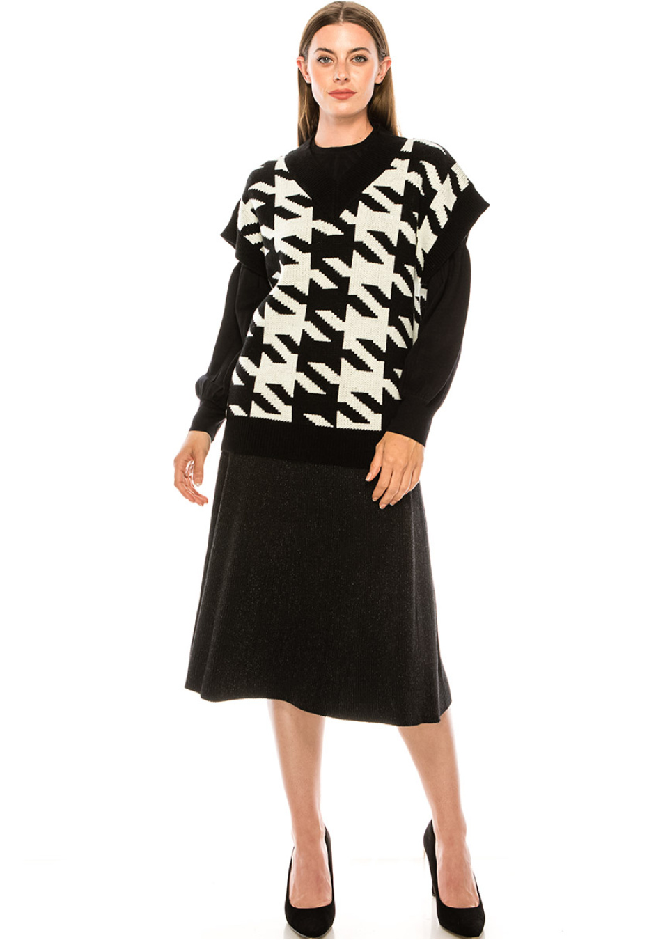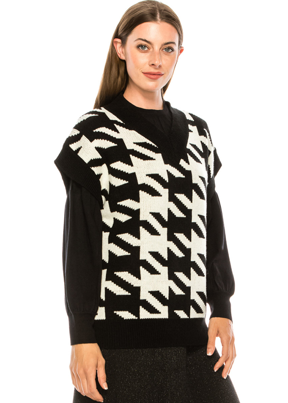 Fashionable print, dense wool-based fabric and elegant V-neck cut are ideal components for an everyday vest in the cold season. A bit oversized cut makes it a perfect fit for layered looks.