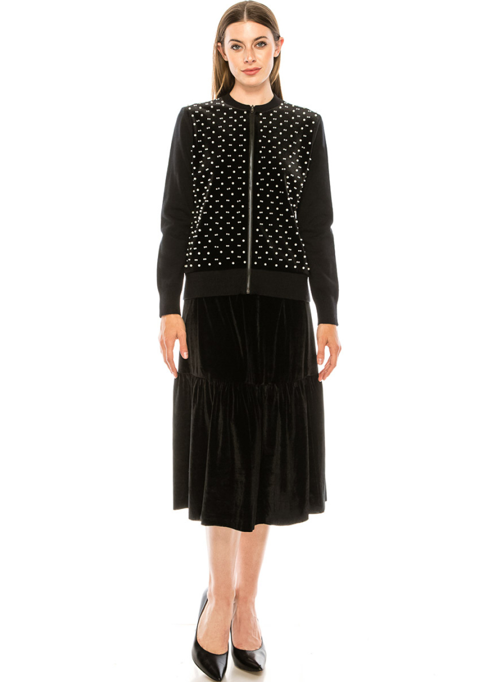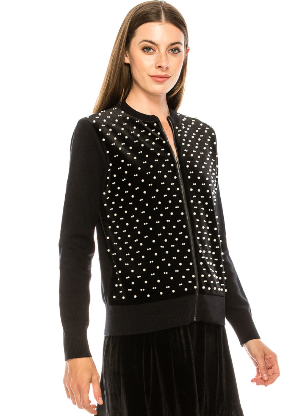 Do you want to make your everyday outfits chic and still feel comfy? Just wear this cardigan over your casual clothes. Classic cut, velvet’s rich texture and pearls have the power to effortlessly enhance your elegance.