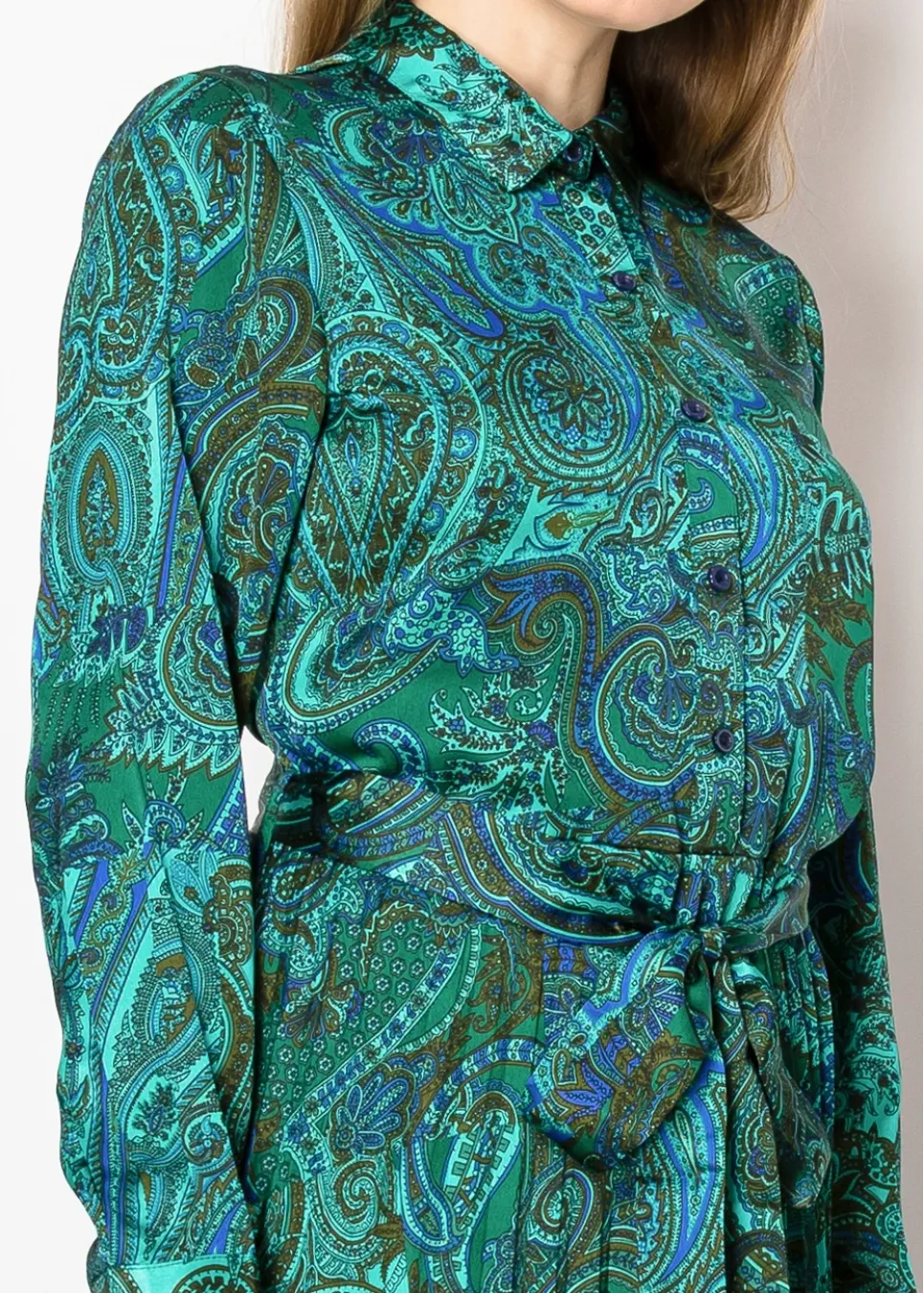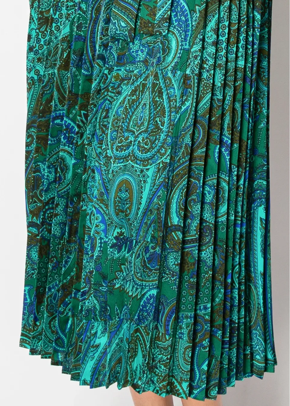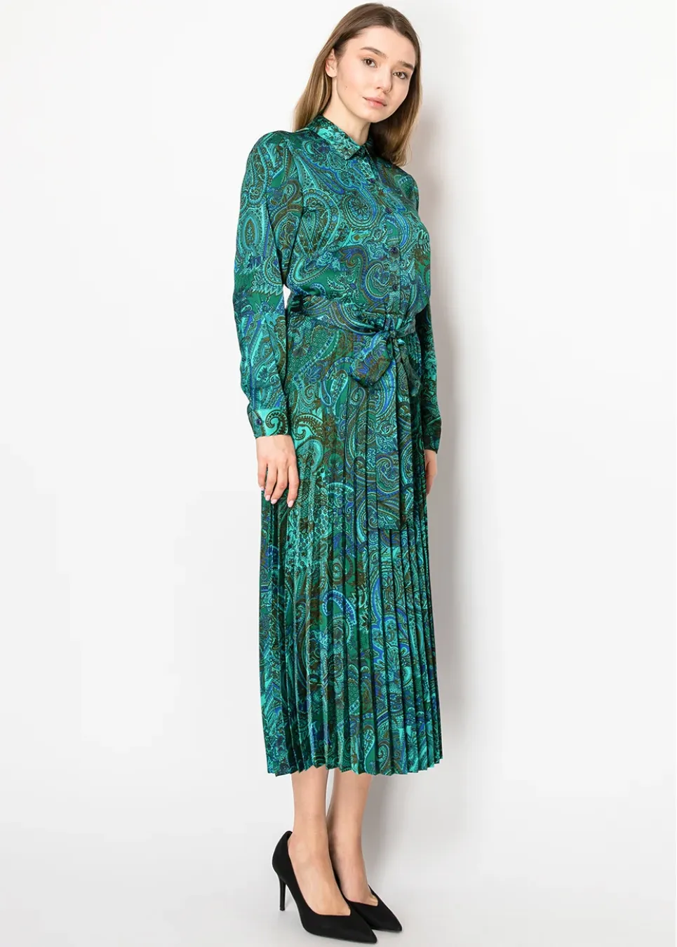With its lush green and blue paisley print, this dress is a fresh take on timeless modest fashion. The pleated skirt creates a flattering flow, and the tie-waist detail brings it all together with ease.