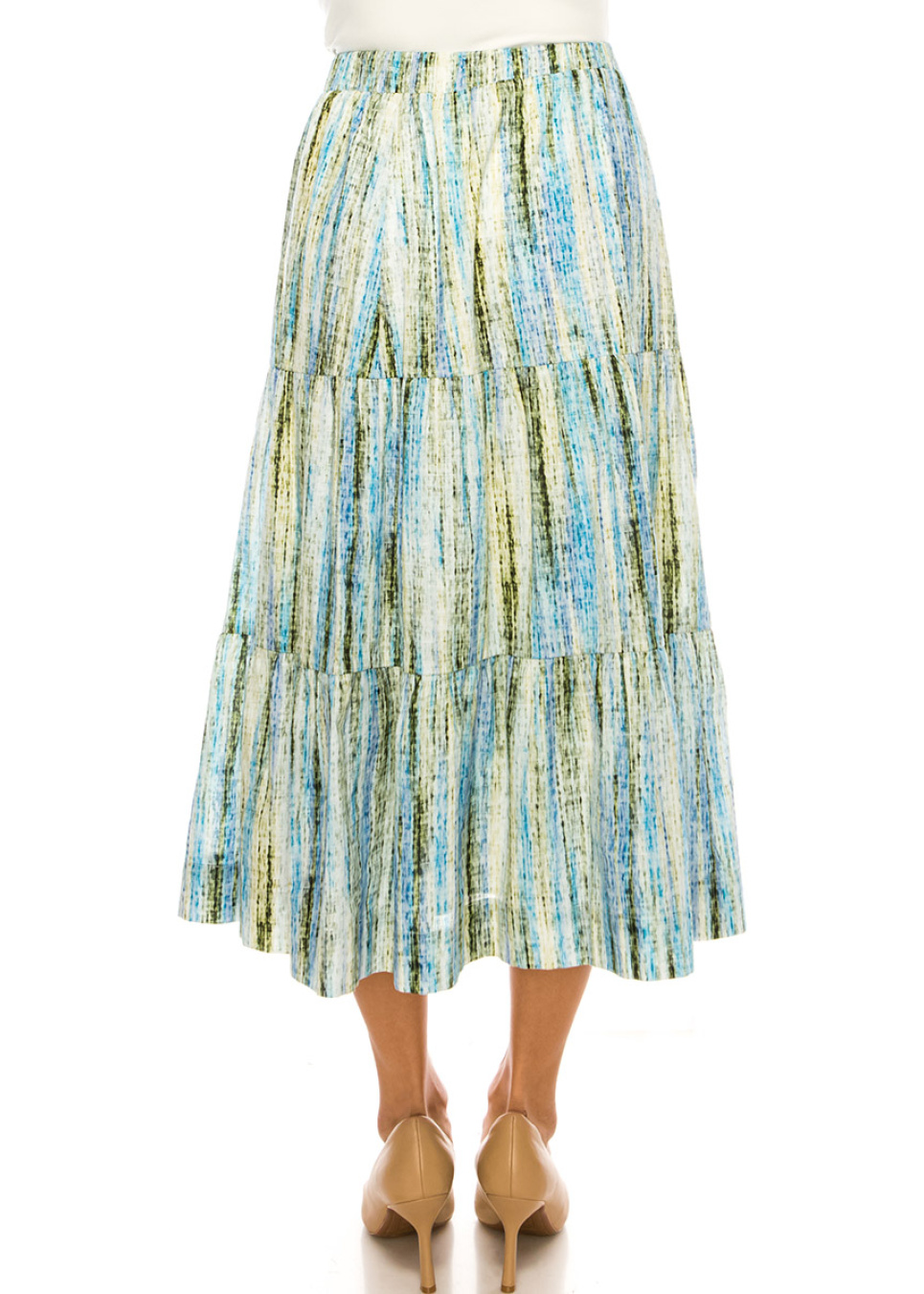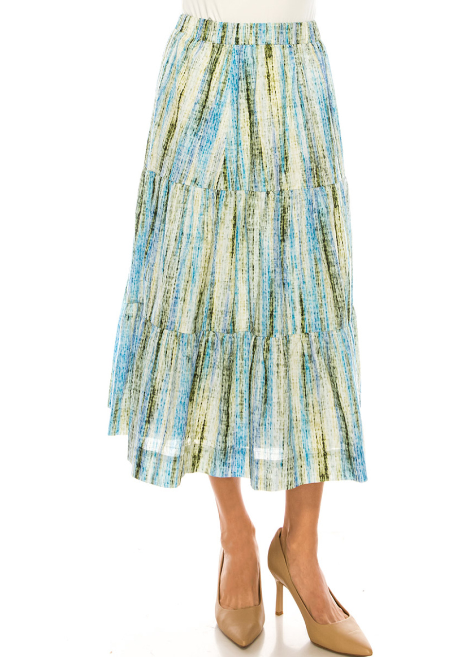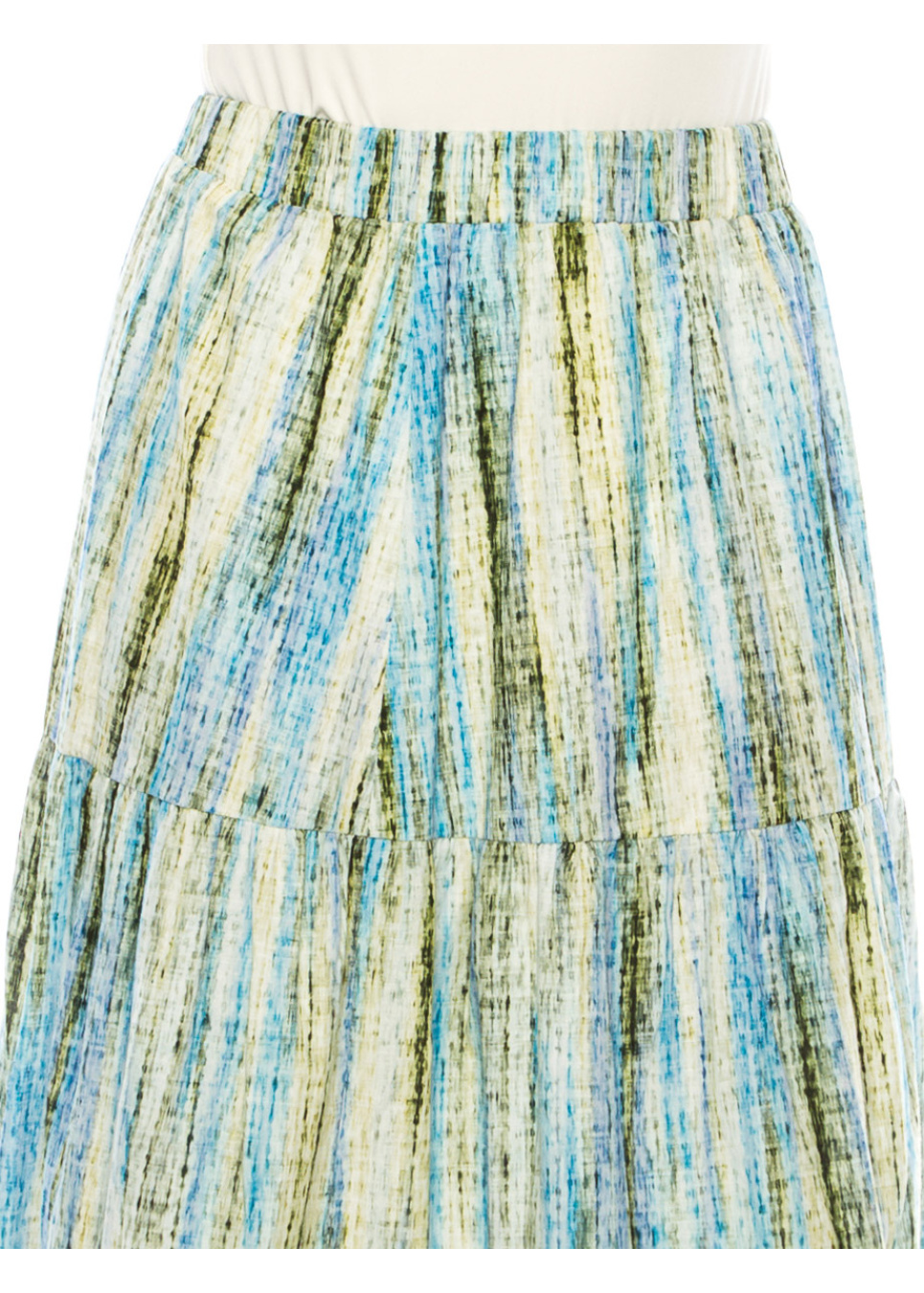 Bring some color to your wardrobe with this stunning midi skirt. The vertical stripes in shades of green and blue add a touch of sophistication, while the tiered design creates a flowy silhouette. The linen blend fabric ensures comfort and durability, making it perfect for any occasion.
