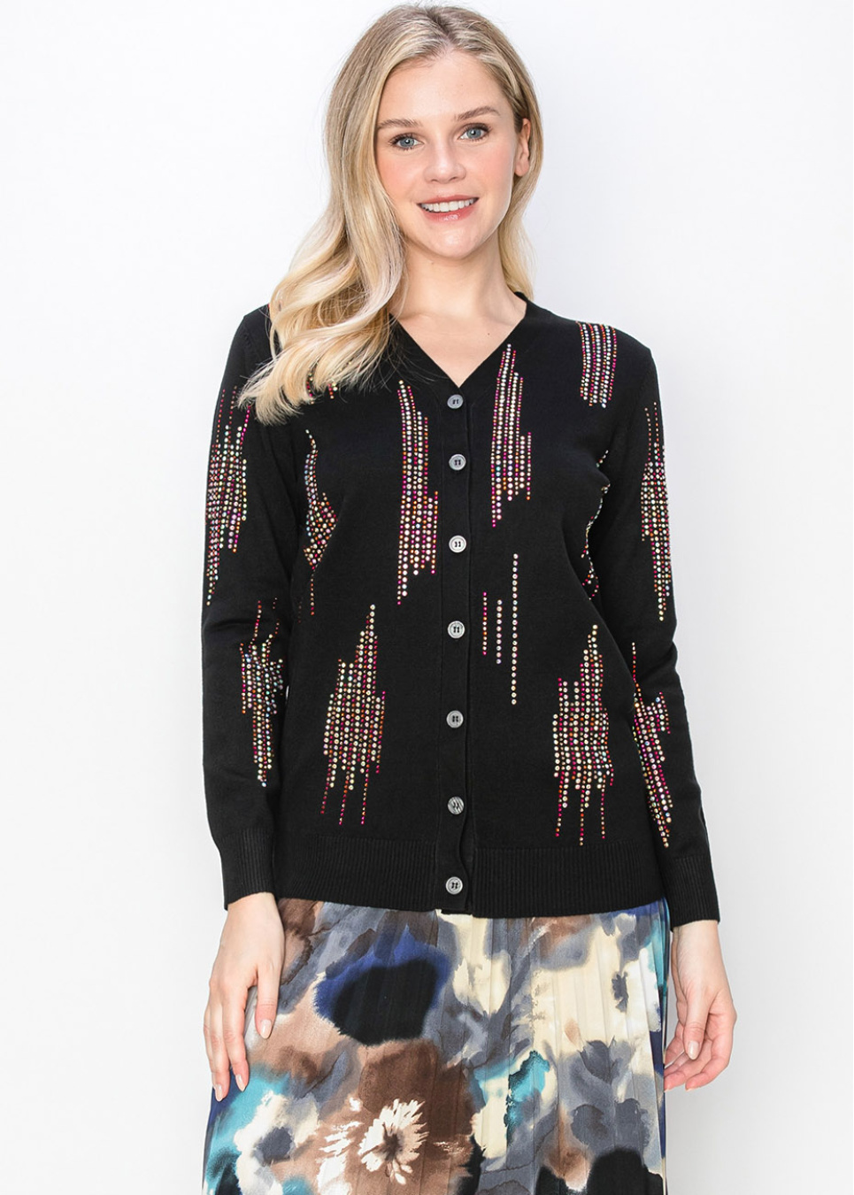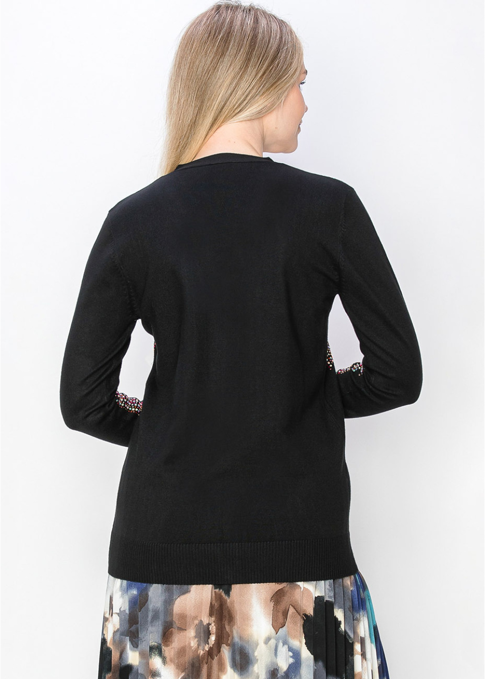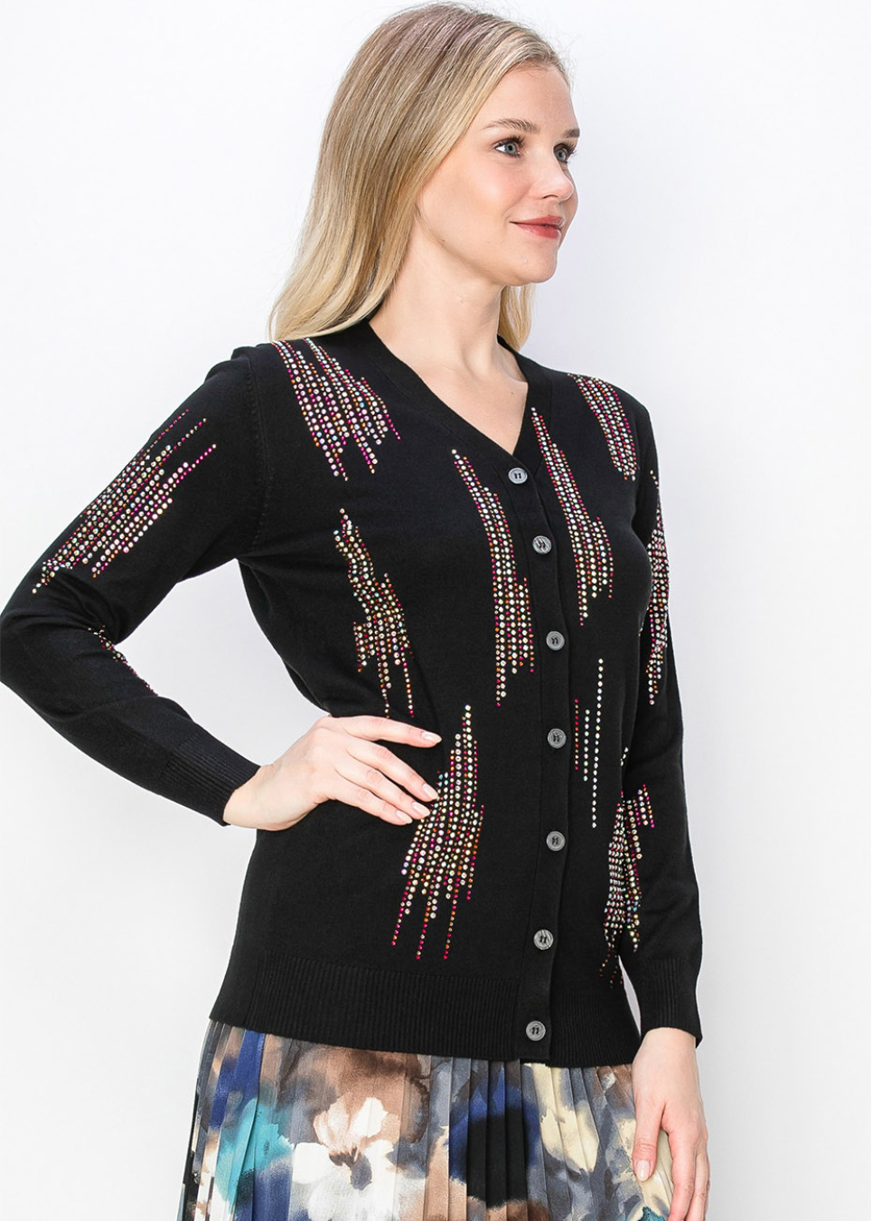 The Vibrant Accent Button-Up Cardigan adds just the right touch of fun. The colorful bead accents give this sleek black cardigan a playful vibe, making it perfect for when you want to stand out without being too flashy. Pair it with your favorite skirt for an effortlessly stylish look.