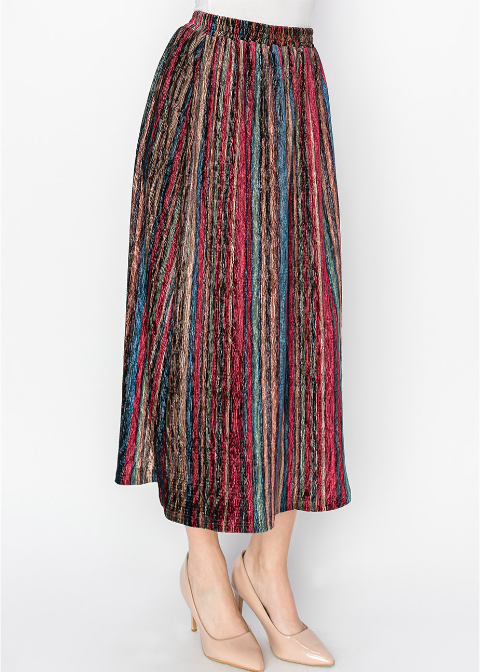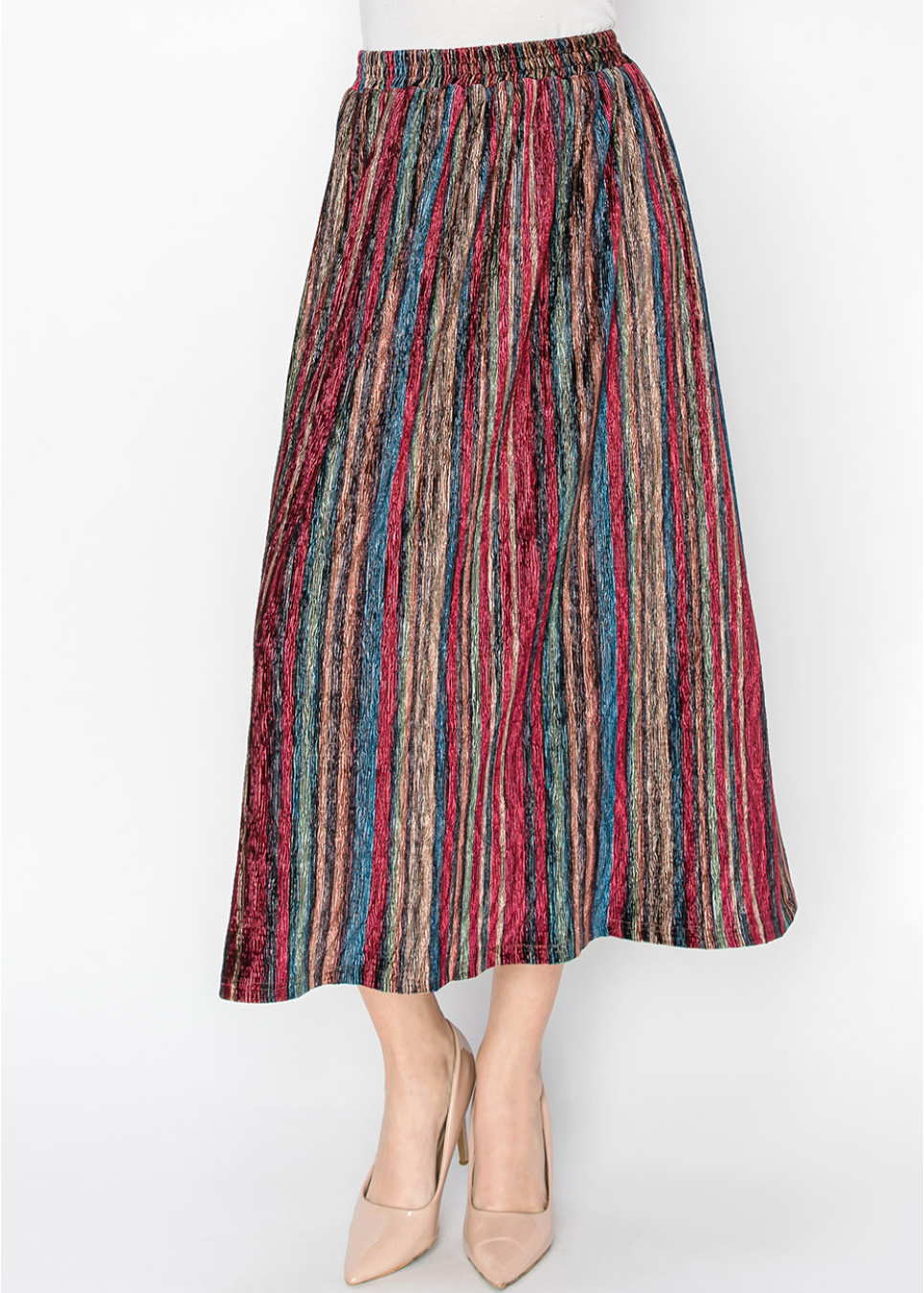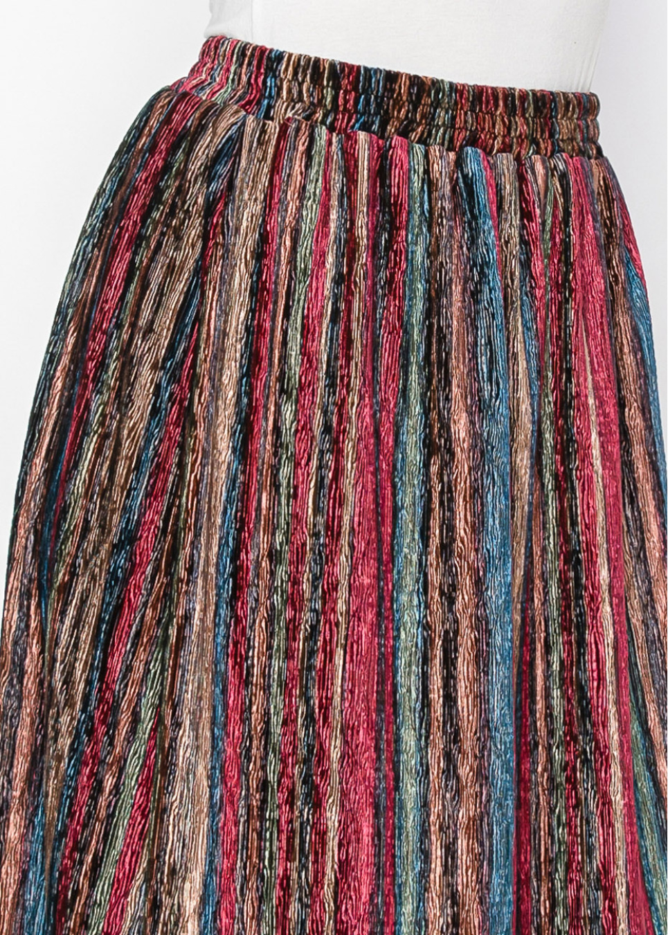 With its vibrant stripes and crinkled texture, this skirt is designed to make a statement. The A-line fit ensures a modest, flowing silhouette, and the elastic waistband adds comfort without compromising style. A unique and lively addition to any modest wardrobe.
