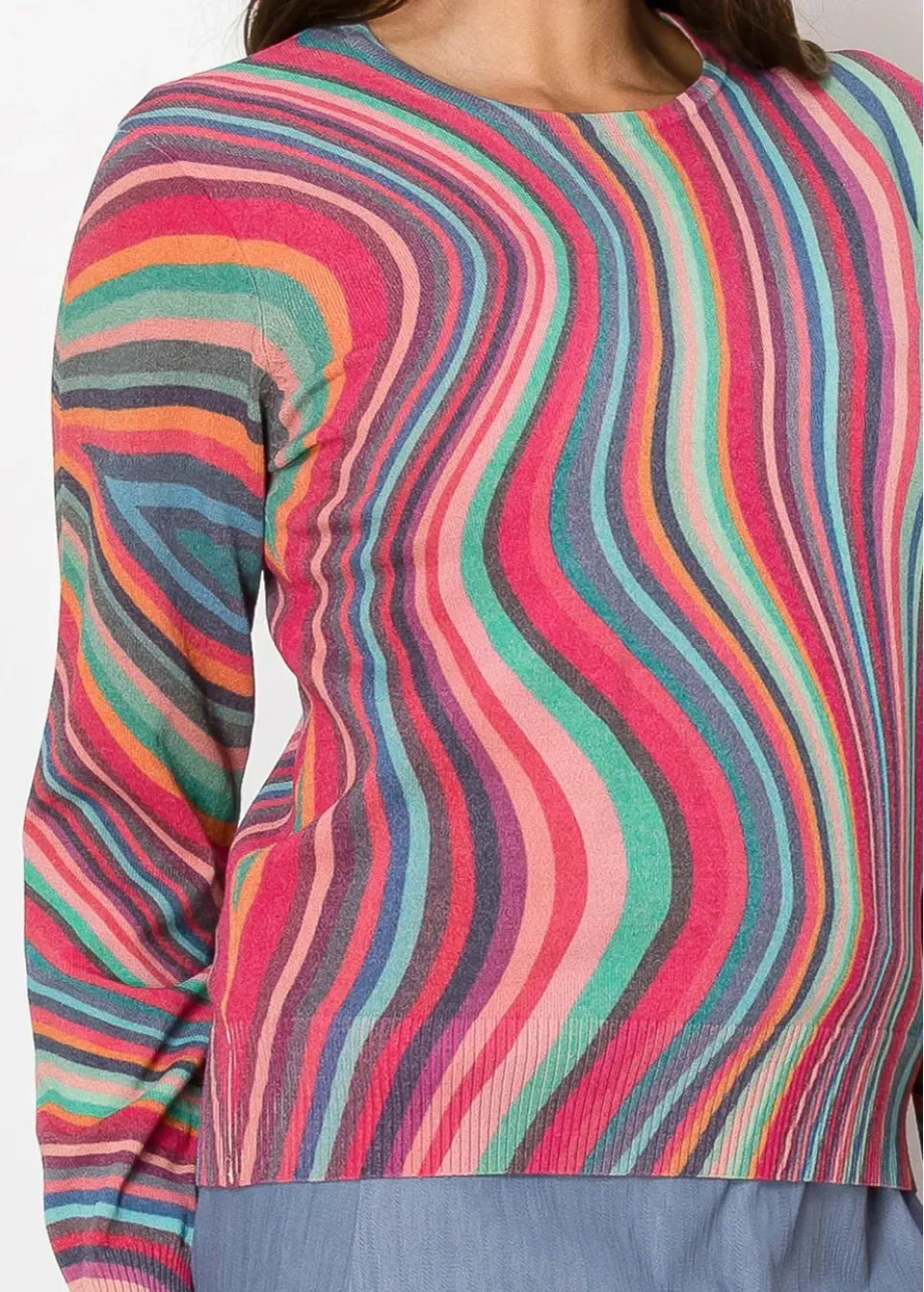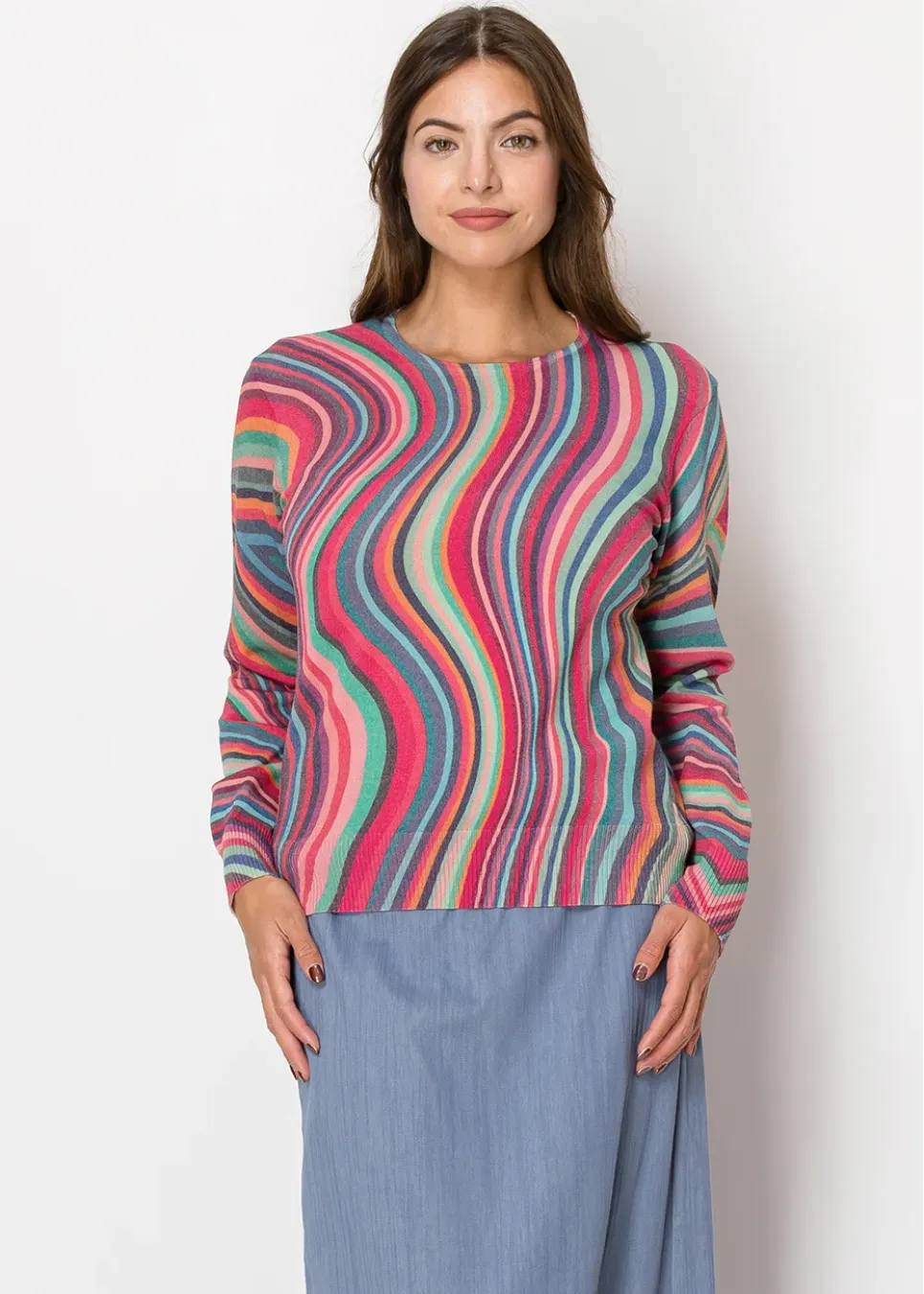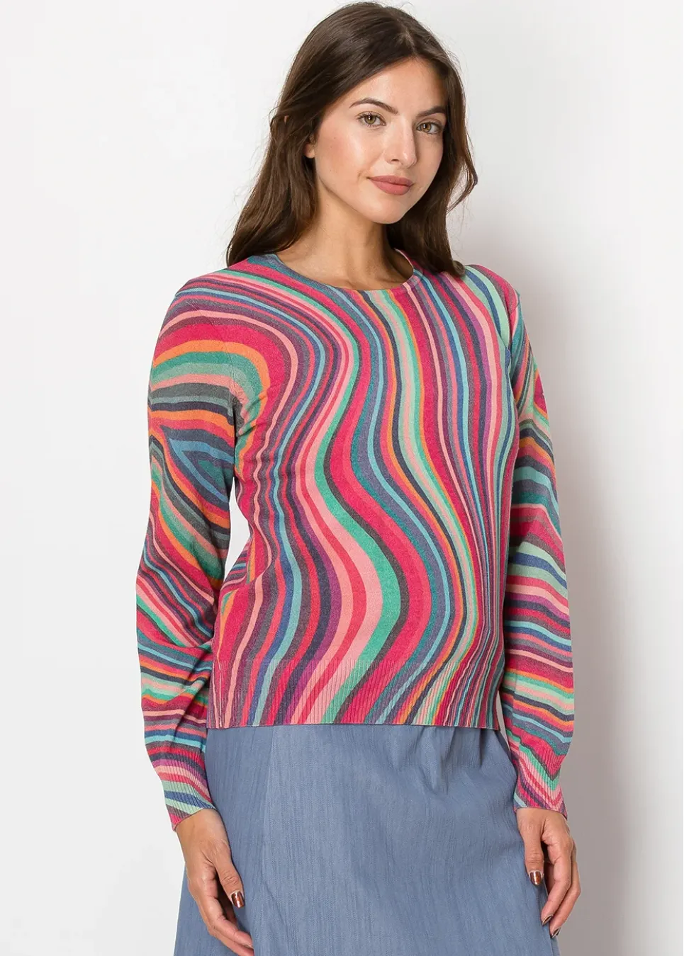 Bring energy to your wardrobe with this ripple-patterned sweater. The mix of bright hues and soft fabric makes it an easy choice for casual days when you want to stand out.